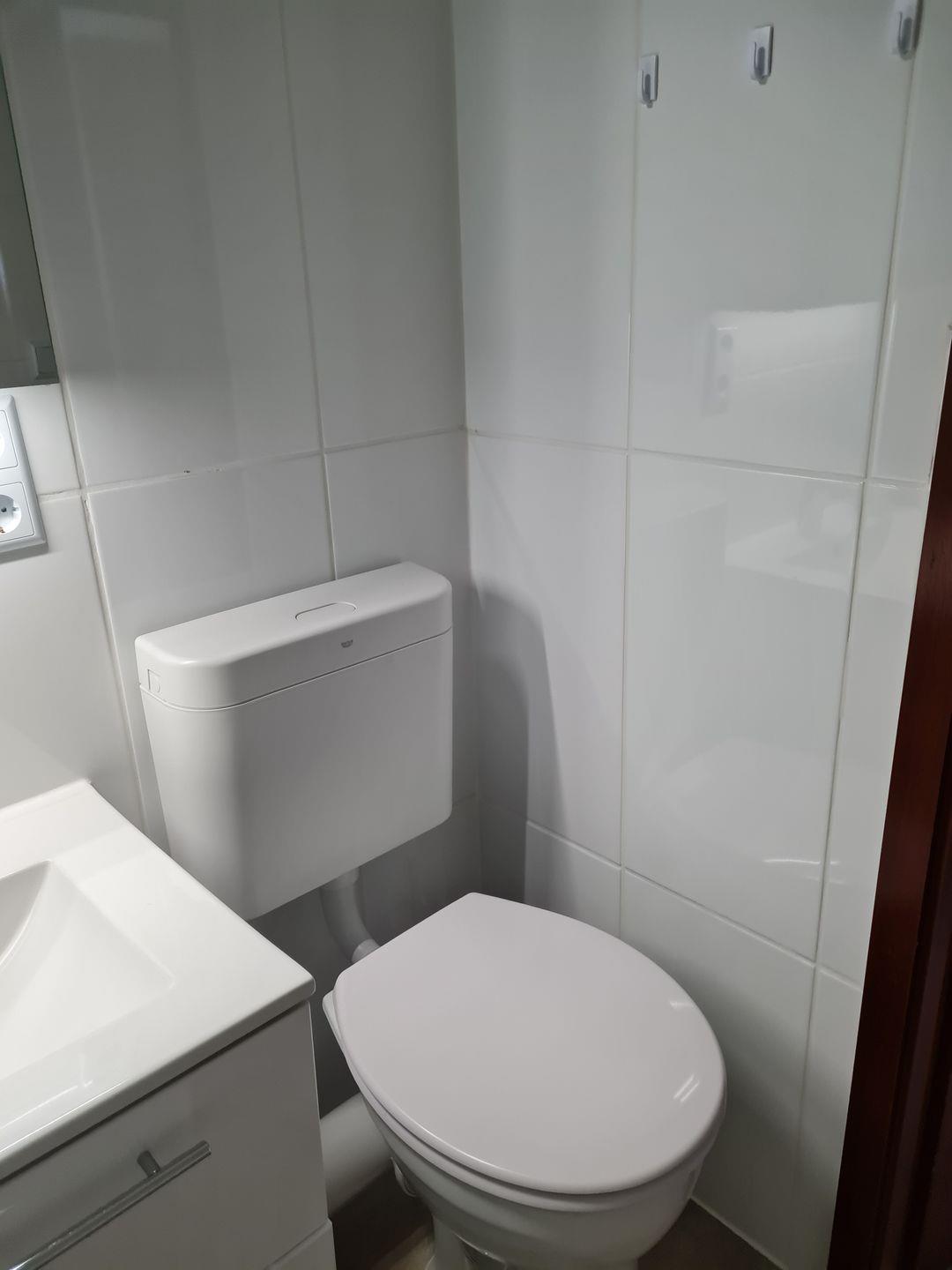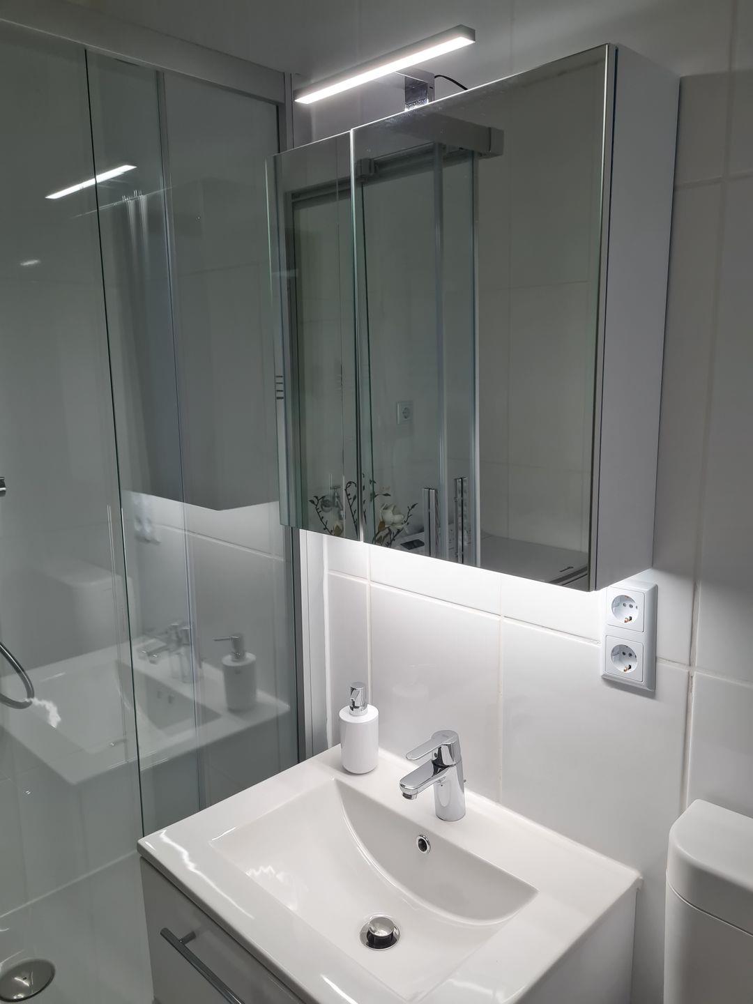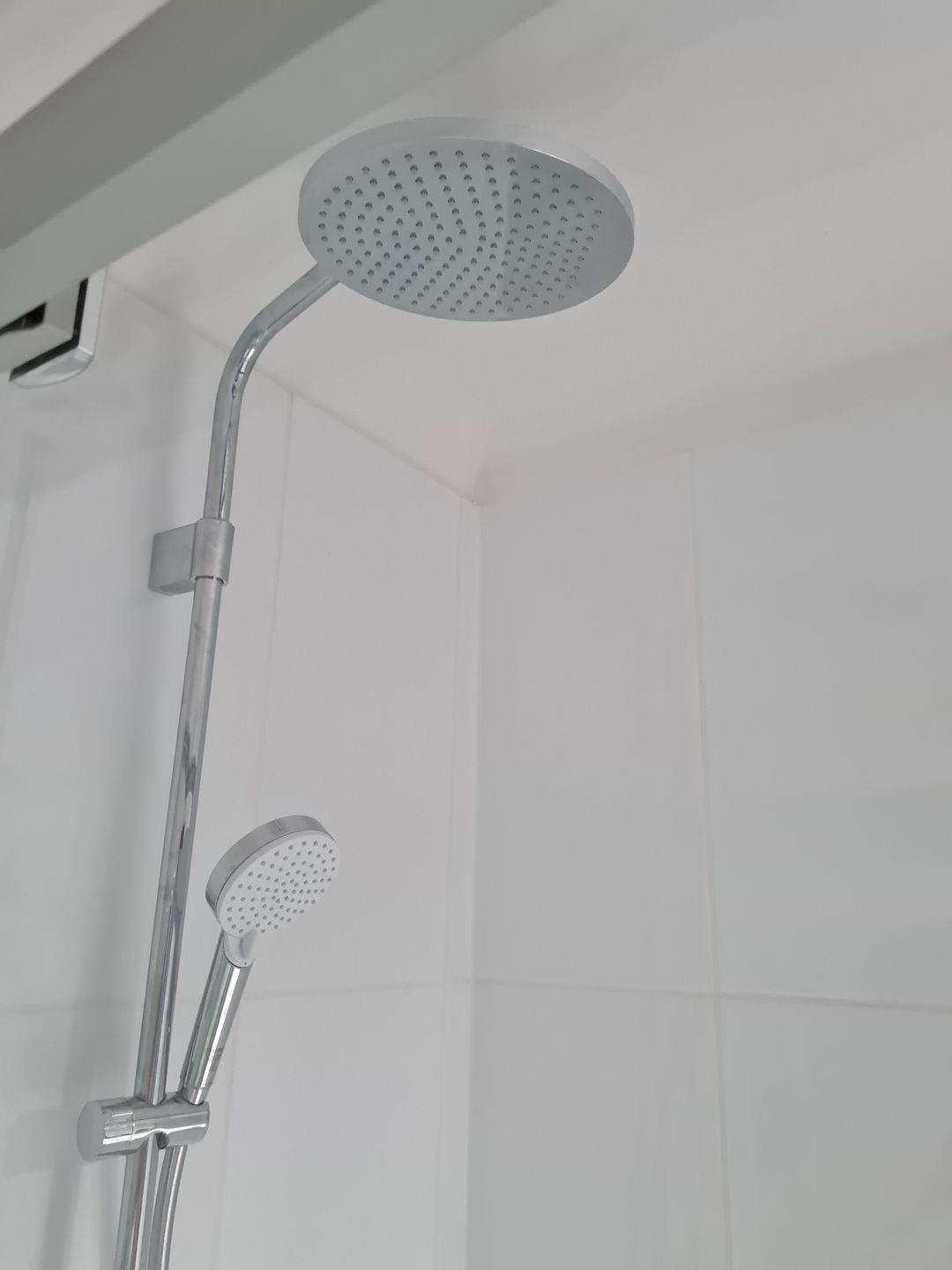 Das Bad hat neben der bodengleichen Dusche auch einen Handtuchwärmer, ein WC, einen Spiegel und ein Waschbecken. Im Bad befindet sich zusätzlich eine Waschmaschine.