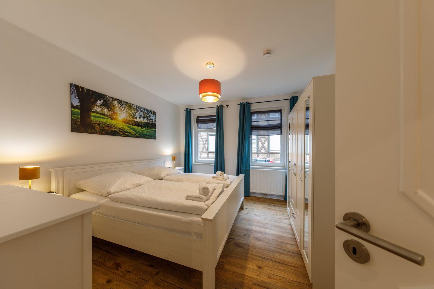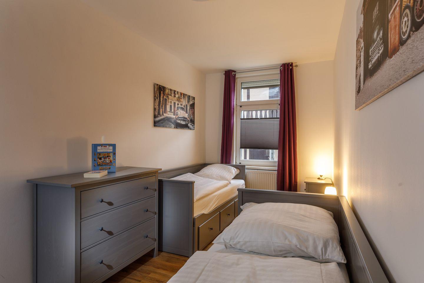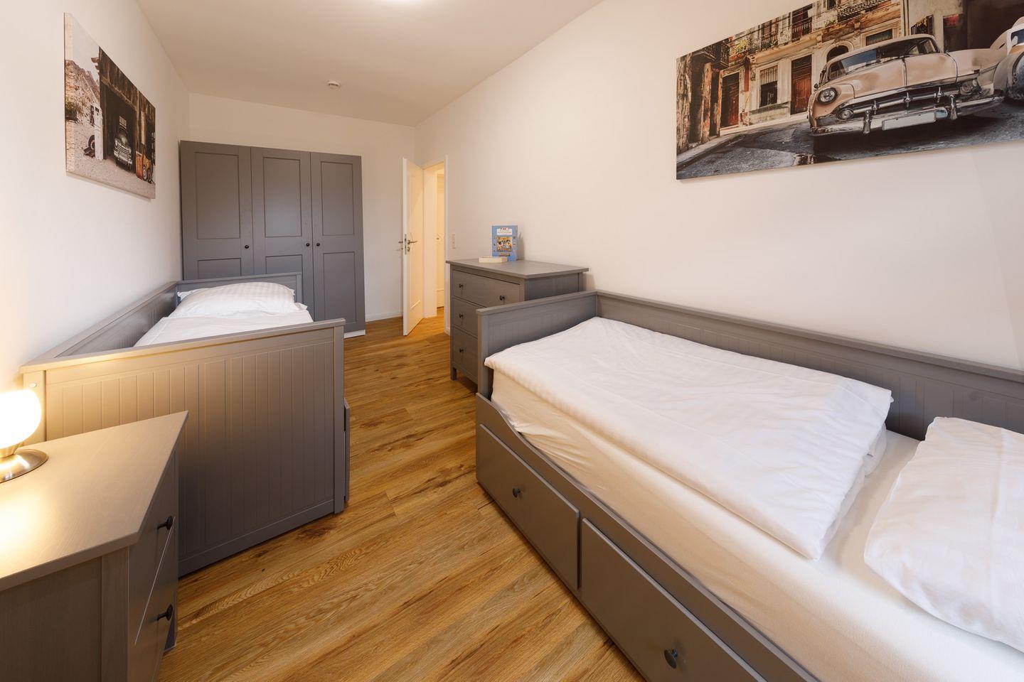 Diese Ferienwohnung bietet Platz für maximal 6 Gäste. Sie verfügt über ein Schlafzimmer mit Doppelbett, großem Kleiderschrank und einer Kommode. Das zweite Schlafzimmer verfügt über zwei Tagesbetten. Diese Betten können bei Bedarf ausgezogen werden, um so insgesamt 4 Personen Platz zu bieten. Dieses Schlafzimmer verfügt über einen Kleiderschrank und eine Kommode.