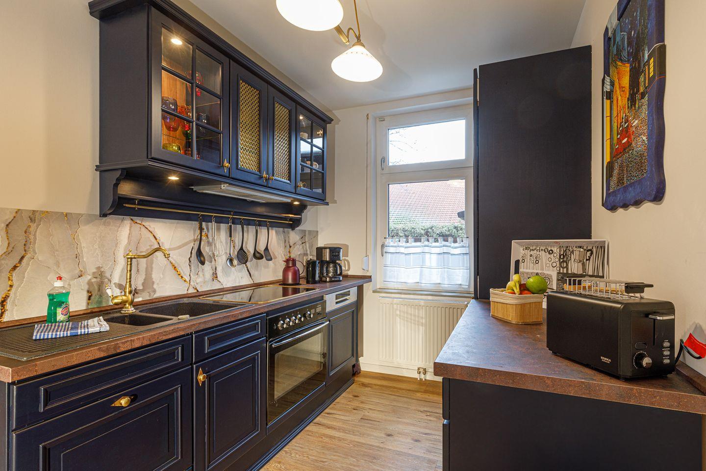 In der voll ausgestatteten, modernen Küche können leckere Mahlzeiten zubereitet werden. Sämtliche Elektrogeräte wie zum Beispiel Spülmaschine, Kaffeemaschine und Toaster sind selbstverständlich vorhanden.