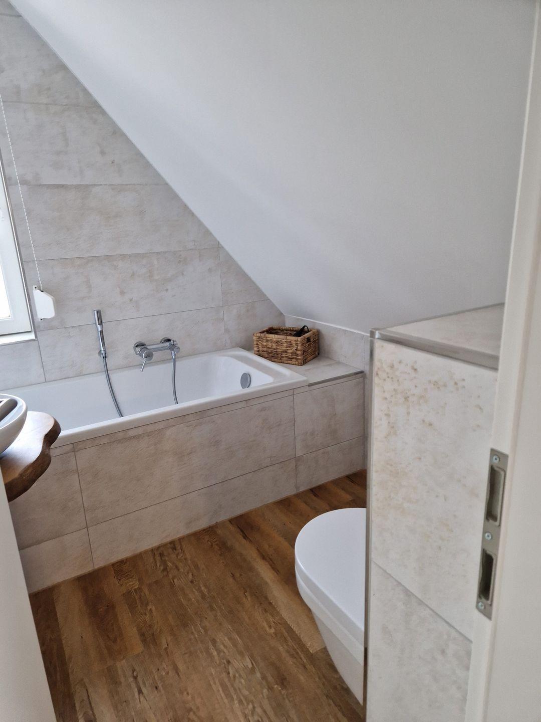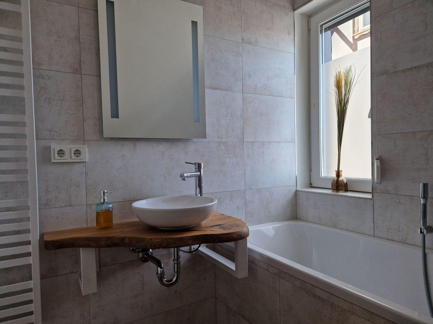 Das Tageslichtbad verfügt über eine Badewanne, eine Toilette und einen Waschtisch mit einem großen beleuchteten Spiegel