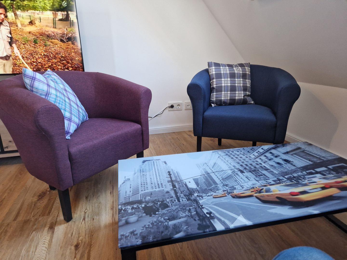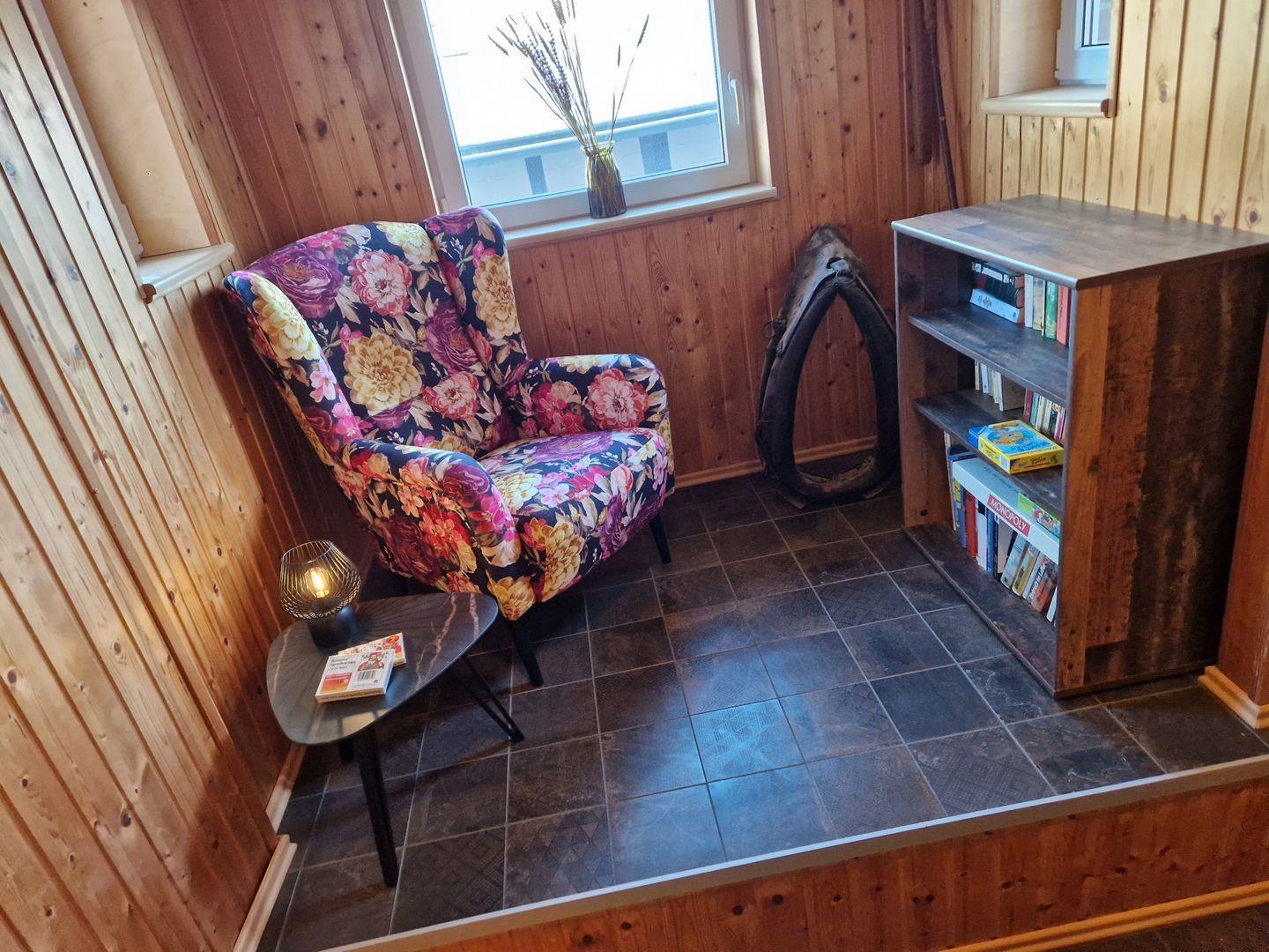 Ein Highlight des Ferienhauses ist unter anderem die sehr schöne Leseecke Ludwig Thoma im Zwischengeschoss des Treppenhauses, Dort steht ein gemütlicher Ohrensessel und ausreichend Lesestoff für all diejenigen, die sich mit einem guten Buch zurückziehen möchten.