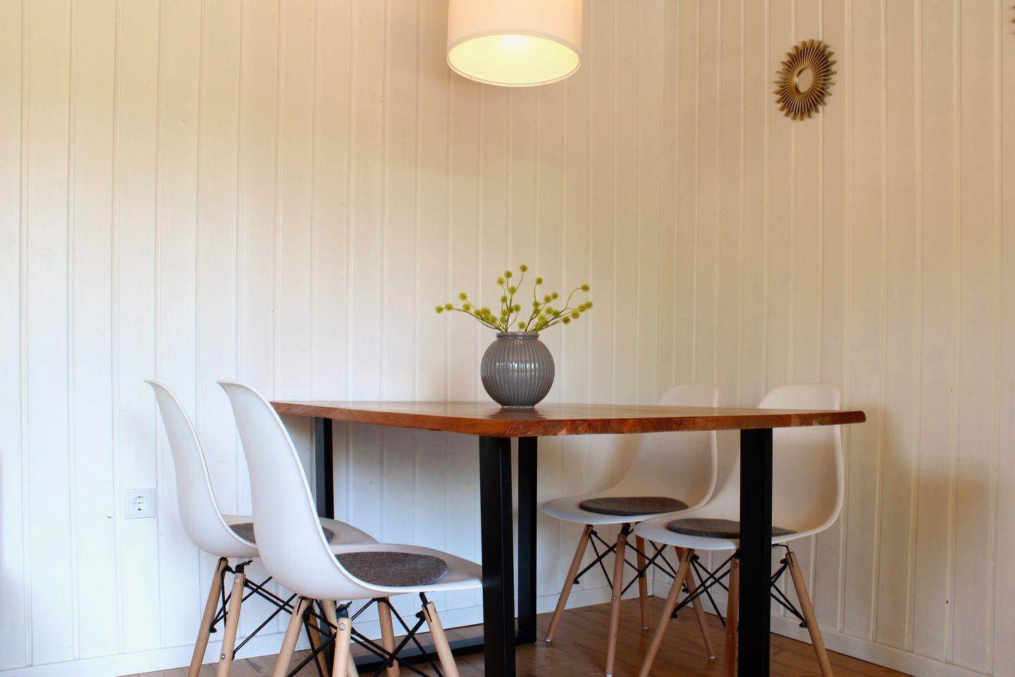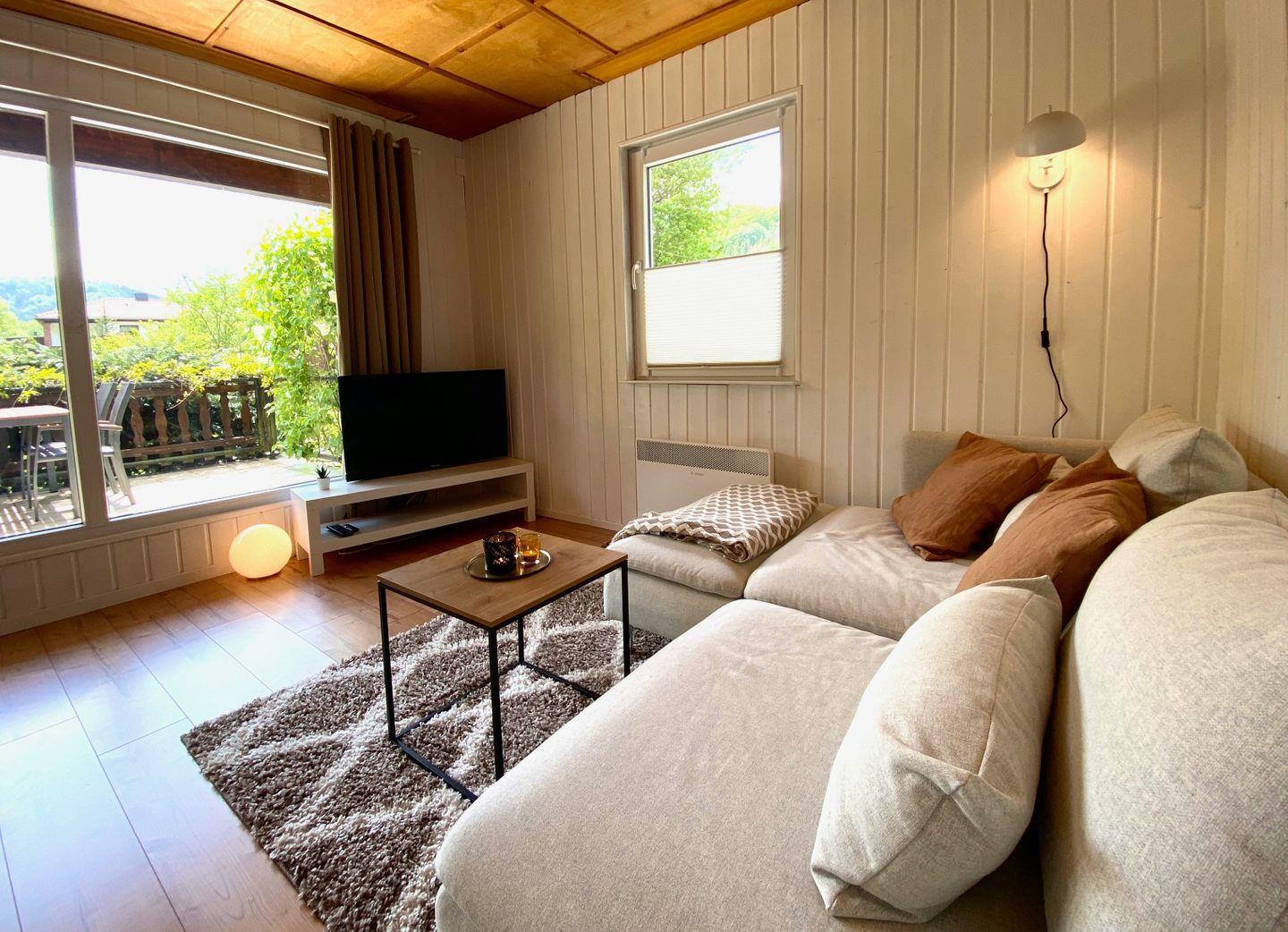 Nach einem ereignisreichen Tag laden der Kamin und das gemütliche Wohnzimmer zum Entspannen ein und auch die Küche ist mit einer Spülmaschine gut ausgestattet. An warmen Tagen kann die Aussicht ins Grüne auf der Terrasse oder im Garten genossen werden.