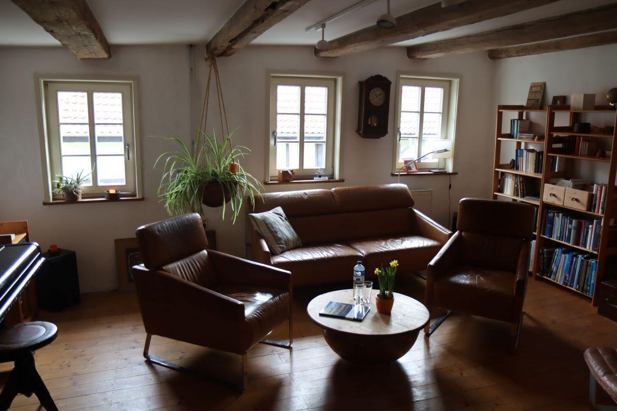 Über eine Echtholztreppe gelangen Sie in die obere Etage mit einem Wohnzimmer und einem Schlafzimmer für 2 Personen. Das Wohnzimmer verfügt über Ledersessel und Ledercouch sowie einen Flachbild-TV.