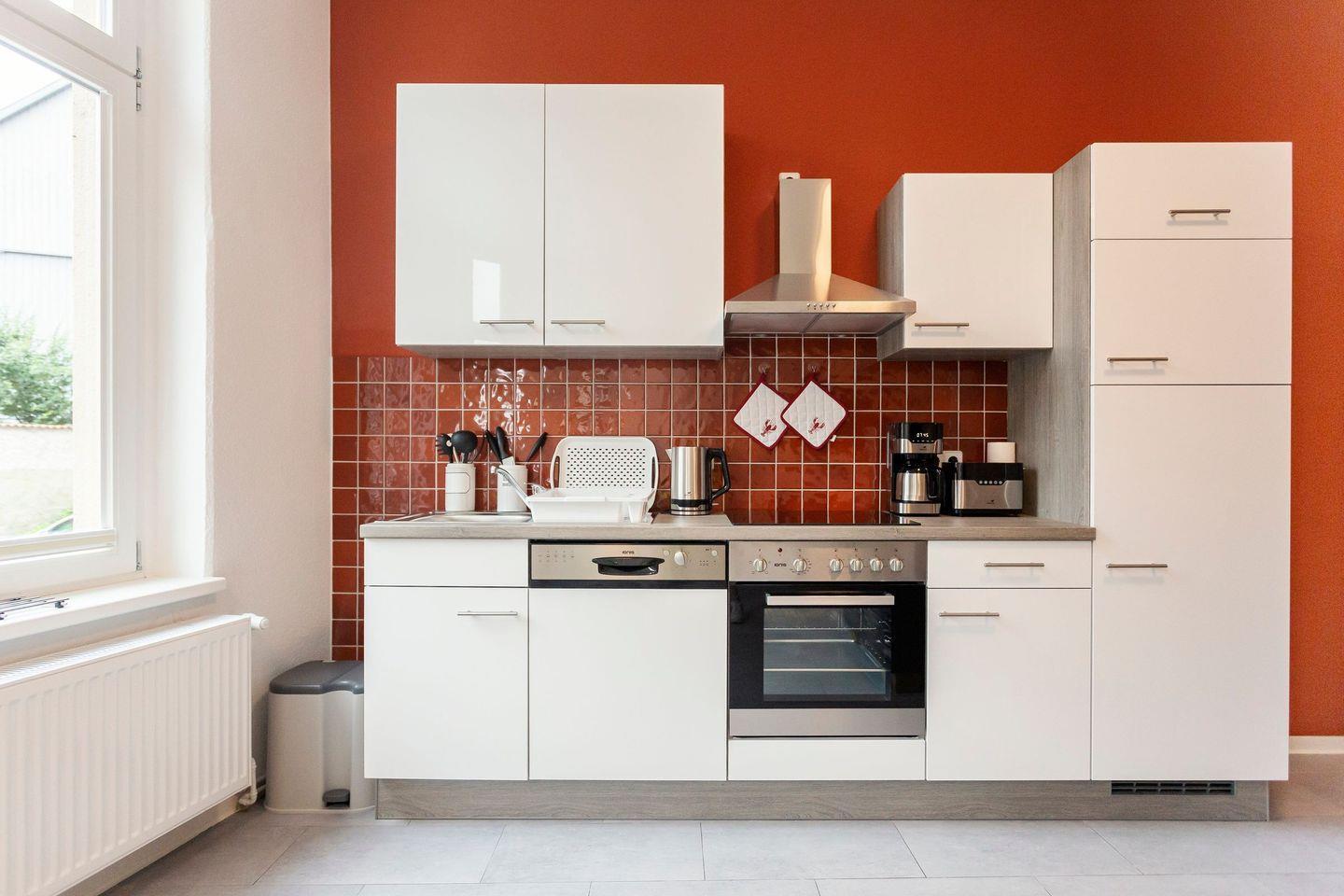 Wohnung 1: Die rote Ferienwohnung verfügt über ein Schlafzimmer, ein Wohnzimmer mit Schlafcouch und voll ausgestattete Küchenzeile.