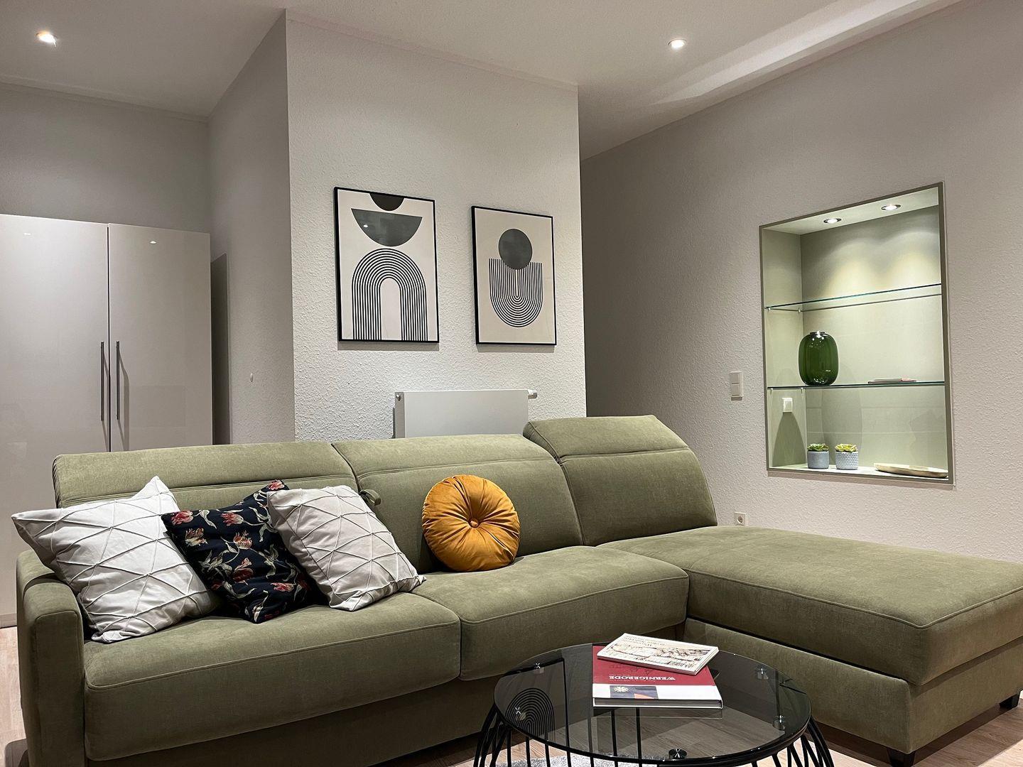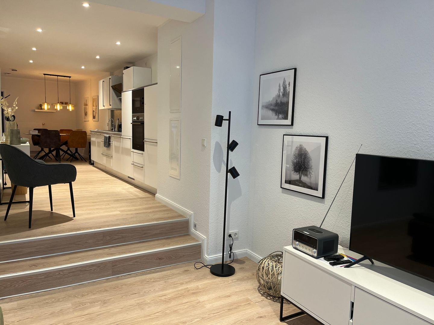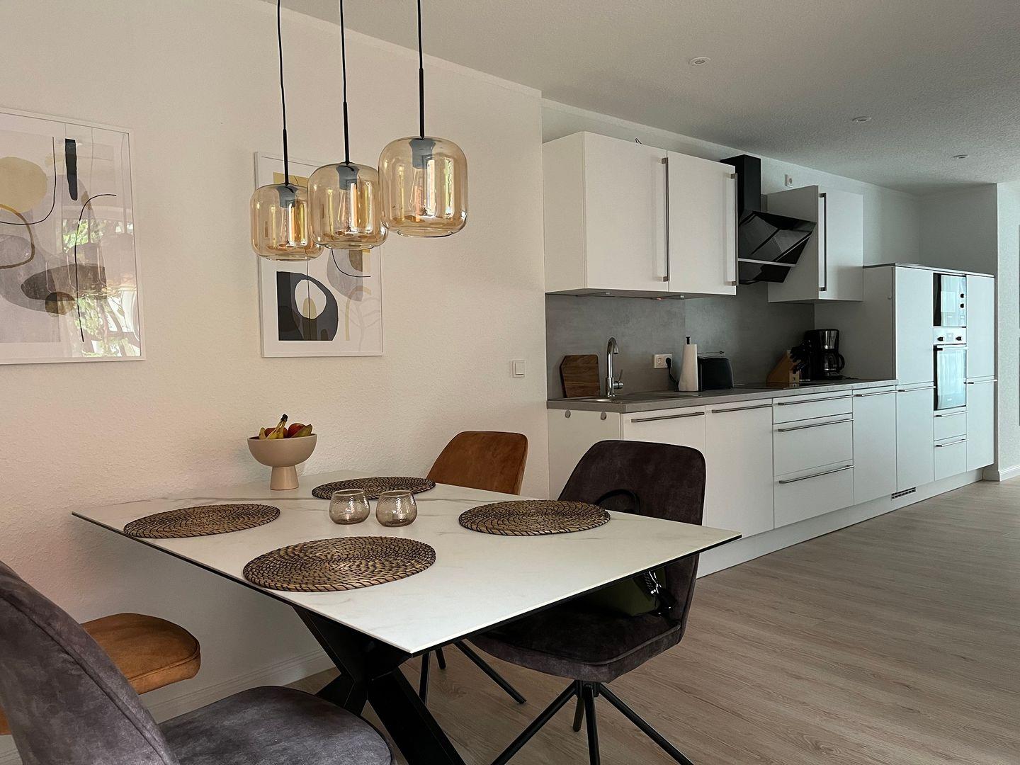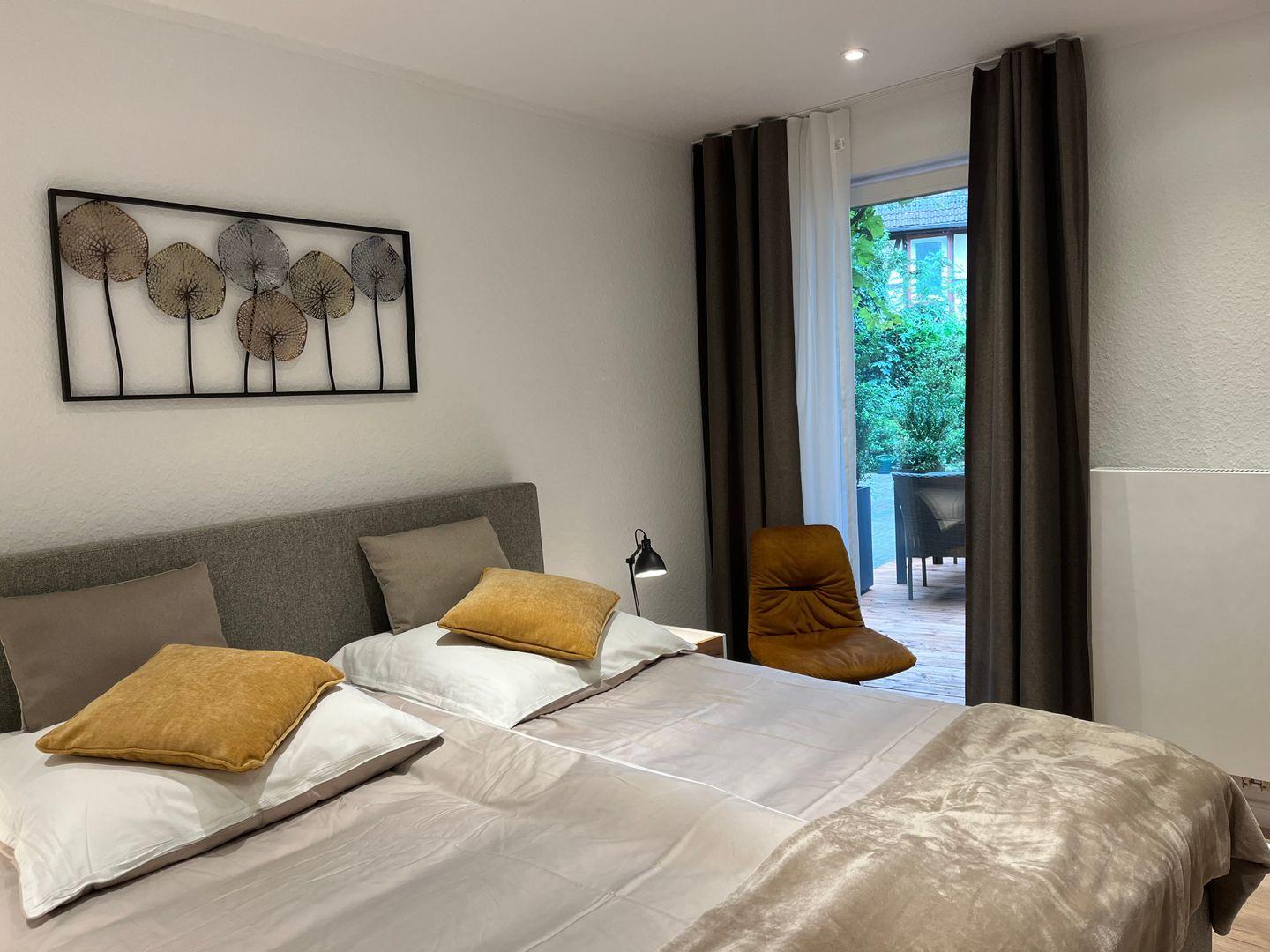Eine moderne geschmackvolle Einrichtung sorgt für eine angenehme Atmosphäre während Ihres Aufenthaltes. Das ruhige Schlafzimmer ist mit einem komfortablen Boxspringbett ausgestattet und das bequeme große Schlafsofa im geräumigen Wohnbereich bietet ebenfalls einen angenehmen Schlafkomfort für 2 weitere Personen. Das große Tageslichtbad ist u.a. mit einem Waschtrockner ausgestattet. Der offene Küchen- und Essbereich lässt keine Wünsche offen und bietet viel Platz zum gemeinsamen Kochen und Genießen. Direkt an den Essbereich schließt sich eine großzügig bemessene Terrasse im grünen Innenhof an. Auch vom Schlafzimmer aus gibt es einen direkten Zugang zur Terrasse.