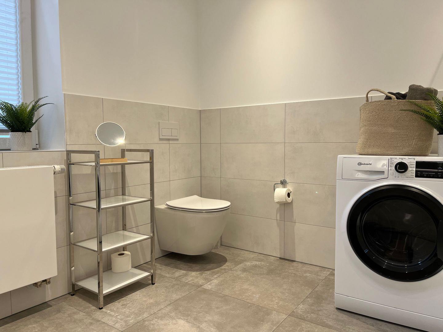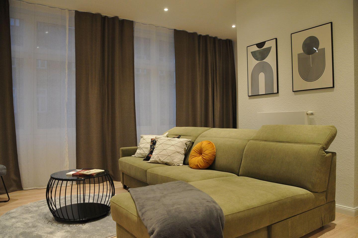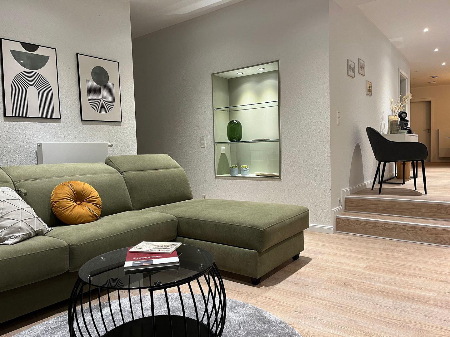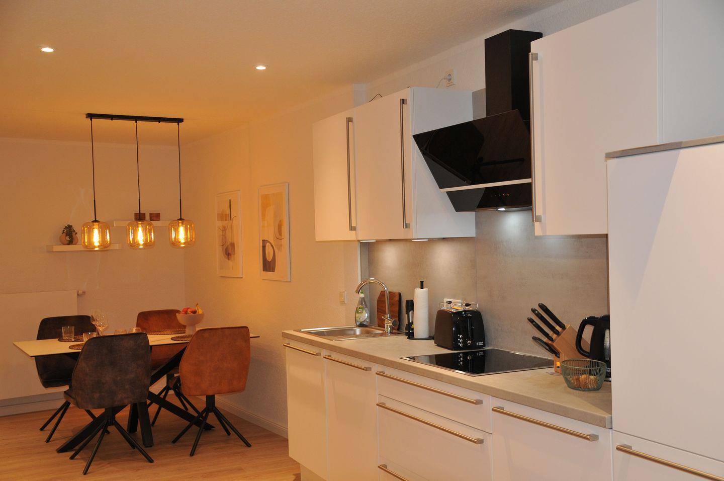 Eine moderne geschmackvolle Einrichtung sorgt für eine angenehme Atmosphäre während Ihres Aufenthaltes. Das ruhige Schlafzimmer ist mit einem komfortablen Boxspringbett ausgestattet und das bequeme große Schlafsofa im geräumigen Wohnbereich bietet ebenfalls einen angenehmen Schlafkomfort für 2 weitere Personen. Das große Tageslichtbad ist u.a. mit einem Waschtrockner ausgestattet. Der offene Küchen- und Essbereich lässt keine Wünsche offen und bietet viel Platz zum gemeinsamen Kochen und Genießen. Direkt an den Essbereich schließt sich eine großzügig bemessene Terrasse im grünen Innenhof an. Auch vom Schlafzimmer aus gibt es einen direkten Zugang zur Terrasse.