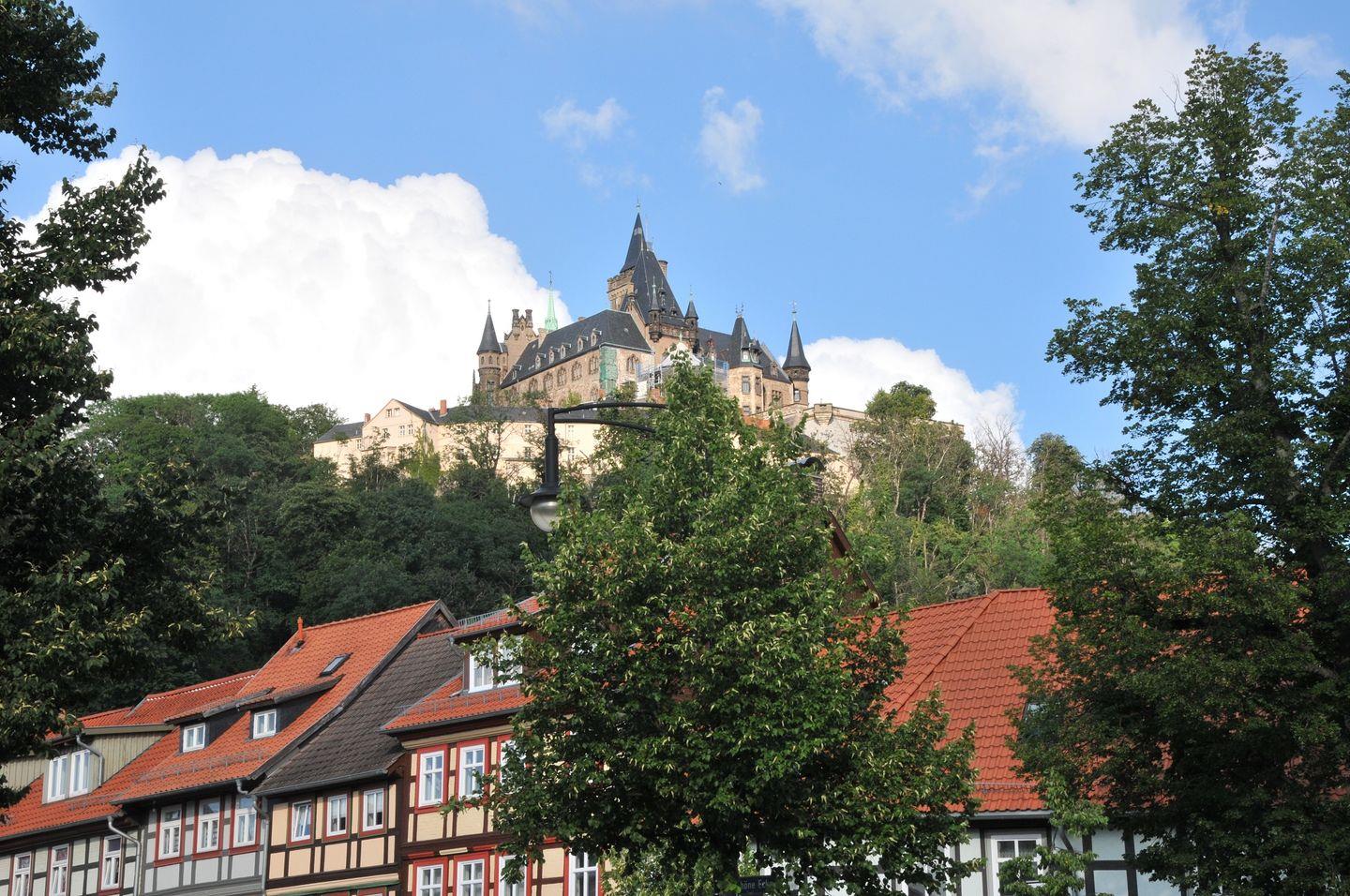 Zwei kostenlose Parkplätze mit Zugang zur Wohnung über den Innenhof stehen direkt auf unserem Grundstück zur Verfügung. Von hier aus haben Sie einen schönen Blick auf das nahe gelegene Wernigeröder Schloss.