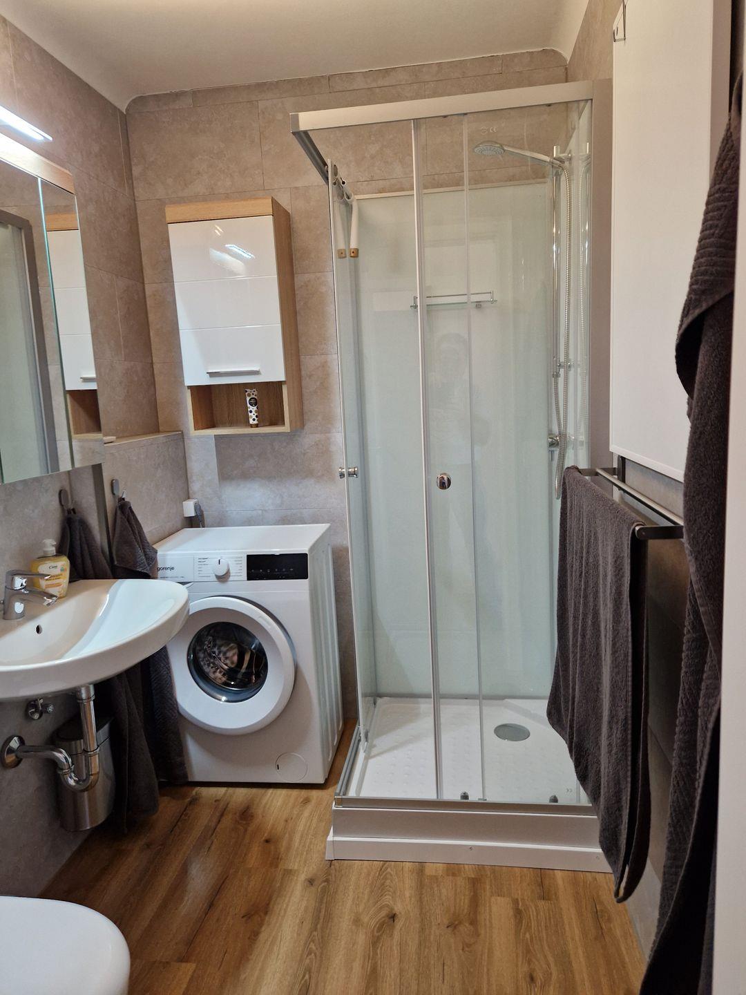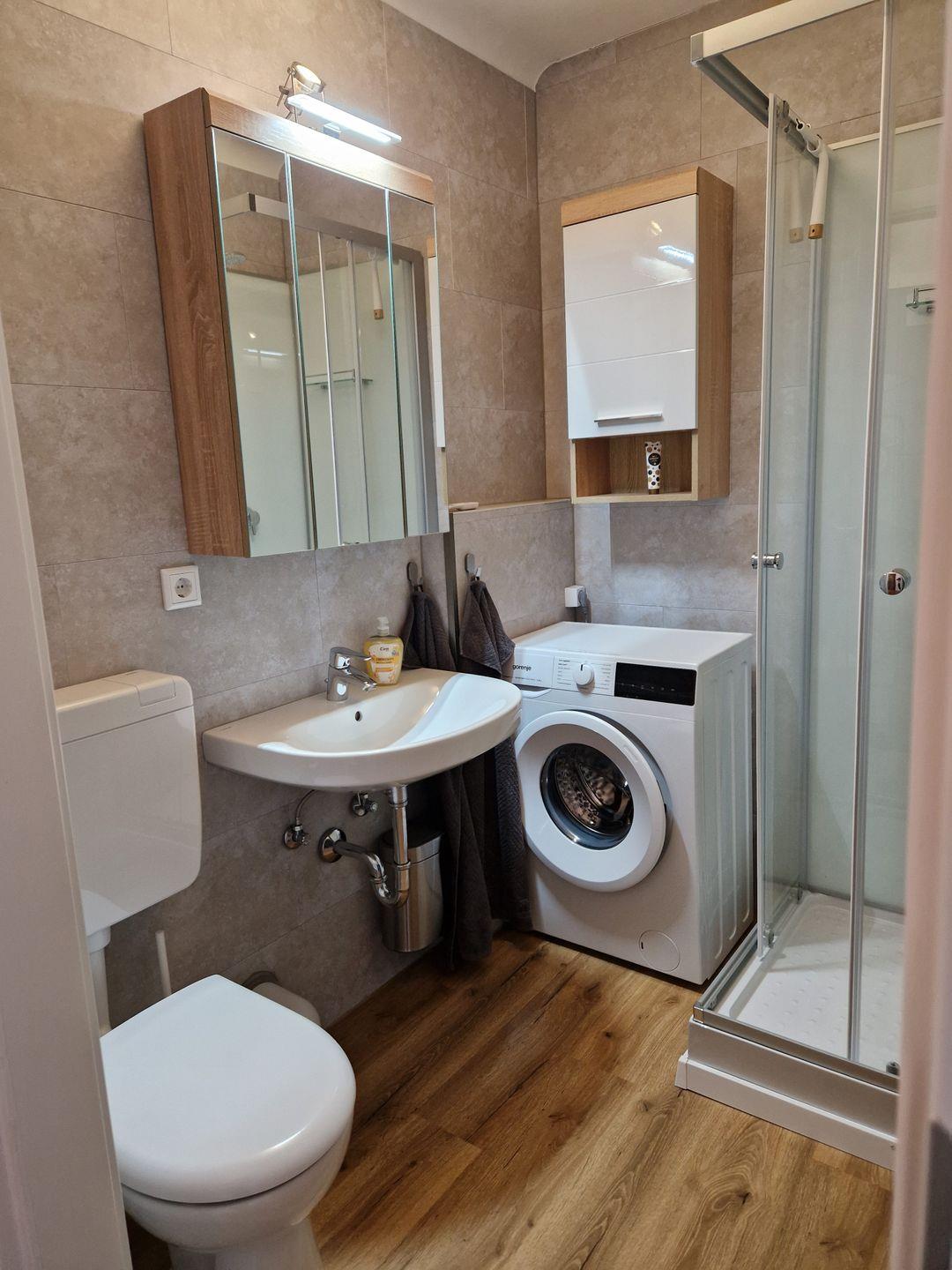 Das Bad hat neben der modernen Dusche auch ein WC, einen Spiegelschrank und ein Waschbecken. Im Bad befindet sich zusätzlich eine Waschmaschine.