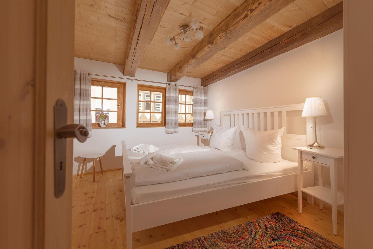 Im nächsten Stockwerk befindet sich ein Schlafzimmer mit Doppelbett und Kleiderschrank.