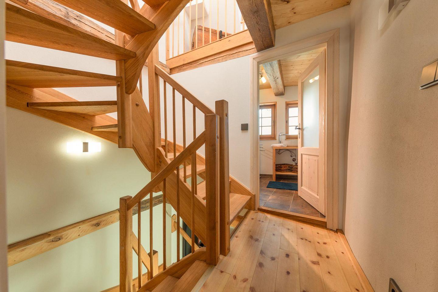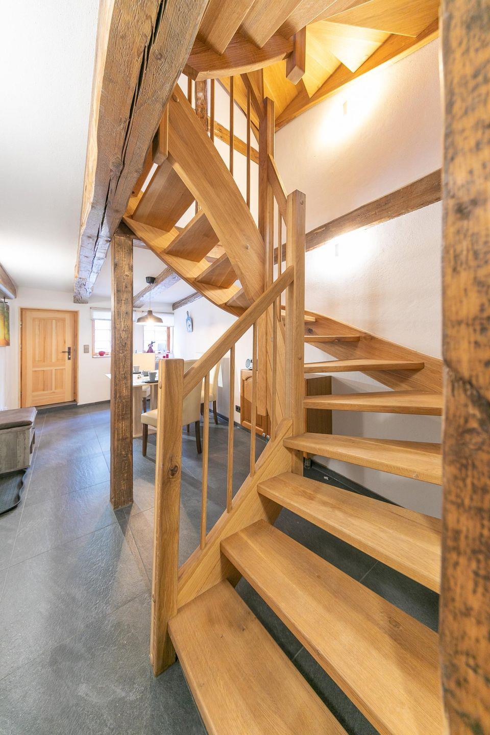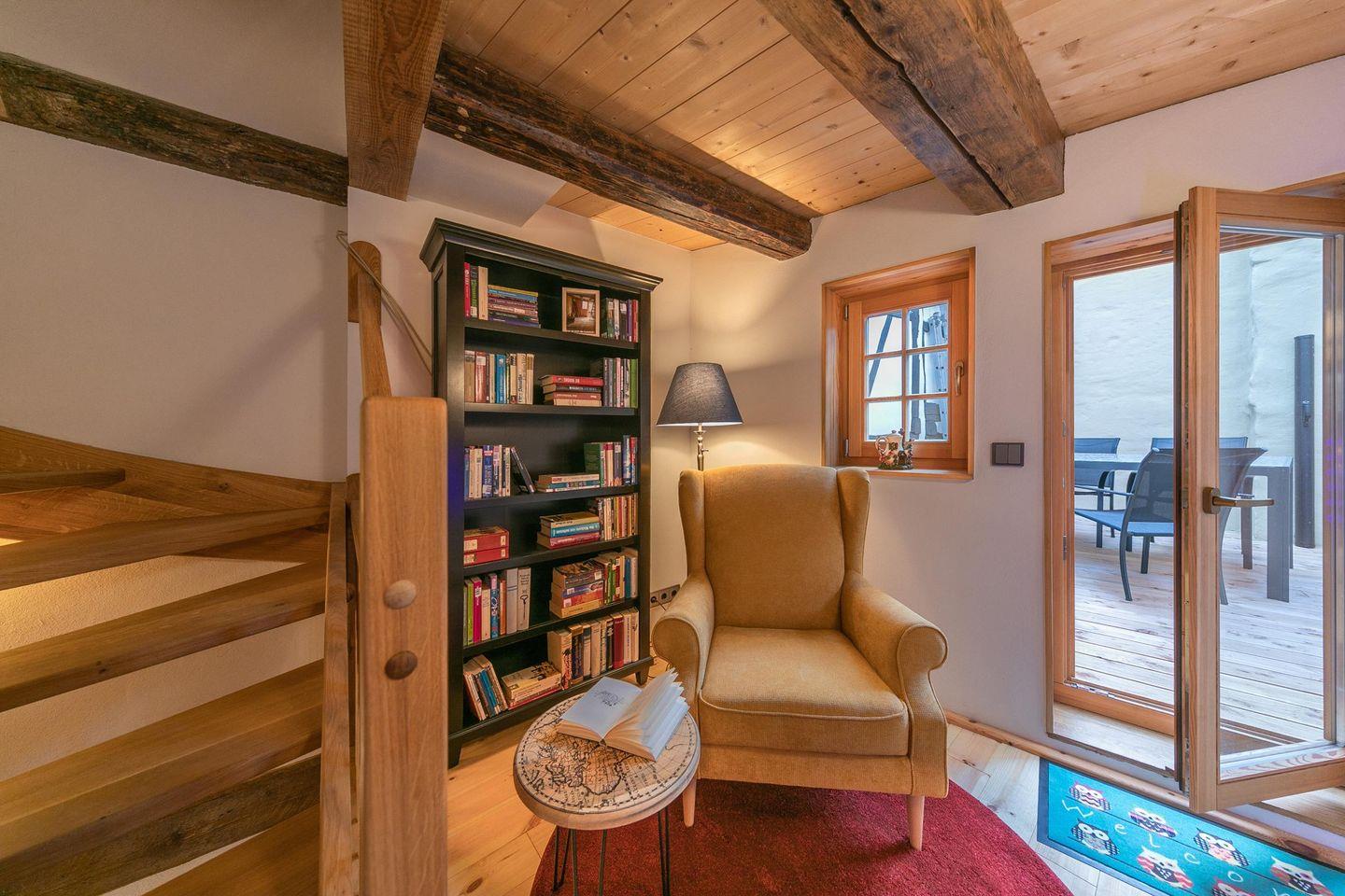 Über eine massive Echtholztreppe geht es in die obere Etage zu der gemütlichen Leseecke mit