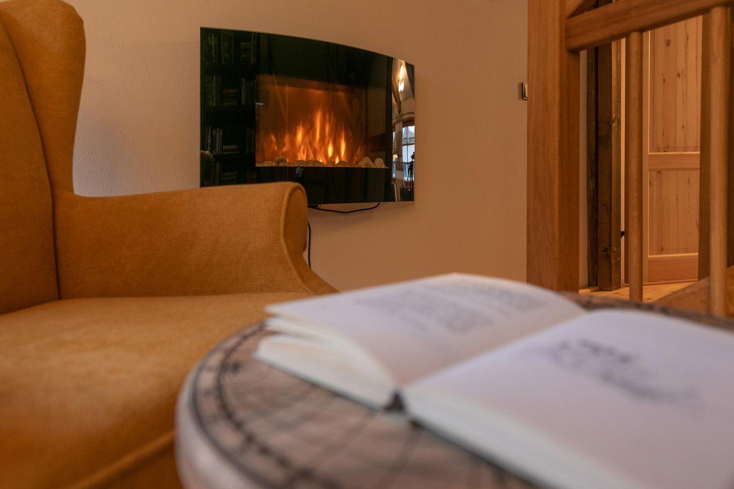 einem komfortablen Ohrensessel und einer großen Auswahl an Büchern. Dort befindet sich auch