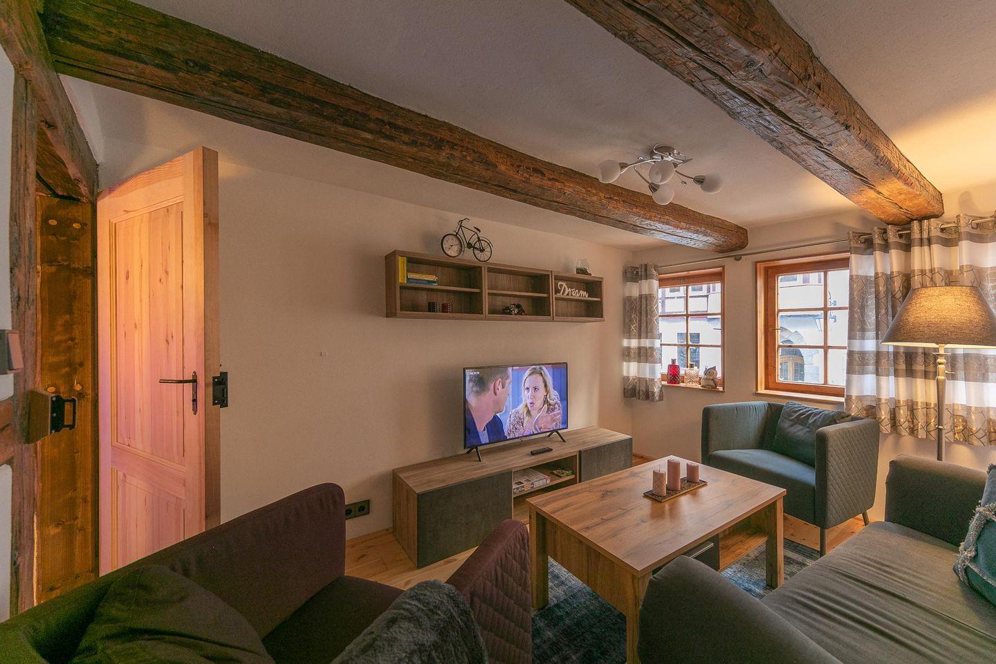 das Wohnzimmer mit 2 Sesseln und Couch und großem Flachbild-TV mit Internetfunktion