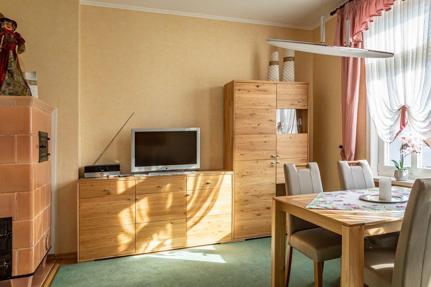 Im Wohnzimmer befindet sich eine gemütliche Couch, ein TV-Gerät und ein zusätzlicher Esstisch mit Stühlen, an dem Sie den Tag in gemütlicher Runde ausklingen lassen können.