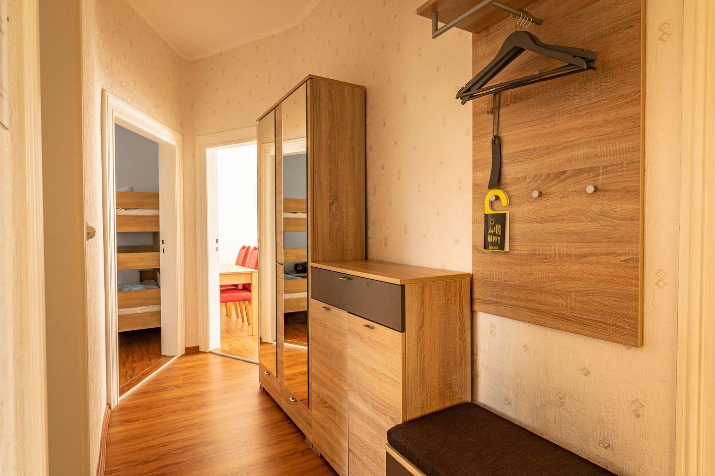 Die Unterkunft bietet Platz für 6 Personen in zwei Schlafzimmern. Das erste Schlafzimmer ist mit einem Doppelbett ausgestattet, das zweite Schlafzimmer verfügt über ein Doppelbett und einem zusätzlichen Etagenbett. Beide Schlafzimmer haben einen Kleiderschrank.