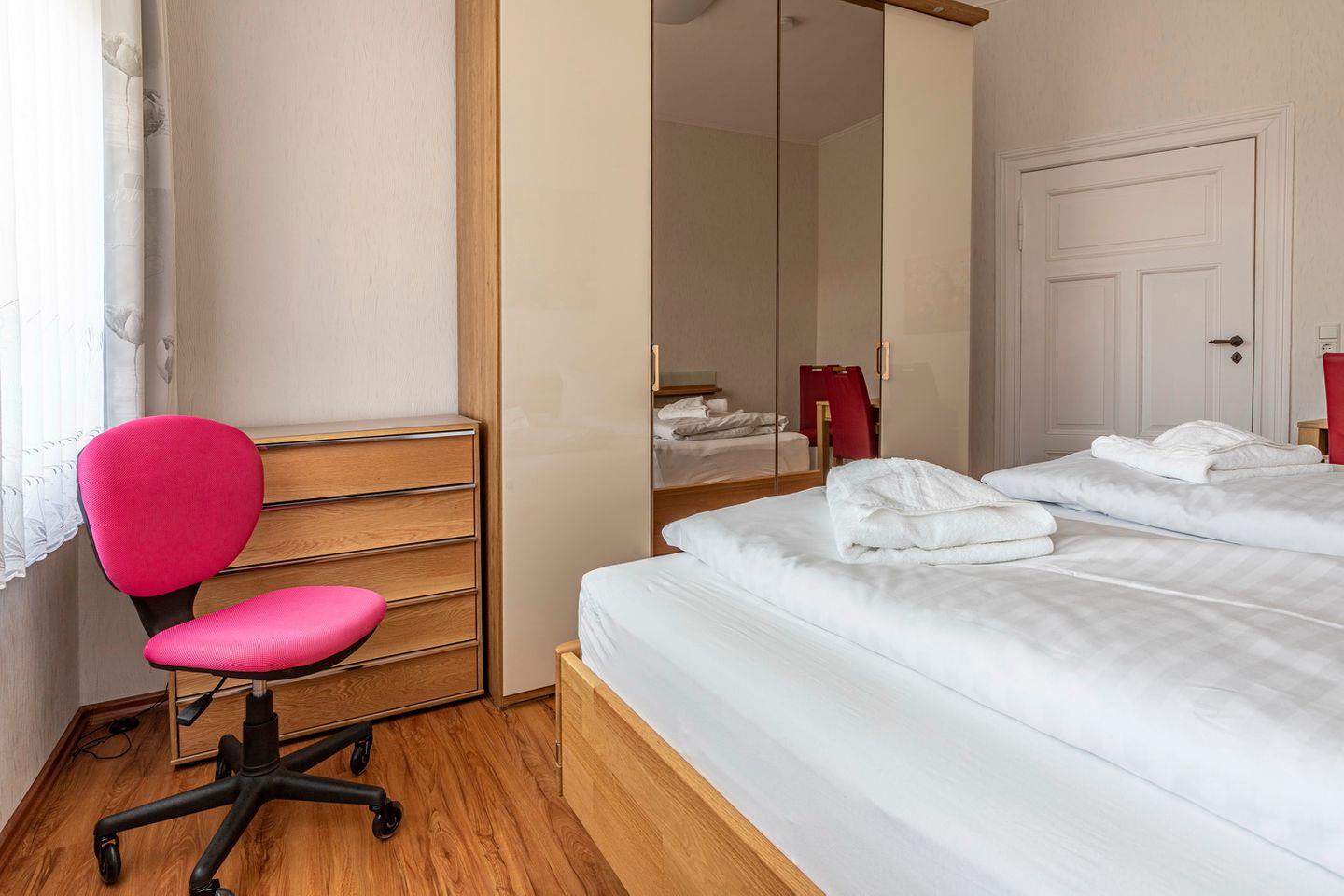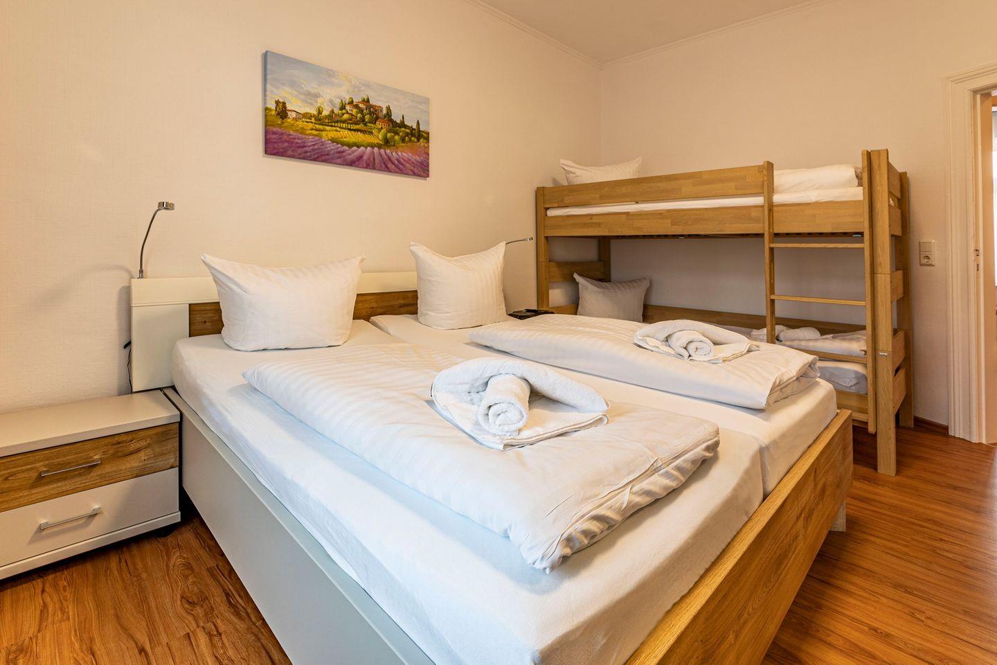 Die Ferienwohnung hat 2 Schlafzimmer sehr hochwertig ausgestattet mit 2 Doppelbetten, in einem davon noch zusätzlich ein Hochbett für Kinder und Kleiderschrank sowie Schreibtisch. Es steht Ihnen hier ein Bad mit DU/WC und ein Abstellraum zur Verfügung. Vor dem Haus ist eine Sitzgelegenheit im Garten vorhanden.
