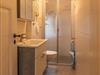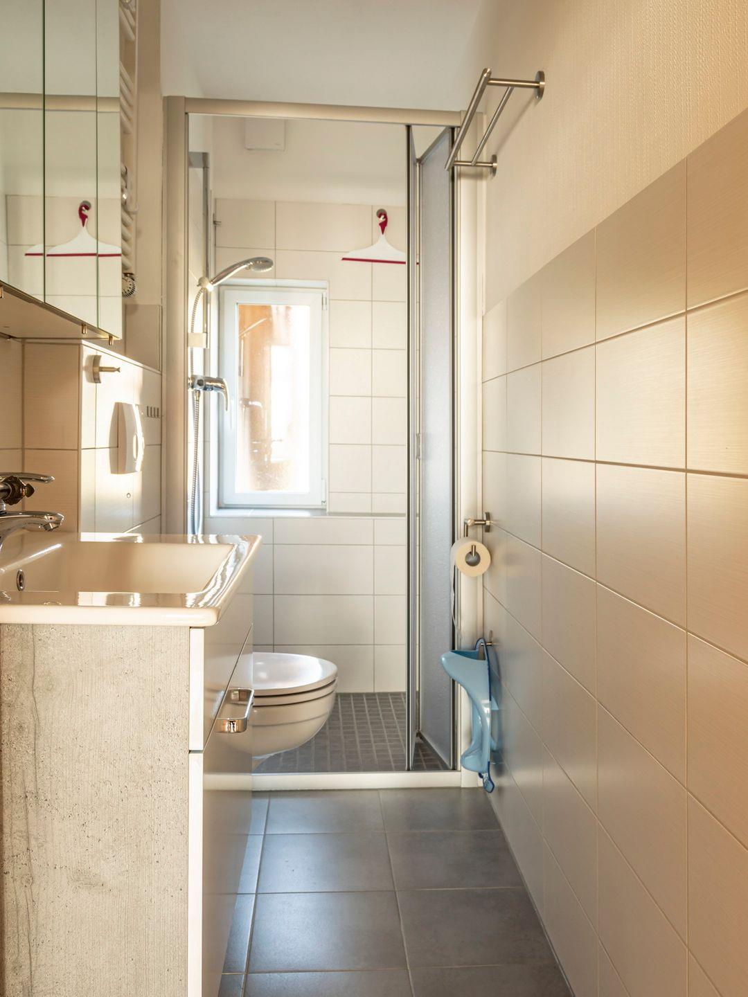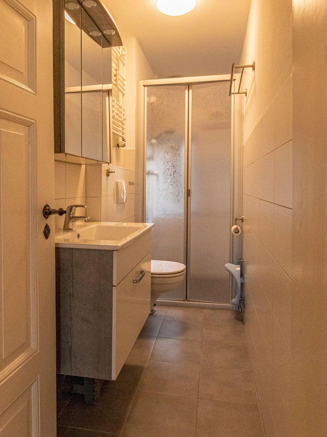 Das Tageslichtbad verfügt über ein WC, ein Waschbecken, einen beleuchteten Spiegel und eine Dusche.