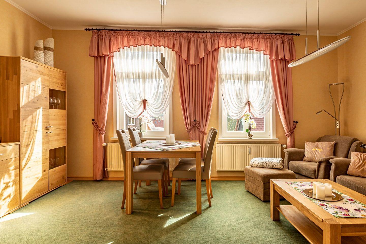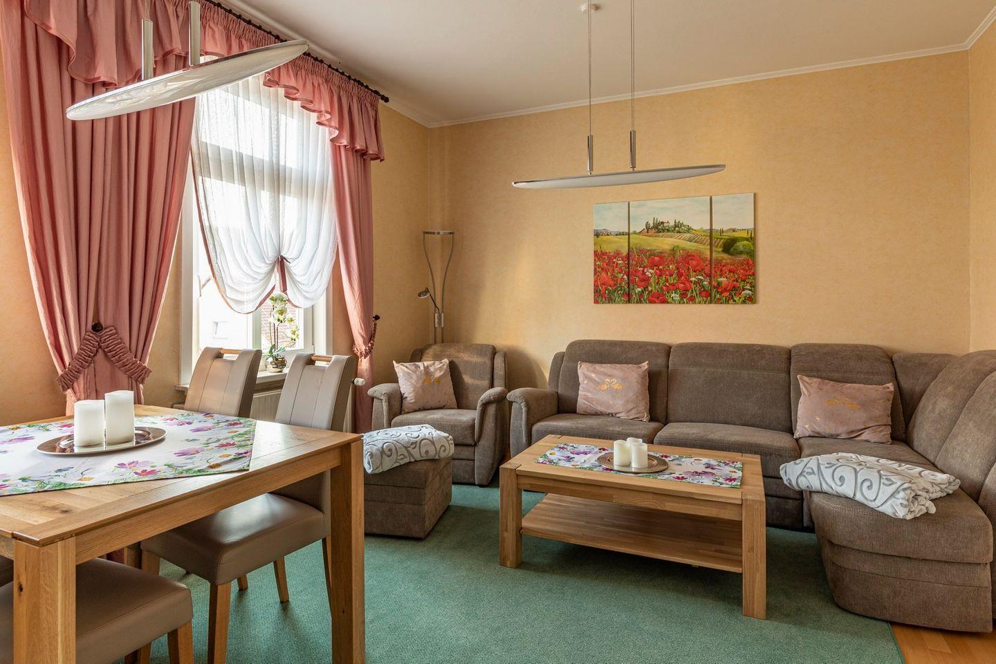 Die Ferienwohnung befindet sich im 1.OG, ist für 6 Personen ausgestattet und verfügt über ein großes Wohn- und Esszimmer. Die Küche ist ausgestattet mit Herd, Backofen, Kühlschrank mit Tiefkühlfach, Kaffeemaschine sowie einem Toaster, Wasserkocher, ausreichend Geschirr, Gläser und Besteck.