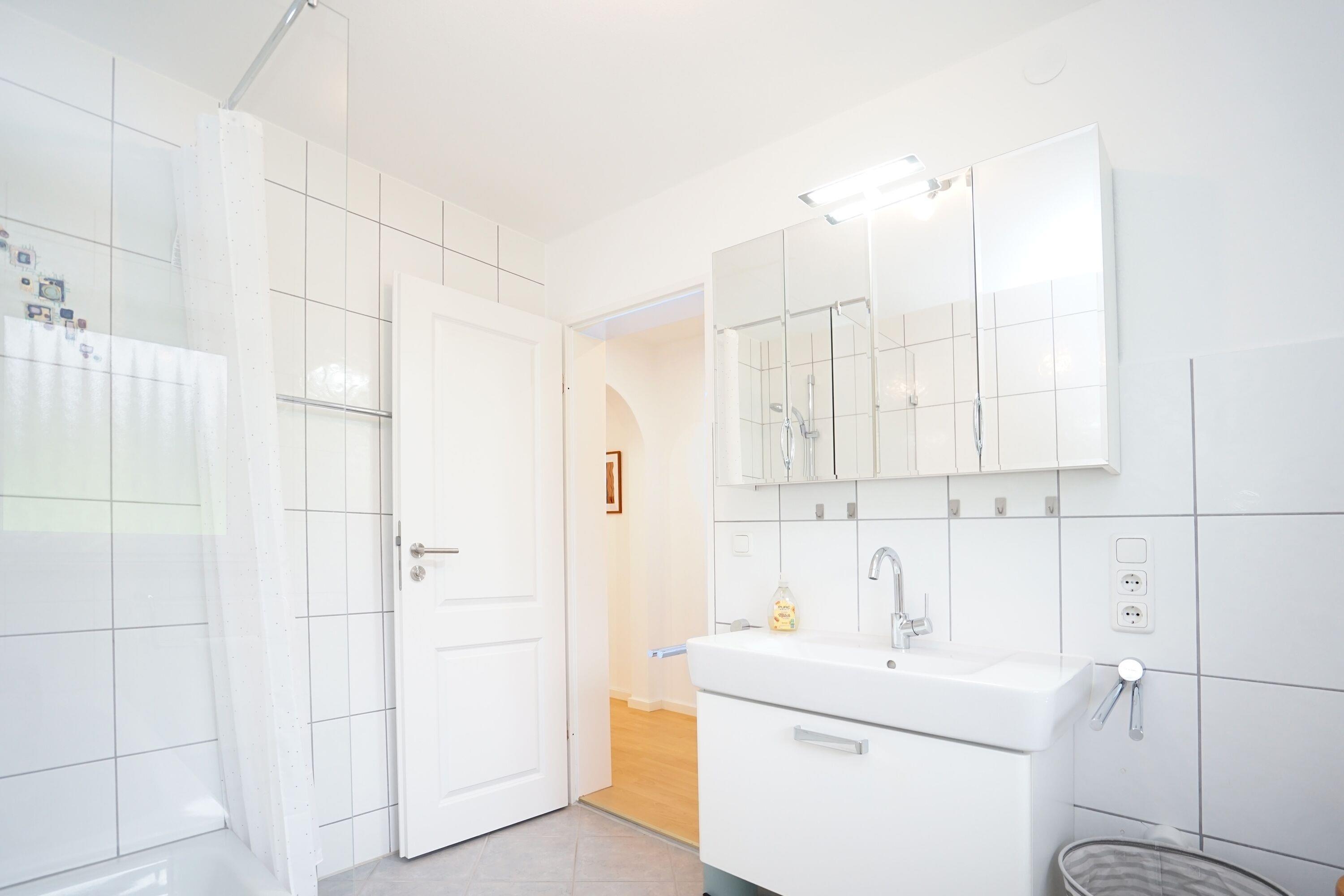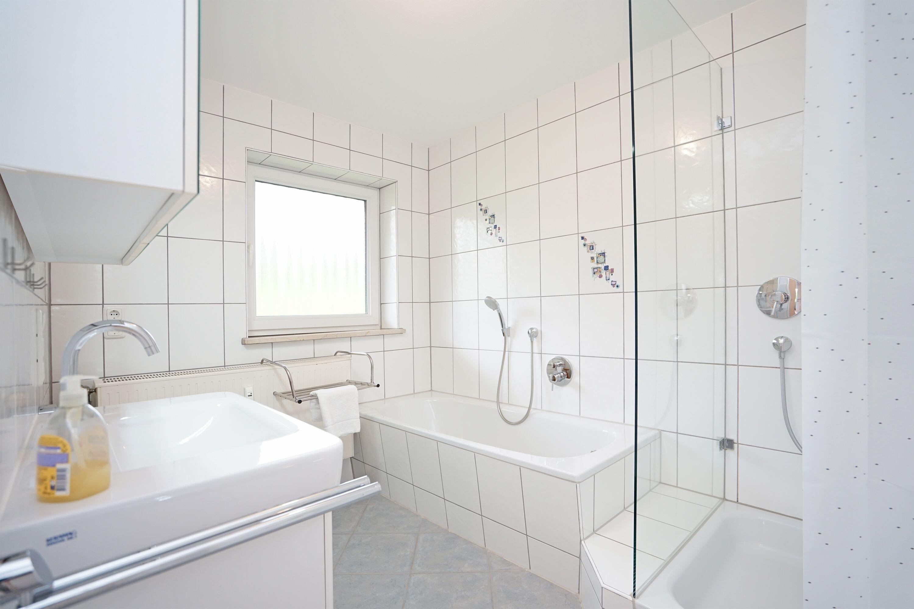 Bad mit Badewanne und Dusche, großes Waschbecken