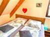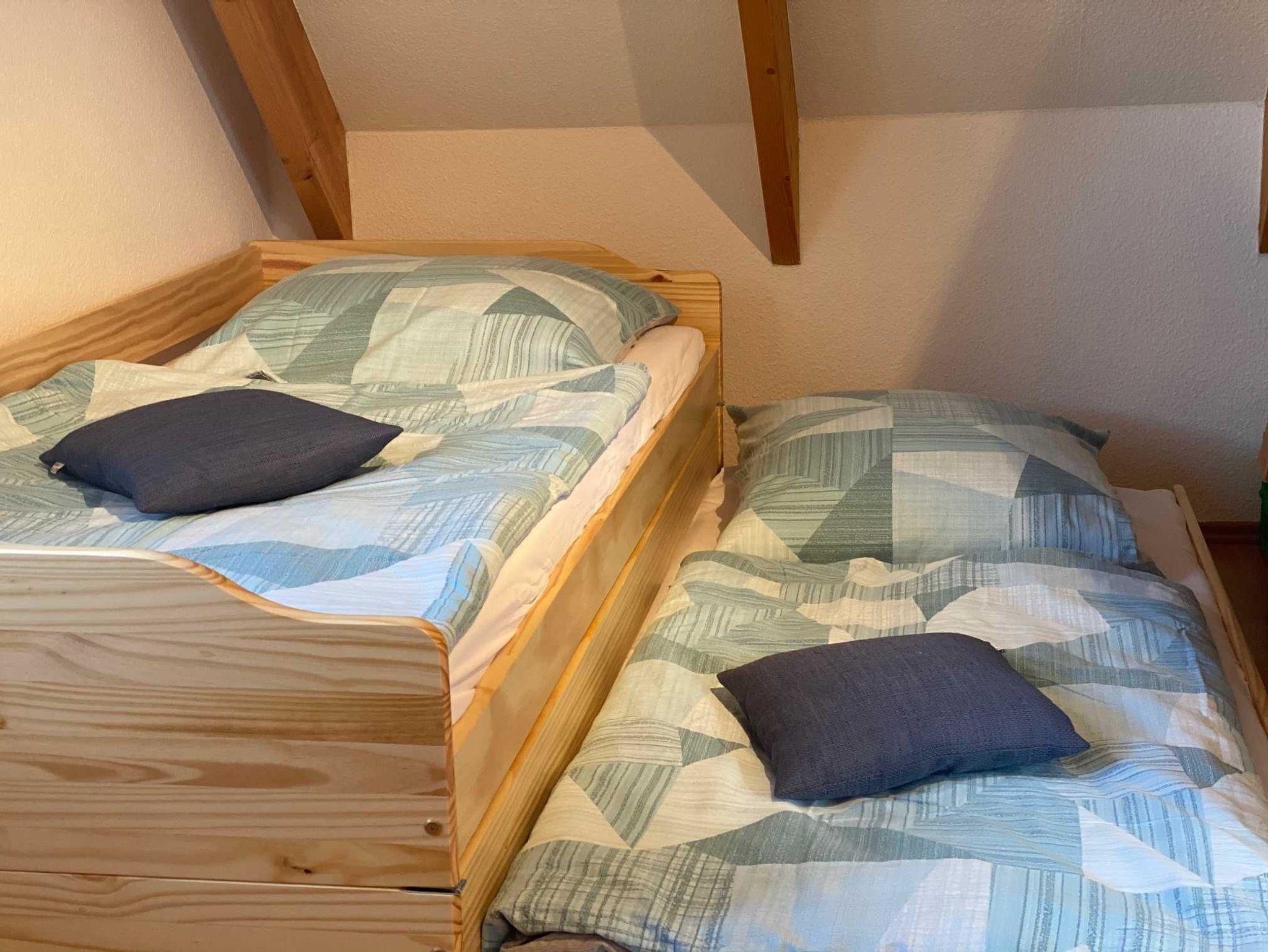 Unsere Ferienwohnung befindet sich direkt im Anbau zu unserem Wohnhaus. (Alle Zimmer haben Dachschrägen) Die Räume sind über eine offene Treppe im unteren Flur zu erreichen. Die Ferienwonung ist ca. 50m² groß, verfügt über ein Schlafzimmer und ein Wohnraum. Beide Räume sind mit elektrischen Außenjalousien zu verdunkeln. Vom Schlafzimmer und Küchenfenster hat man einen schönen Blcik auf die Woblitz. Das Schlafzimmer ist mit einem Doppelbett (2 Liegen je 90x200cm) und einem Einzelbett (90x200), sowie einem Schrank und Regal ausgestattet. Im Wohnraum befindet sich die offene Küchenzeile (Kühlschrank mit Gefrierfach), sowie eine Couch, die zusätzlich als Aufbettung genutz werden kann. Das Bad/WC ist mit einer Badewanne ausgestattet. Außer dem Flur haben alle Räume Fussbodenheizung. Im Wohn und Schlafraum ist Laminat gelegt. Flur und Bad sind gefliest. Alle Steckdosen haben Steckerschutz, die Treppe ein Schutzgitter. Hochstuhl und Babyreisebett sind vorhanden.