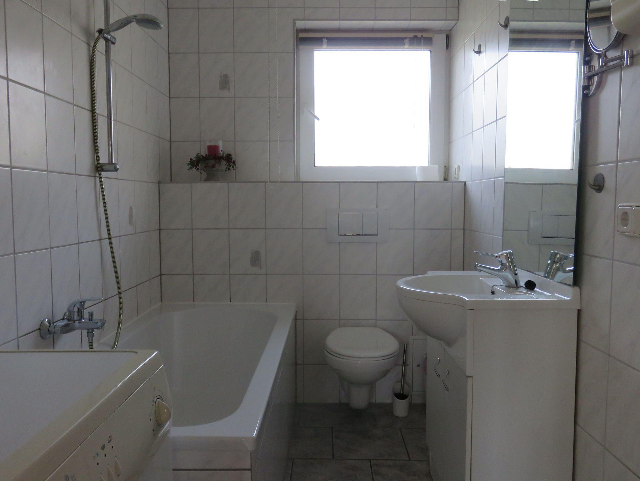 Das Bad bietet nicht nur eine Wanne mit Duschmöglichkeit und WC, sondern zusätzlich noch eine Waschmaschine und eine Sauna.