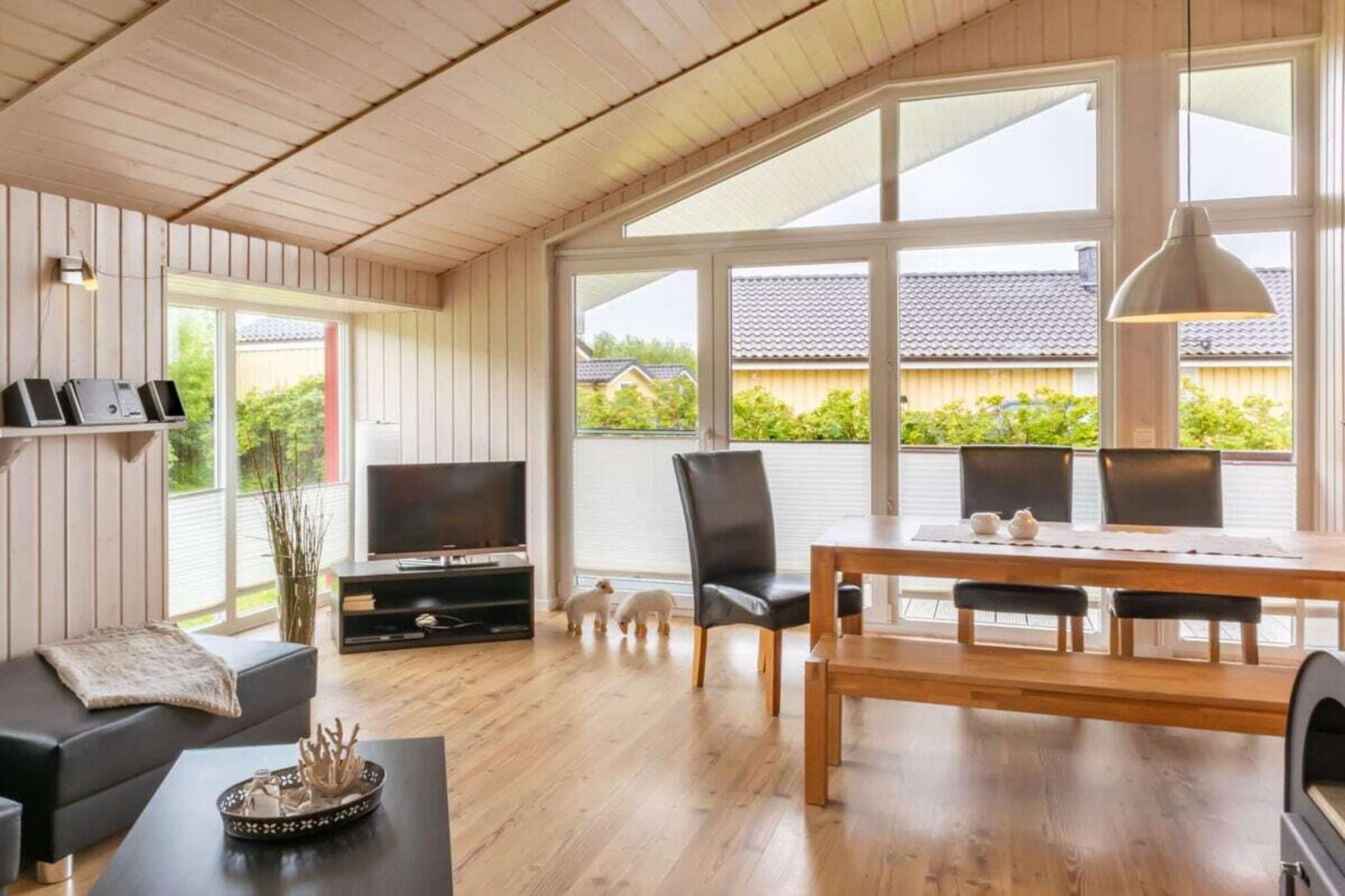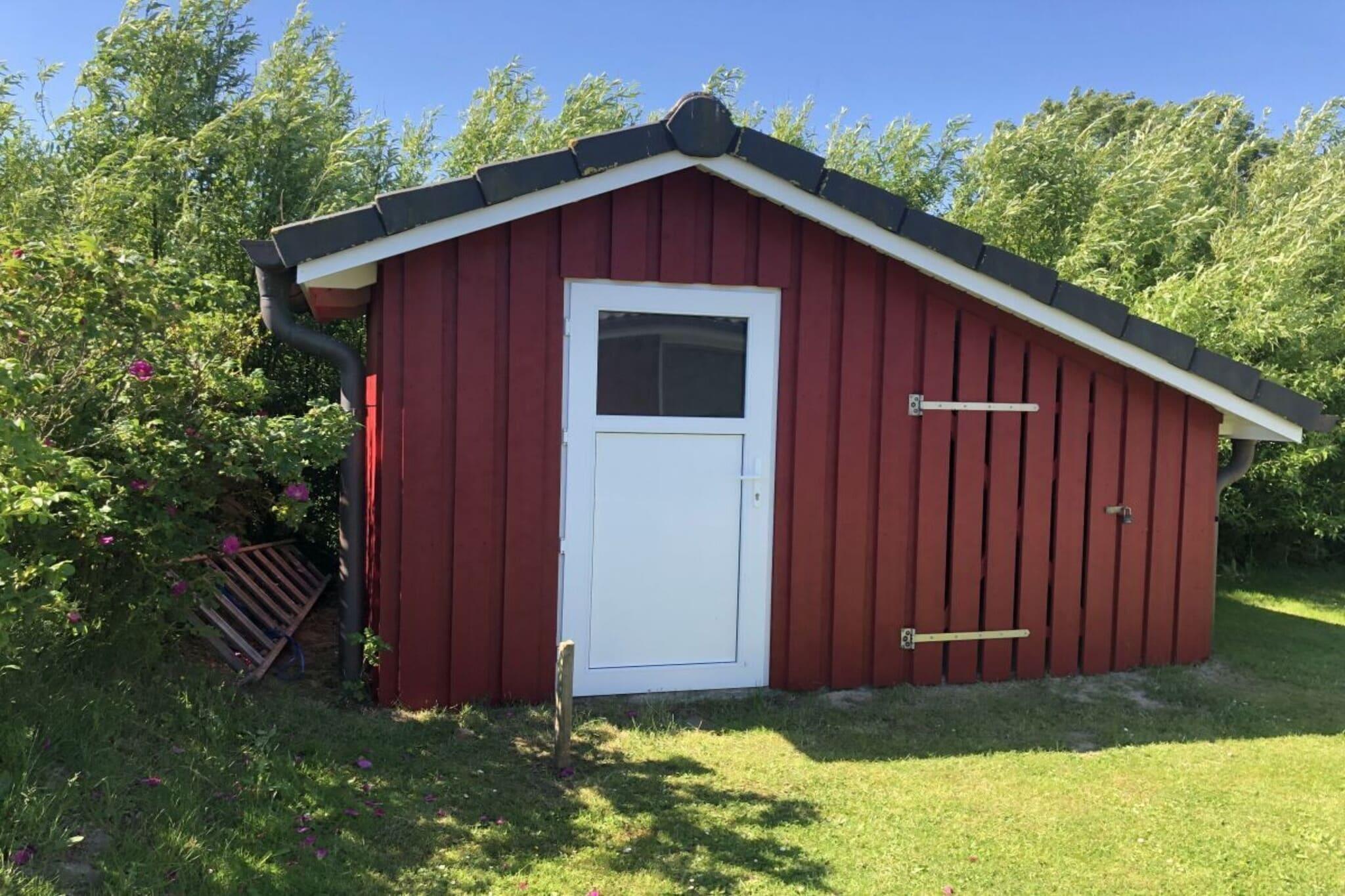 Skandinavisk træhus med sauna og pejs. Stilfuldt indrettet til op til 5 personer. Direkte udsigt over diget, Vesterhavet og den naturlige strand er omkring 200 m væk. Familier med børn eller par, der elsker Nordsøklimaet og leder efter eller ønsker at lære det at kende, er kommet til det rette sted. Sluk blot, lad hverdagens stress ligge, slap af i en strandstol på terrassen med udsigt over diget eller i saunaen. Grill i haven på Weber-grillen eller madlavning i det hyggelige køkken med Thermomix - alt efter vejret kan du nyde det her. I vores hus kan du nyde Vesterhavet fuldt ud - først en afslappet vandretur langs diget, derefter varme dig op i saunaen og slappe af foran pejsen. Den særlige flair inviterer dig til at forlade hverdagens stress og lade dig rive med af roen og hyggen. Huset er fordelt på cirka 68 kvadratmeter. Fra stuen er der adgang til den lille alkove, hvor der er en madras på gulvet, hvor en femte person kan sove. Fra stuen kommer man ind i soveværelset med dobbeltseng og udgang til sydterrasse. Badeværelset med sauna fører også ud til stuen. Gennem hoveddøren kommer man direkte ind i køkkenet, hvorfra værelset med de to køjesenge leder ud. Badeværelset og køkkenet er flisebelagt med elegante mørke klinker, mens stue og soveværelser har laminat i trælook. Det store spisebord med op til 6 siddepladser er også placeret i stuen. TV og musikanlæg er der også.