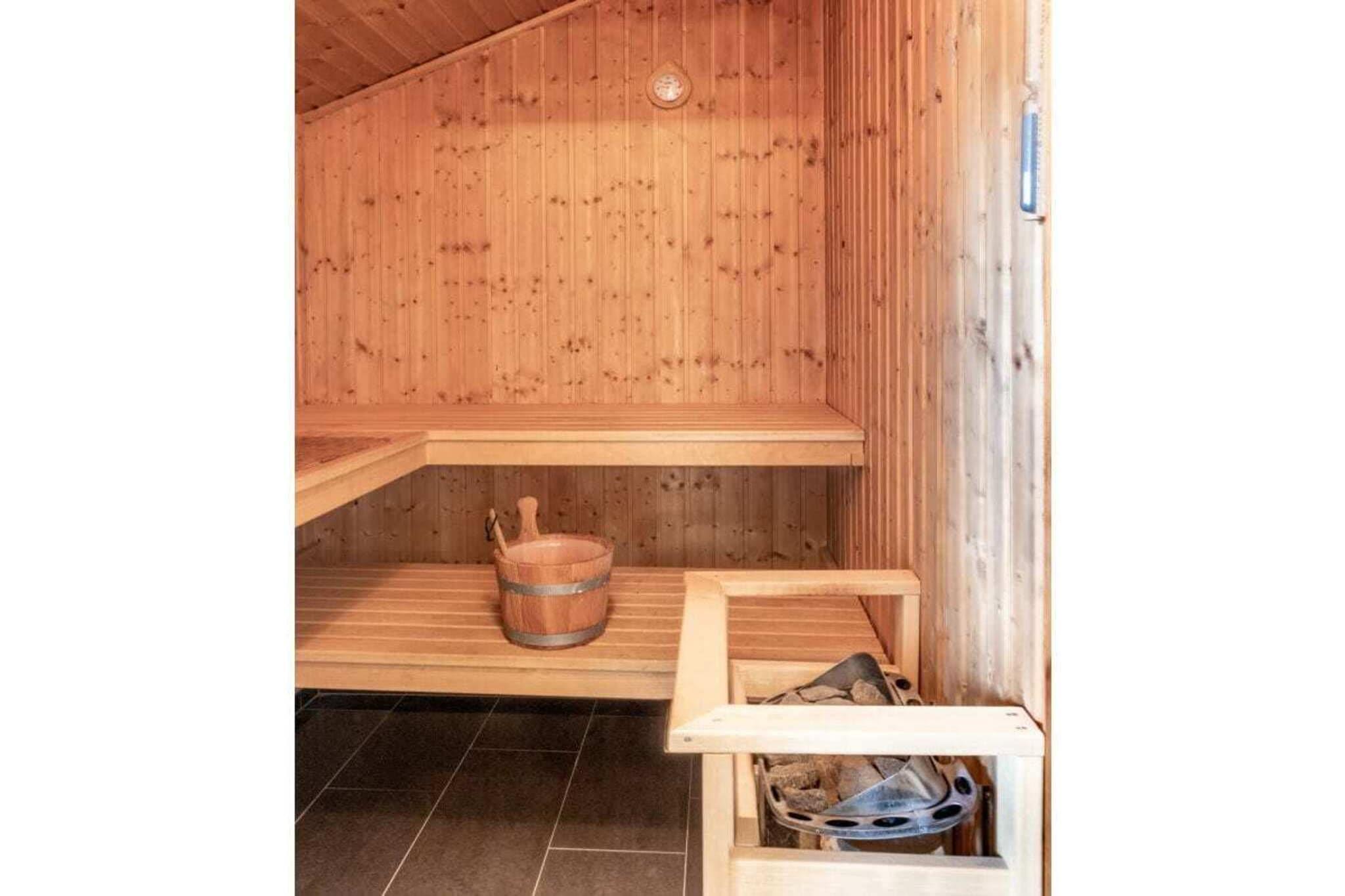 Stueetage: (Køkken(kakkelovn, kogeplade, ovn, opvaskemaskine , køleskab), stue / spisestue(enkeltsovesofa, køjeseng, Fjernsyn, spisebord), soveværelse(dobbeltseng), badeværelse(bruser, toilet)) , loungerum(sauna), veranda(havemøbler), Internetadgang, terrasse(, , , , tekøkken, toilet, bibliotek, sauna, Strand, Fjernsyn, pejs, DVD-afspiller, radio, stereoanlæg, håndvask, vaskemaskine, havemøbler, solstole, barnestol, føntørrer), tørreskab