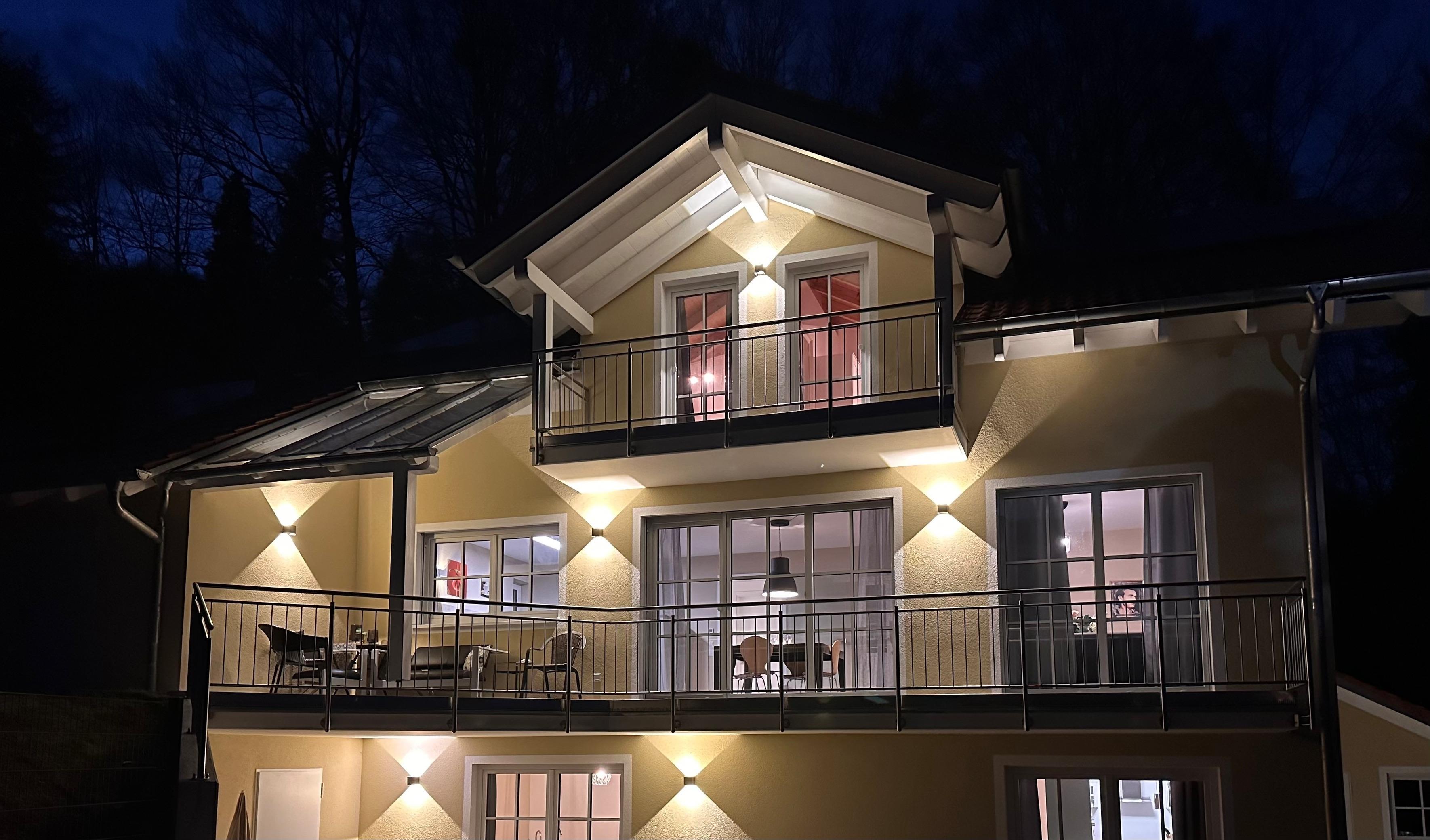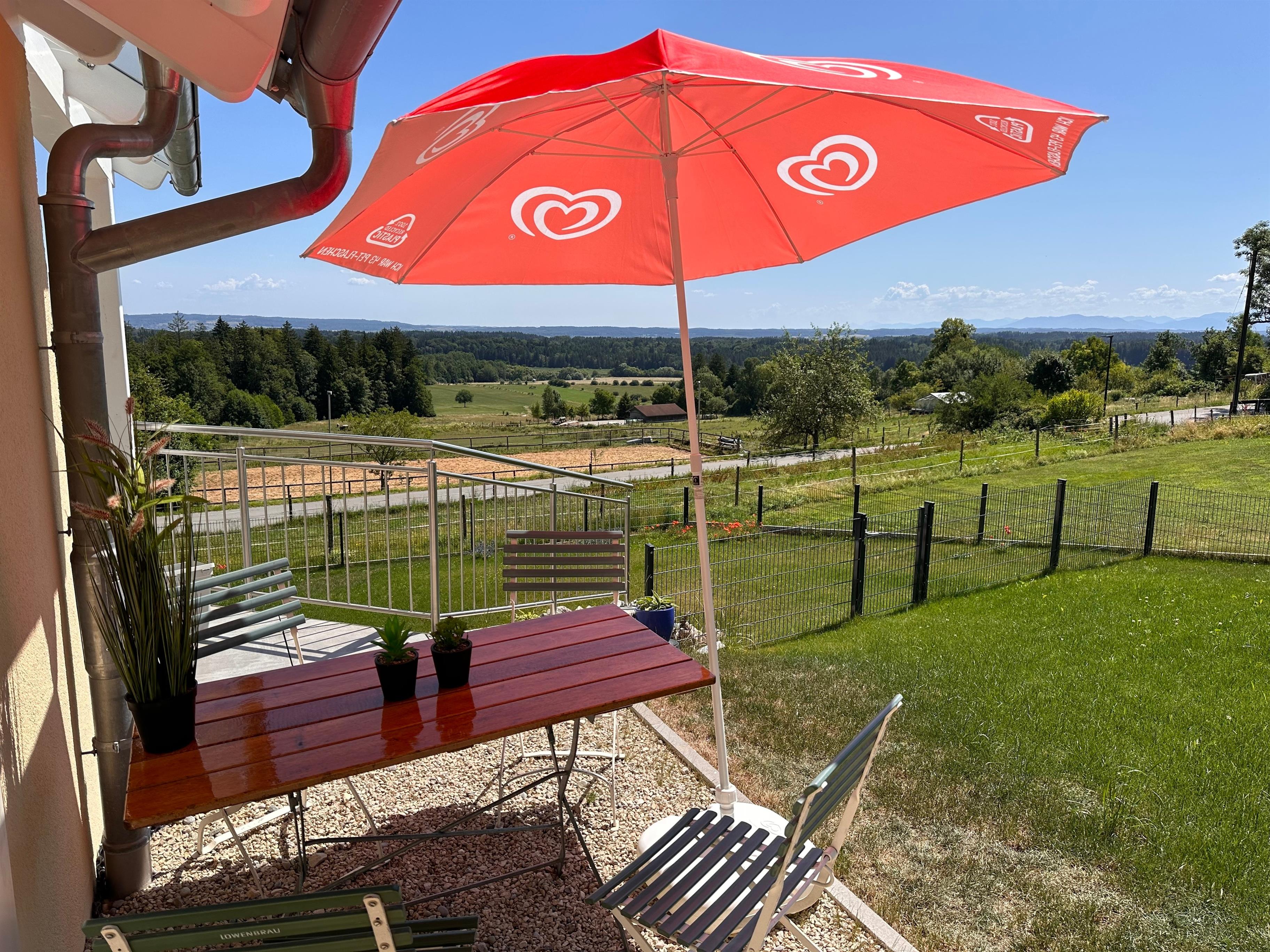 Eigener Hauseingang, zwei Balkone, überdachter Freisitz, kleiner Biergarten mit Biergartentisch, vier Stühlen und Schirm, Garten sowie beleuchtete Stellplätze direkt gegenüber