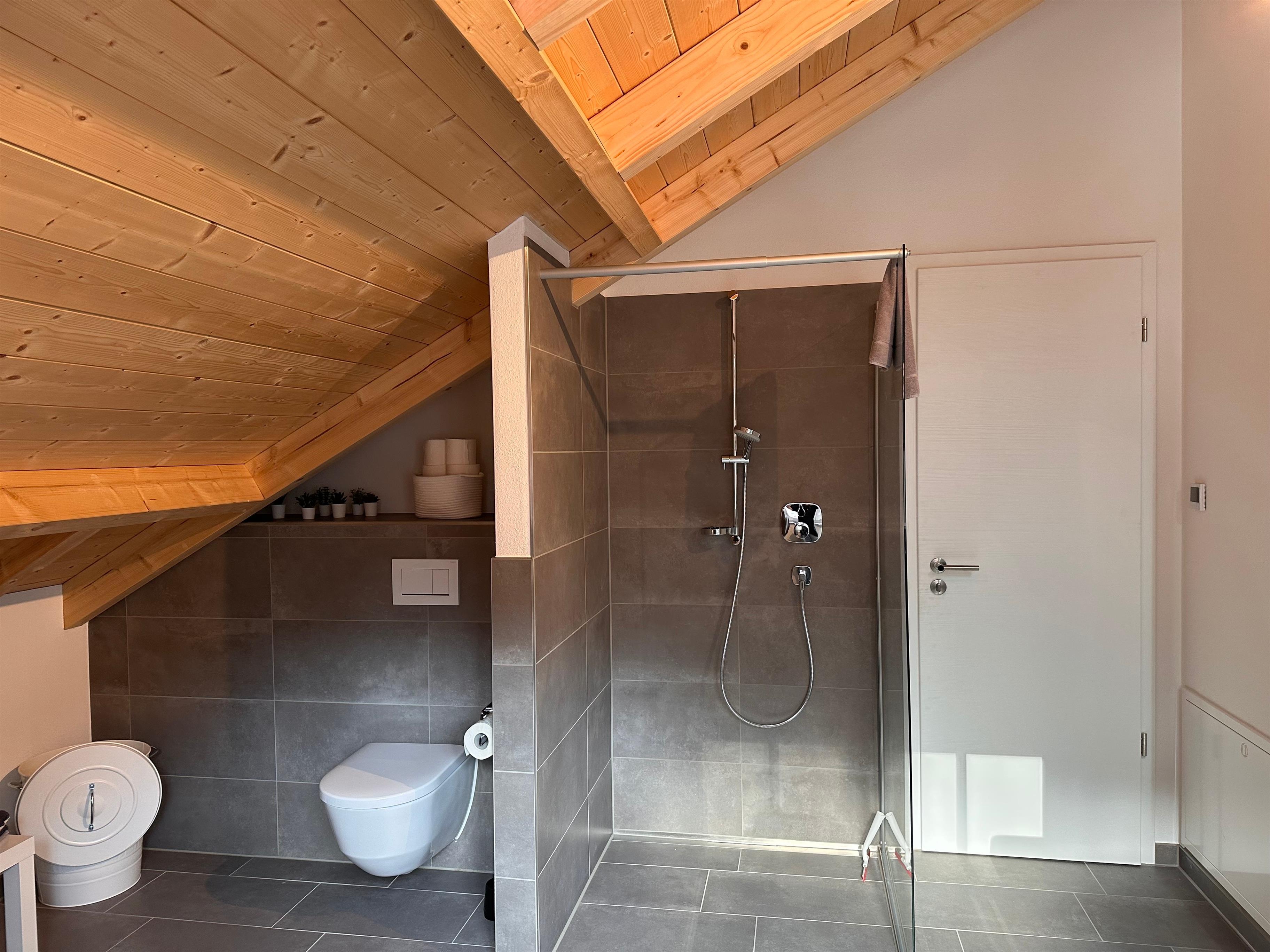 Ein Bad mit Walk-In Dusche, Toilette und Waschbecken