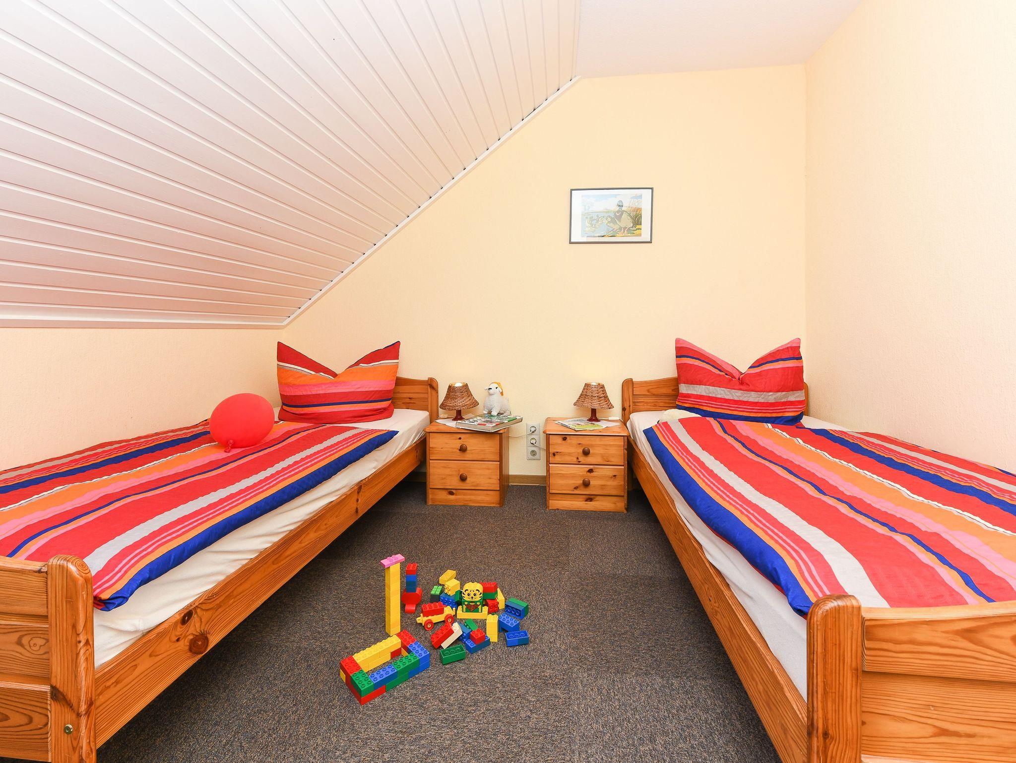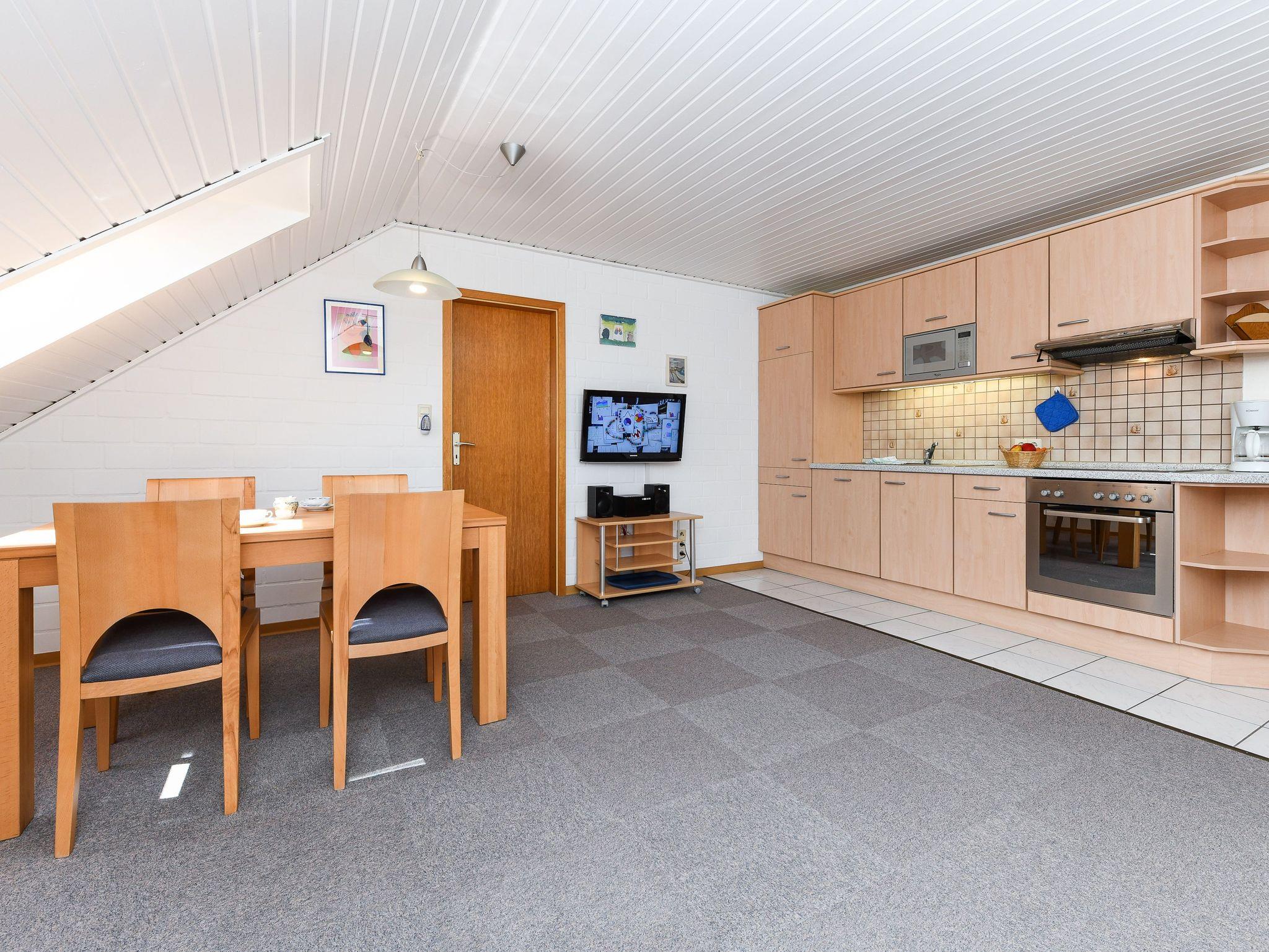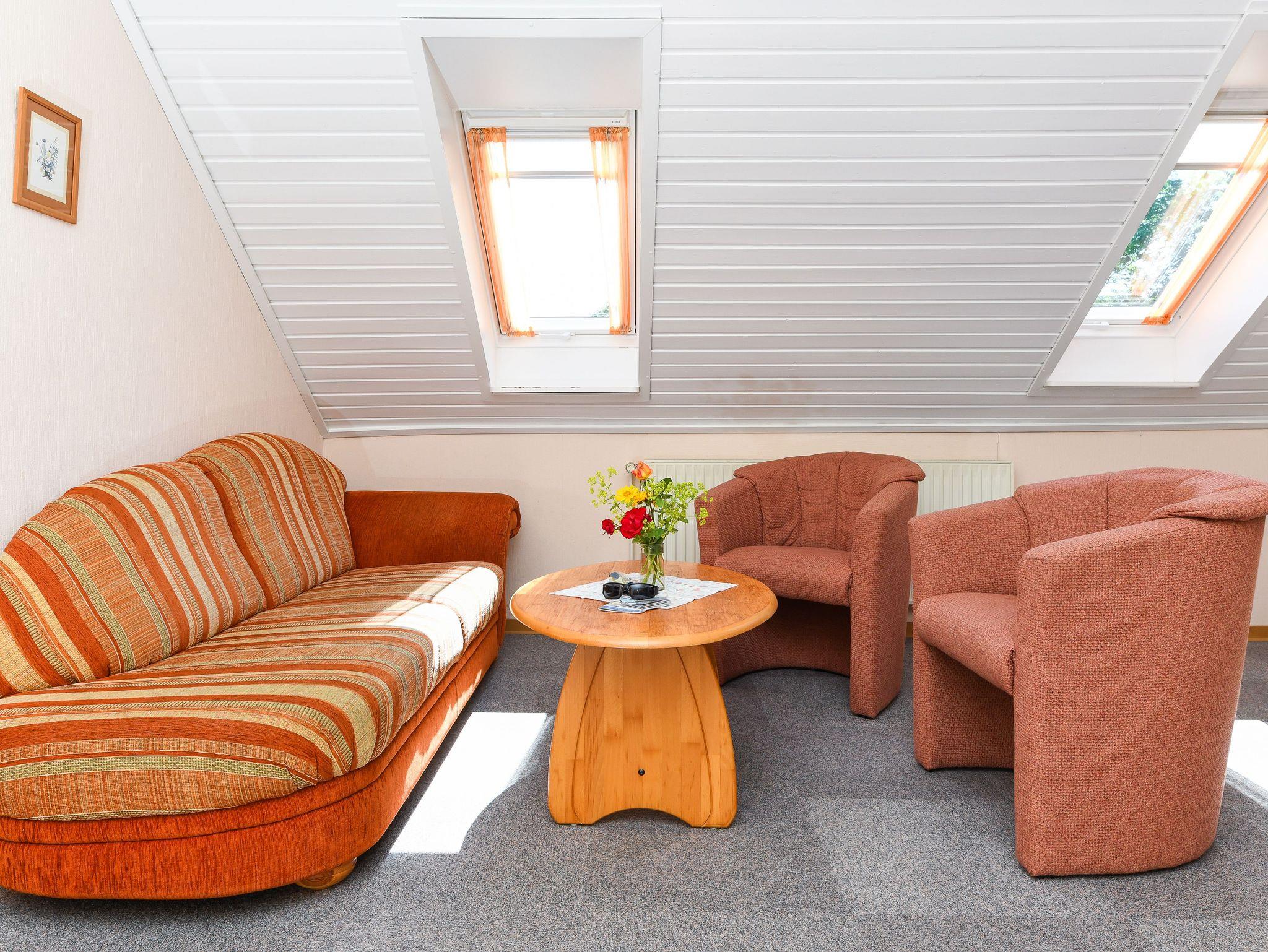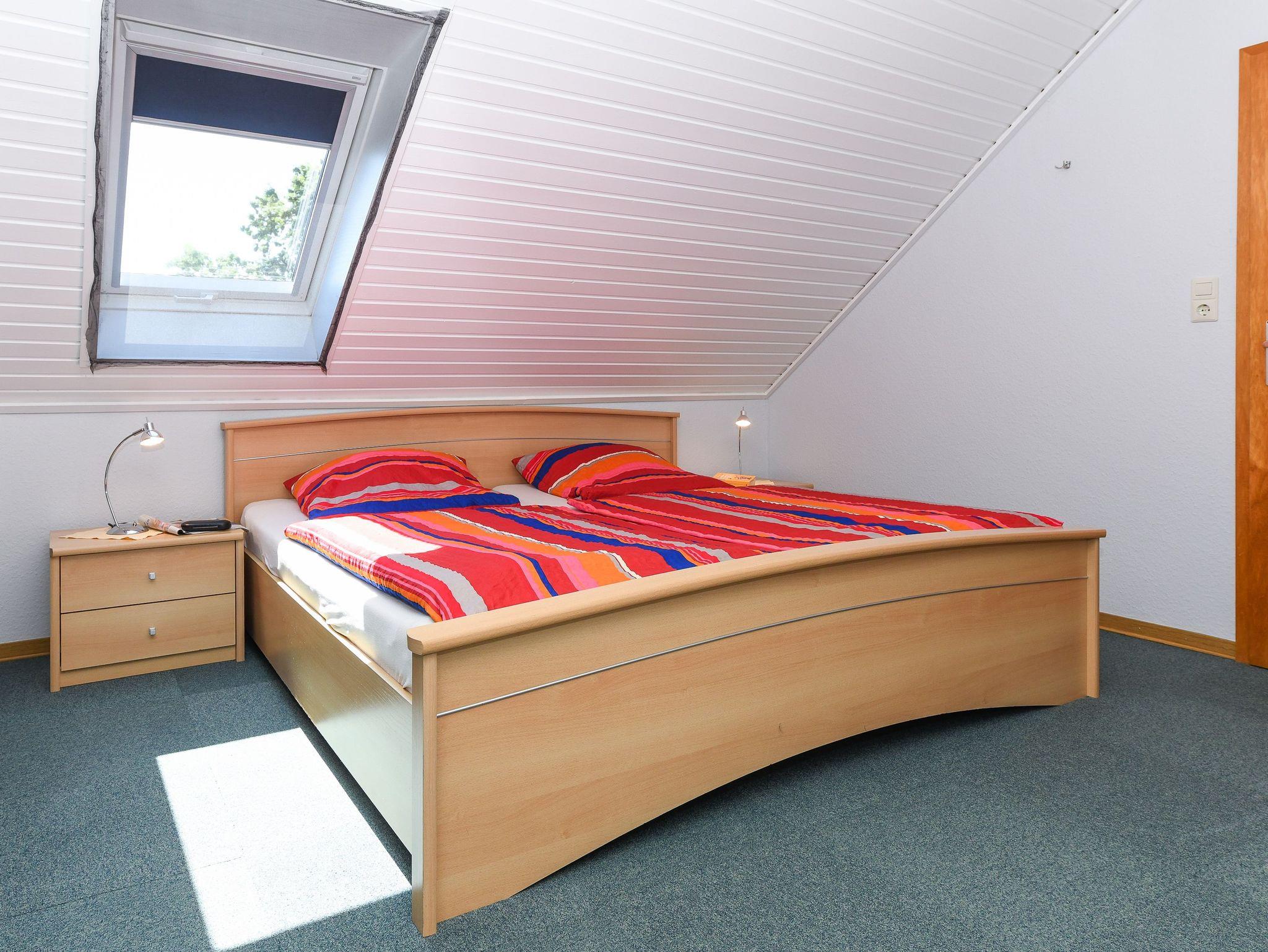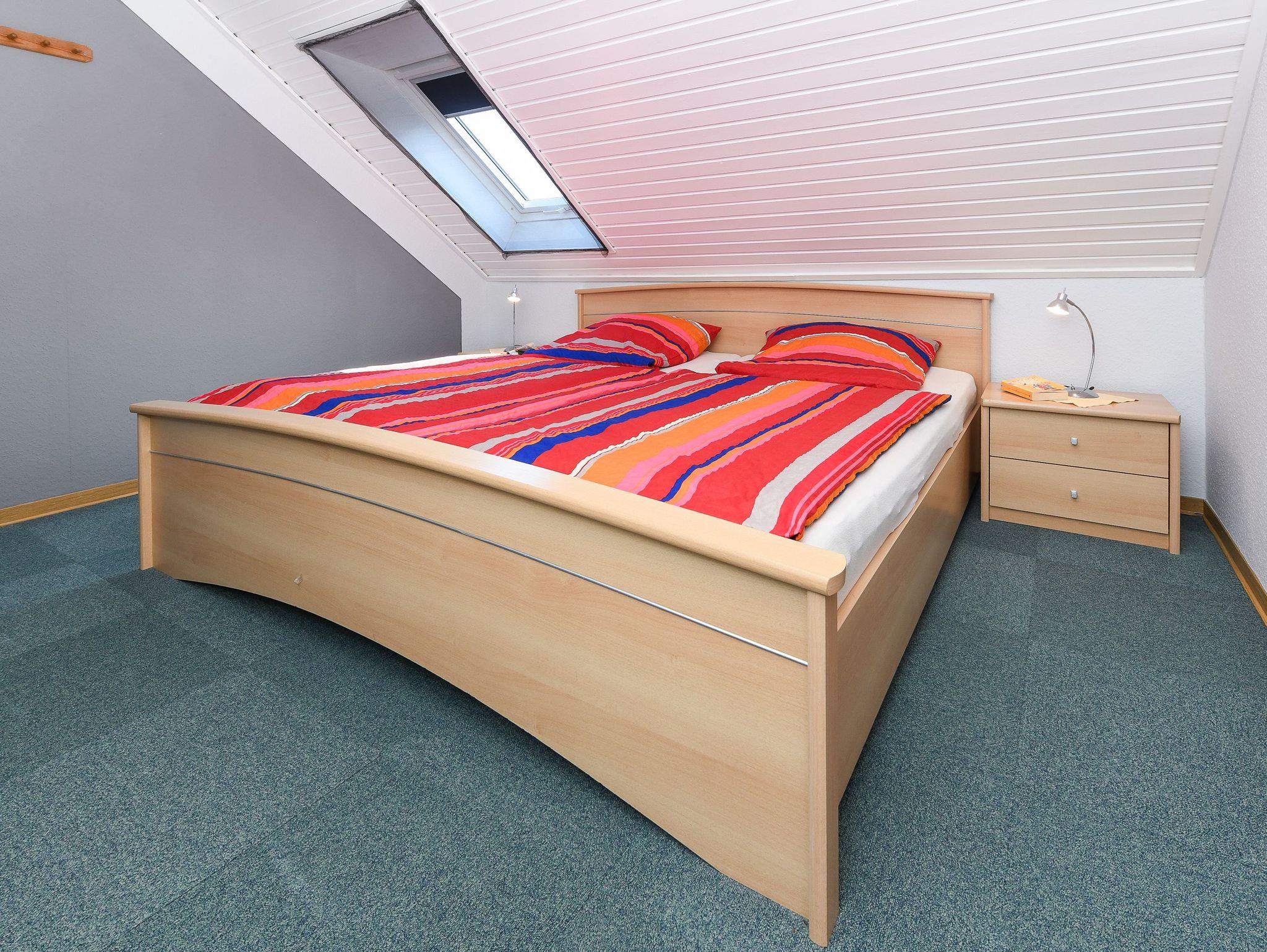 Größe ca. 60 Quadratmeter, Wohnraum mit integrierter Küche, Schlafzimmer, zweites separates Schlafzimmer/Kinderzimmer, Badezimmer mit Dusche, Waschtisch und WC, Obergeschoss, optimal für 2 bis 4 Personen und zusätzlich ein Kleinkind.