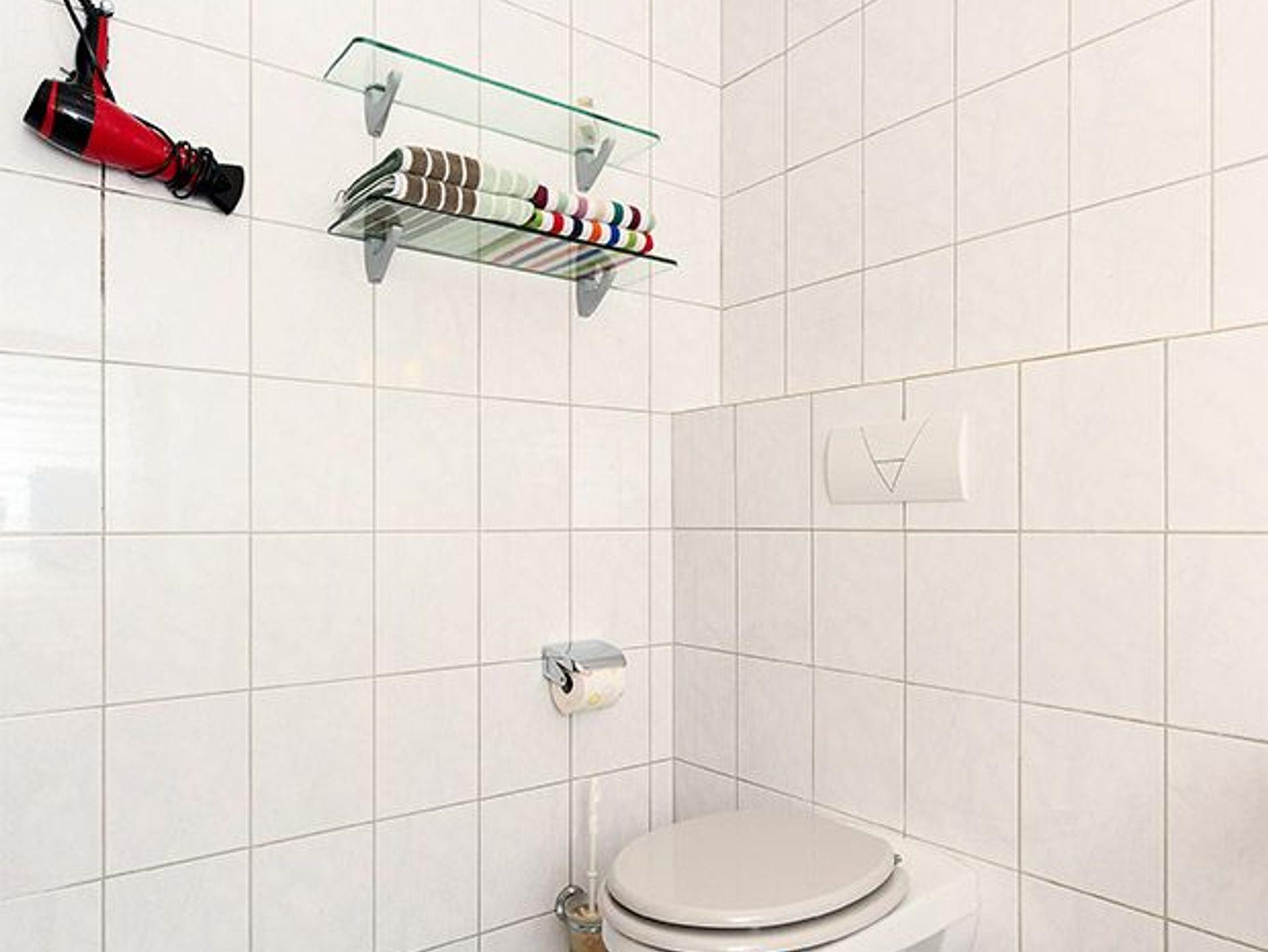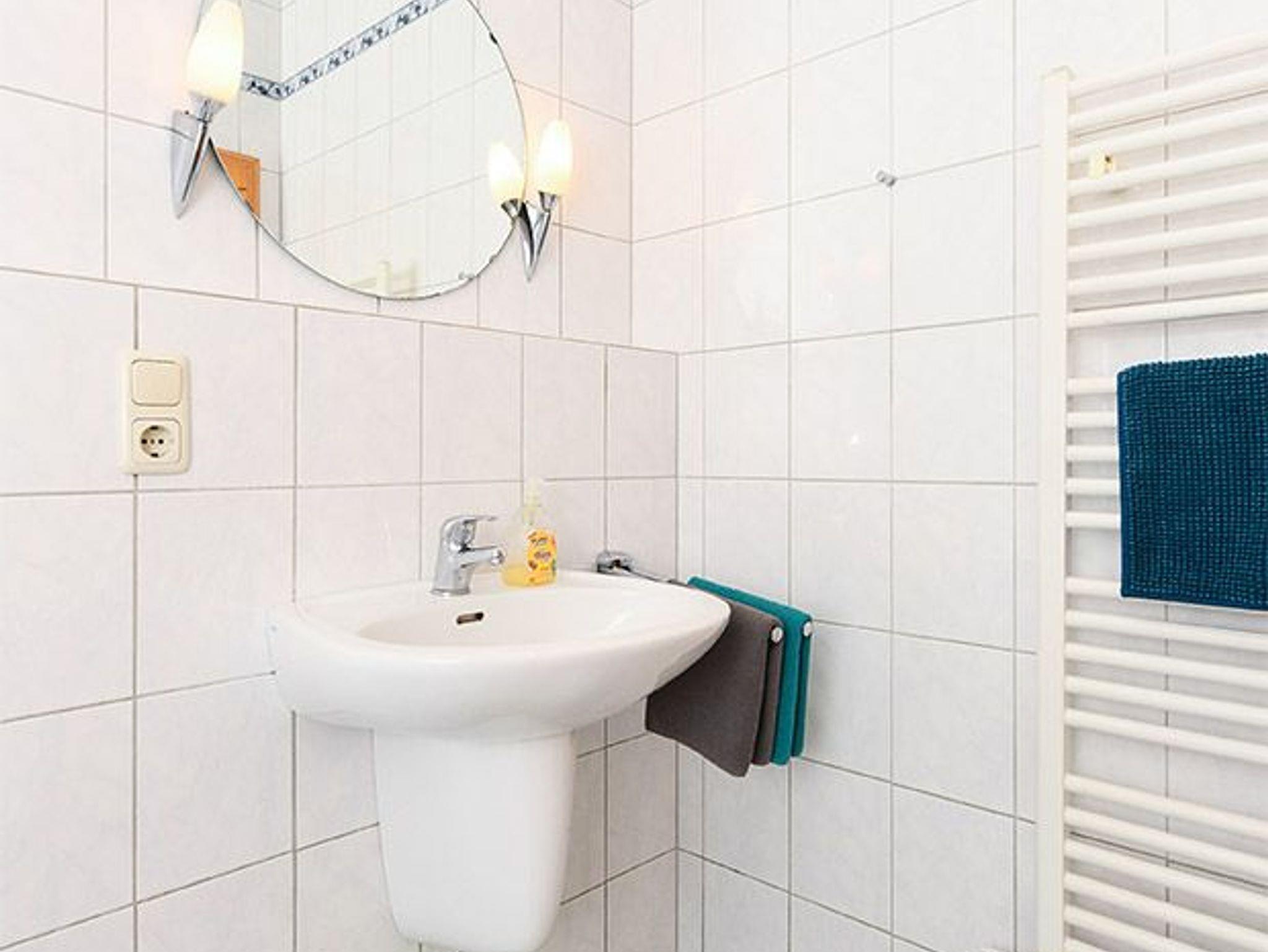 Badezimmer mit Dusche, Waschtisch und WC, Erdgeschoss, Terrasse, optimal für 2 bis 5 Personen.