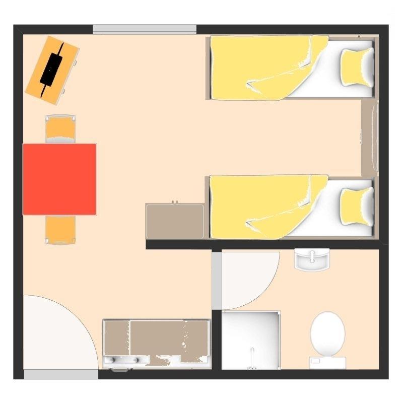 Diese einfache und dennoch gemütliche 1-Zimmer-Wohnung ist ca. 16 qm groß und ist ausgestattet mit 2 Einzelbetten, einem kleinem Esstisch sowie einer Pantry-Küche.