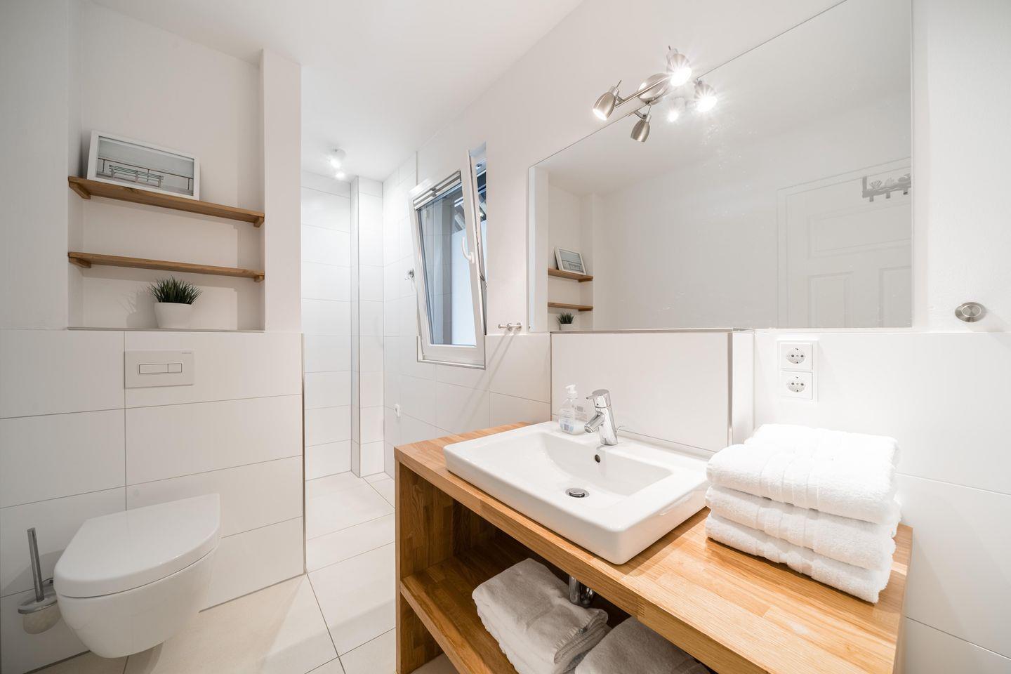 Das Badezimmer der Unterkunft ist mit bodengleicher Dusche ausgestattet und bietet modernsten Komfort. Frische Handtücher und eine Erstausstattung sorgen dafür, dass Sie gleich nach der Ankunft entspannen können. Die Wohnung ist allergikerfreundlich und bietet alle notwendigen Annehmlichkeiten, um Ihren Aufenthalt angenehm zu gestalten, darunter eine Waschmaschine, Trockner und weiteres, was Ihren Urlaub komfortabel macht.
