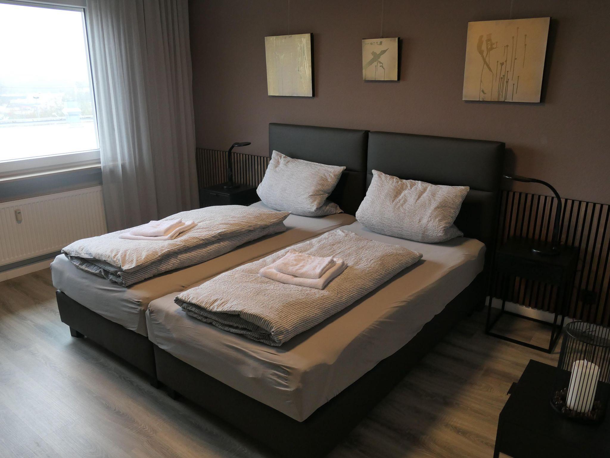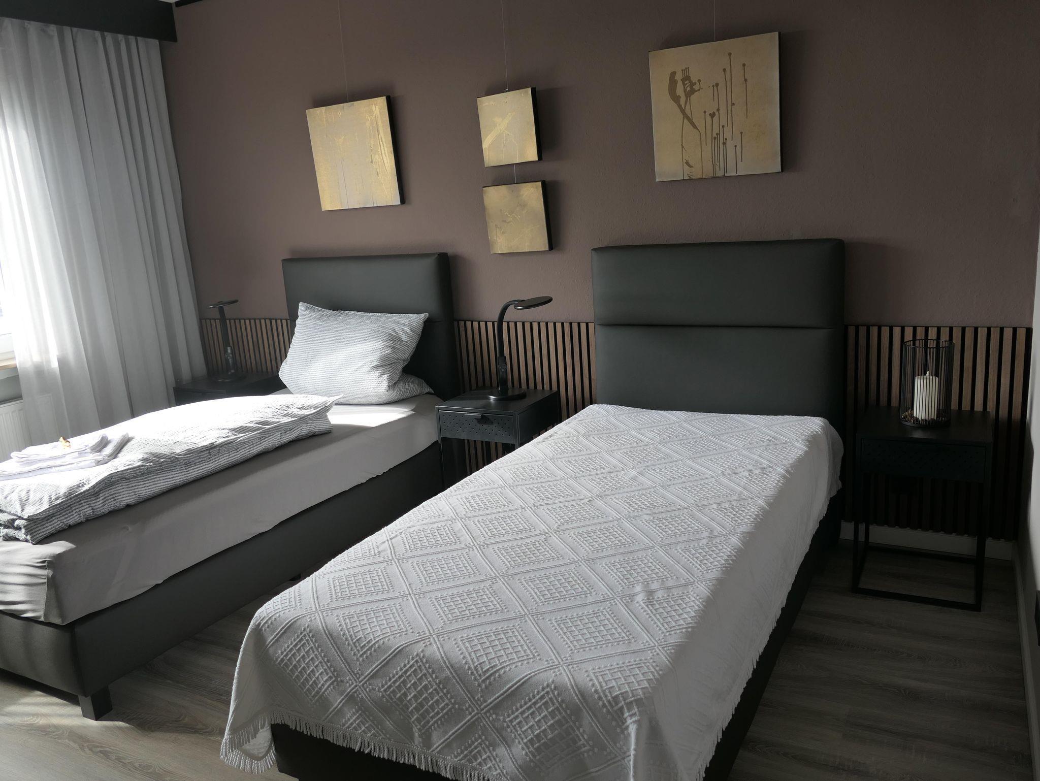 • Zwei Boxspring Einzelbetten (100x200 cm) mit hochwertigen Matratzen und Bettwäsche
