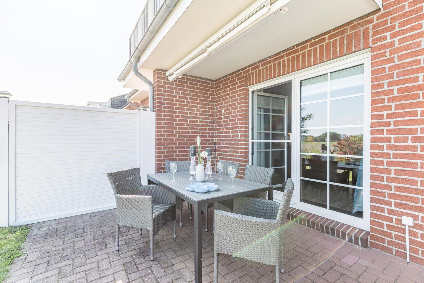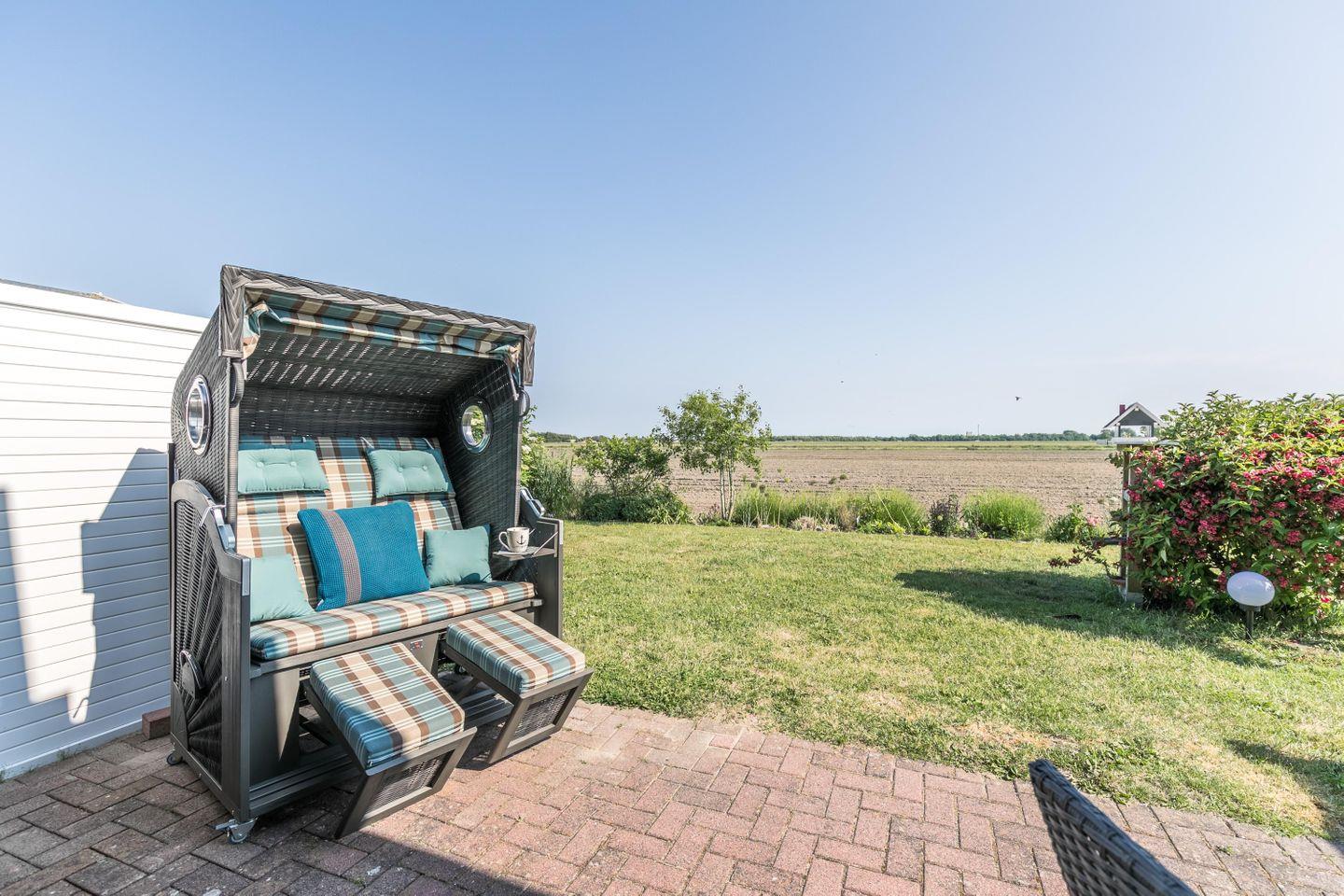 Die Terrasse mit einem großen Strandkorb lädt zum sonnenbaden ein.