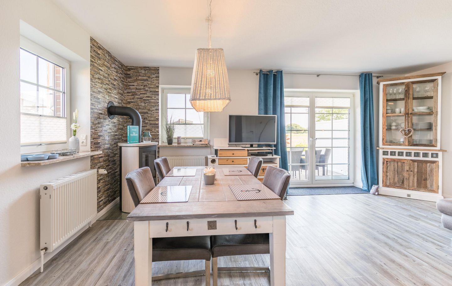 Schlafsofa, Couchtisch, Flachbild-Smart-TV, Esstische + Stühle, Zugang zur Terrasse mit Fliegenschutztür, Außenrollläden an den Fenstern, Kaminofen, Radio mit Bluetooth-Funktion