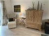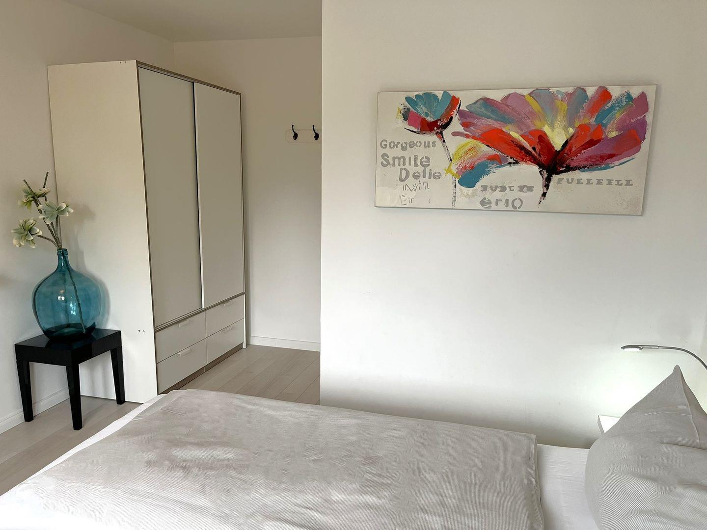 Ebenfalls im Erdgeschoss befindet sich auch eines der beiden Schlafzimmer, es ist mit einem Doppelbett (1,80x 2m, mit Einzelmatratzen), einem Kleiderschrank und einem TV- Gerät eingerichtet. Problemlos lässt sich hier ein Babybett dazu stellen.