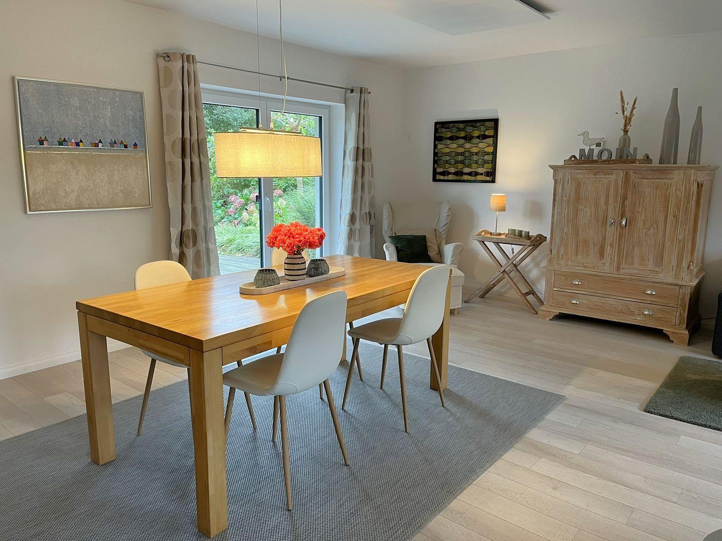 In dem geräumigen Wohn- Essbereich bemerkt man sofort, das jedes einzelne Stück mit Liebe ausgesucht wurde. Ob man es sich auf der Wohnlandschaft, bei einem Film oder einem Buch, gemütlich macht oder ob man sich um den Esstisch versammelt, um in aller Ruhe zu klönen. Das ganze Haus wird mit Infrarot Heizkörpern an den Wänden beheizt. Bei nicht so schönem Wetter können Sie den Kaminofen anfeuern. Einfach Gemütlichkeit pur.