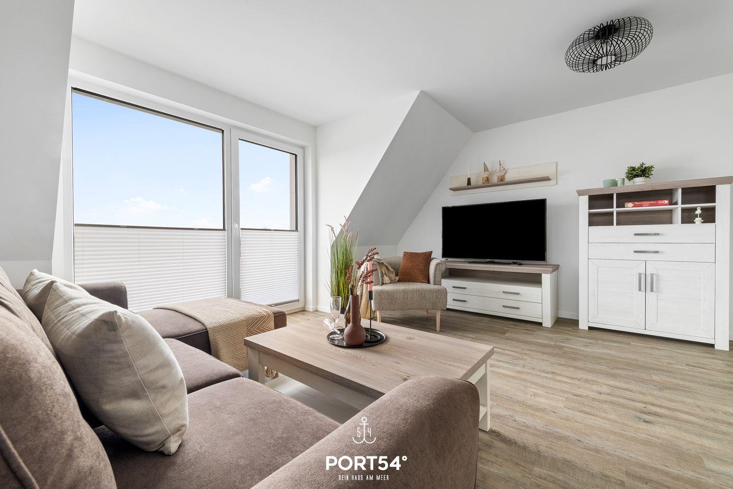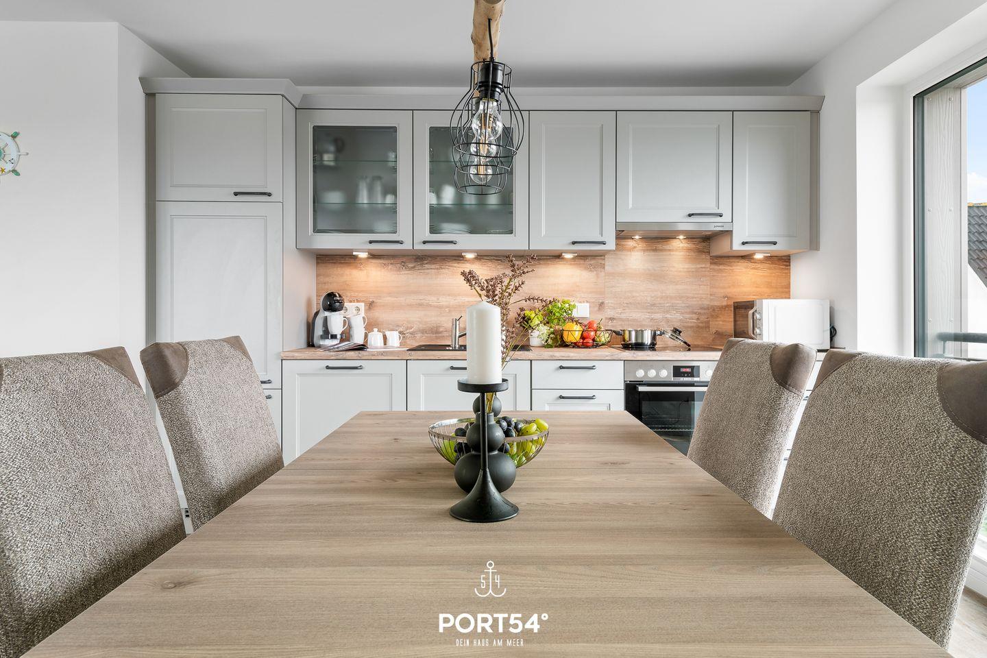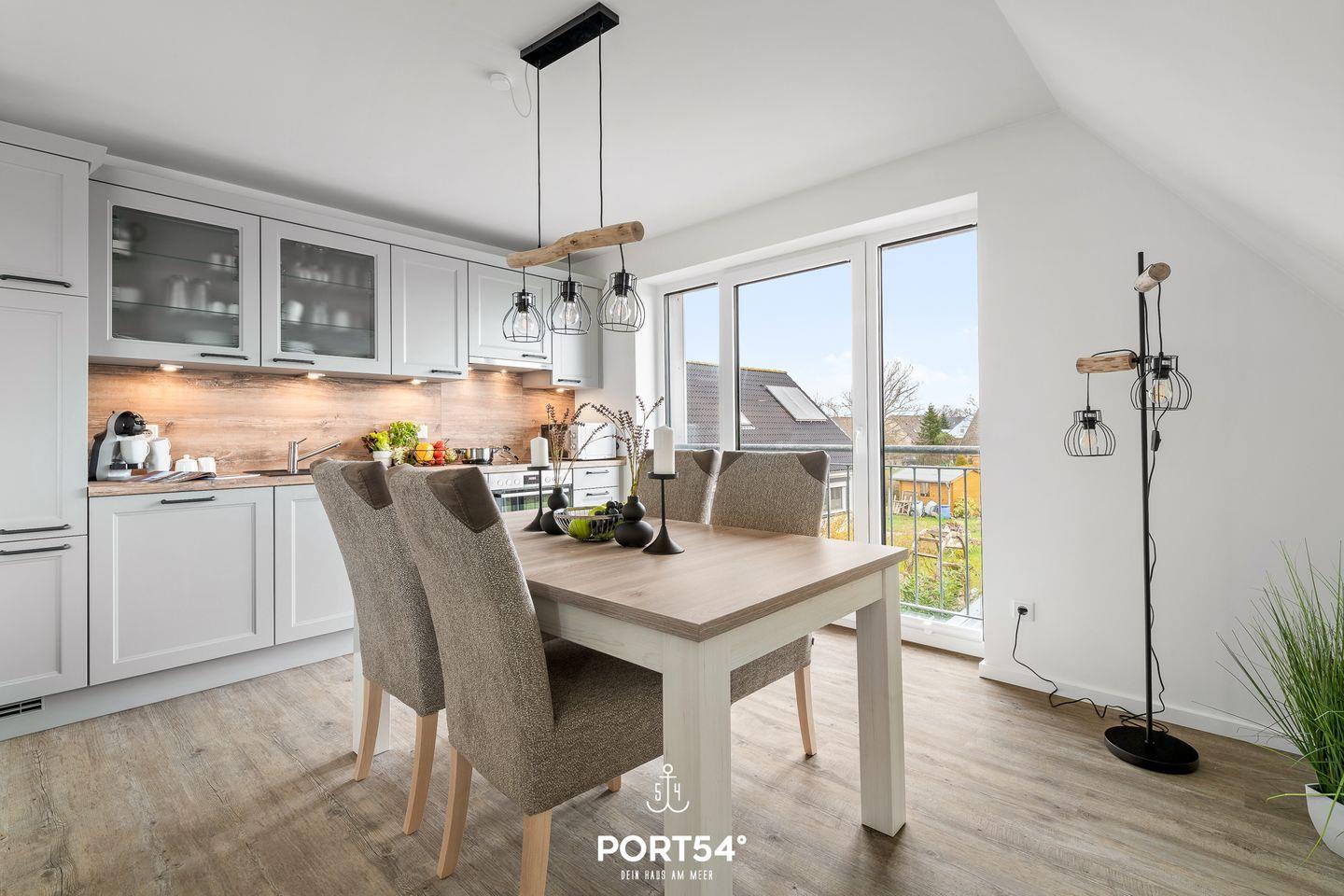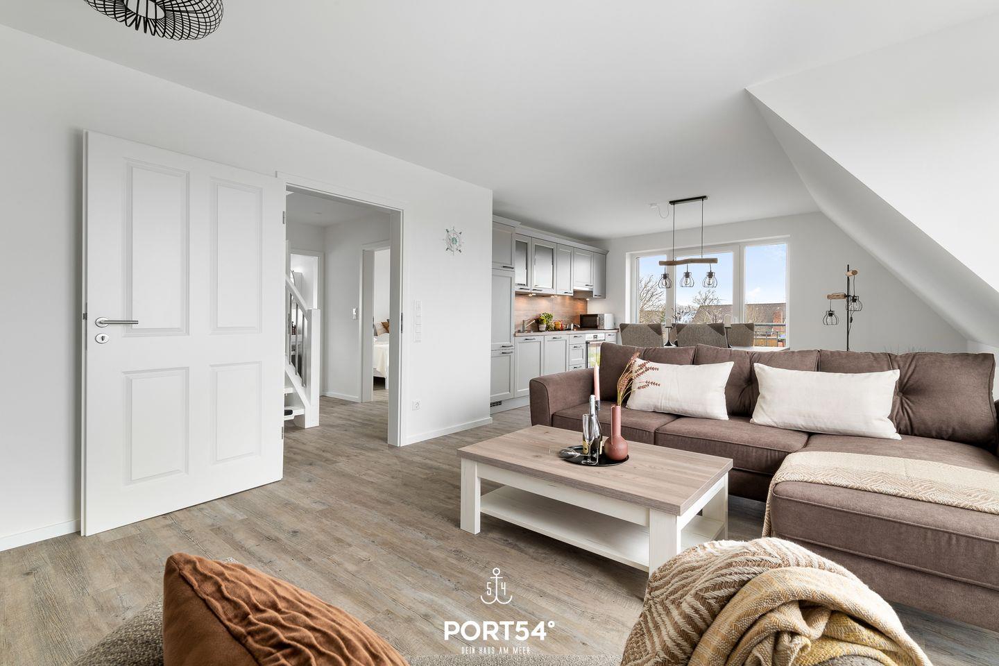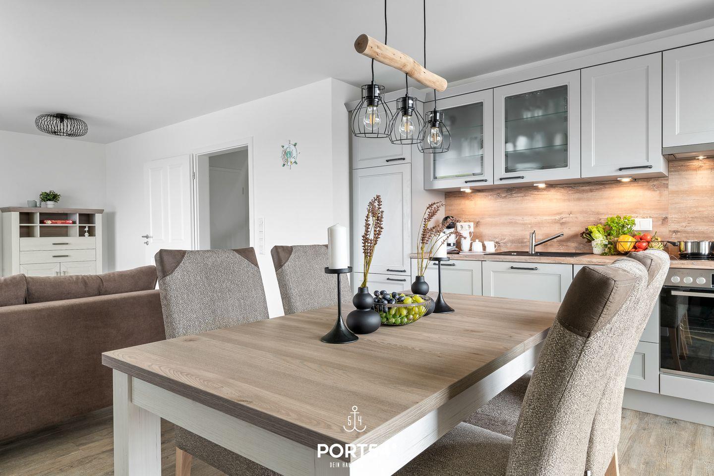 In gehobener und exklusiver Holzständerwerk-Bauweise erwartet Sie die im Dachgeschoss und Spitzboden gelegene Ferienwohnung "Küste 3" auf etwa 85m². Der lichtdurchflutete Wohnbereich ist mit einer gemütlichen Wohnlandschaft inklusive Schlaffunktion (250x160cm) und einem Flachbildfernseher ausgestattet. Die angrenzende Küche ist offen gestaltet und bietet alle Annehmlichkeiten, die für einen geselligen Kochabend benötigt