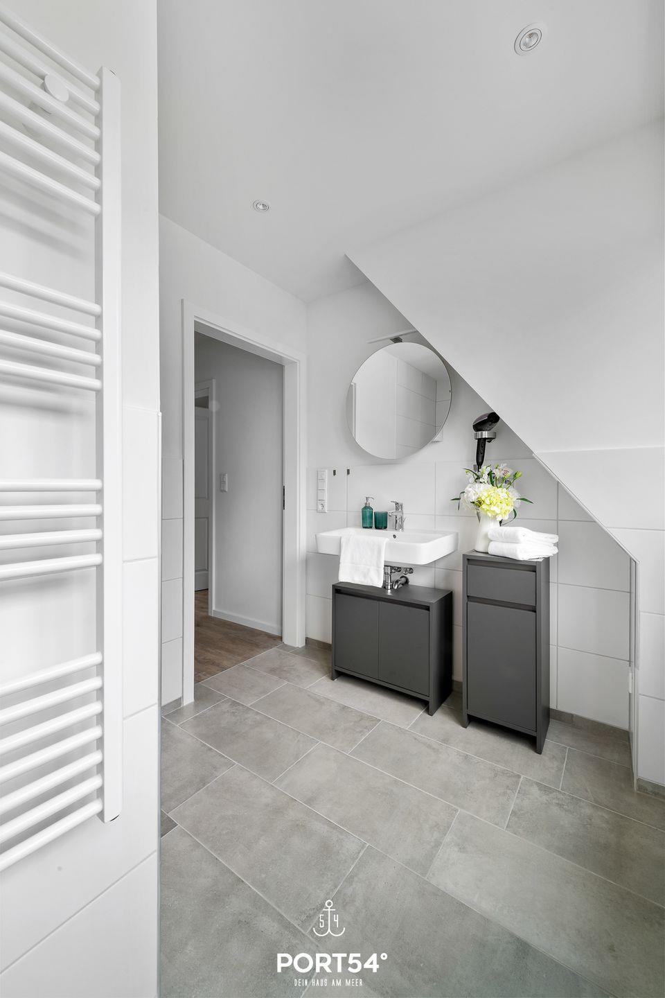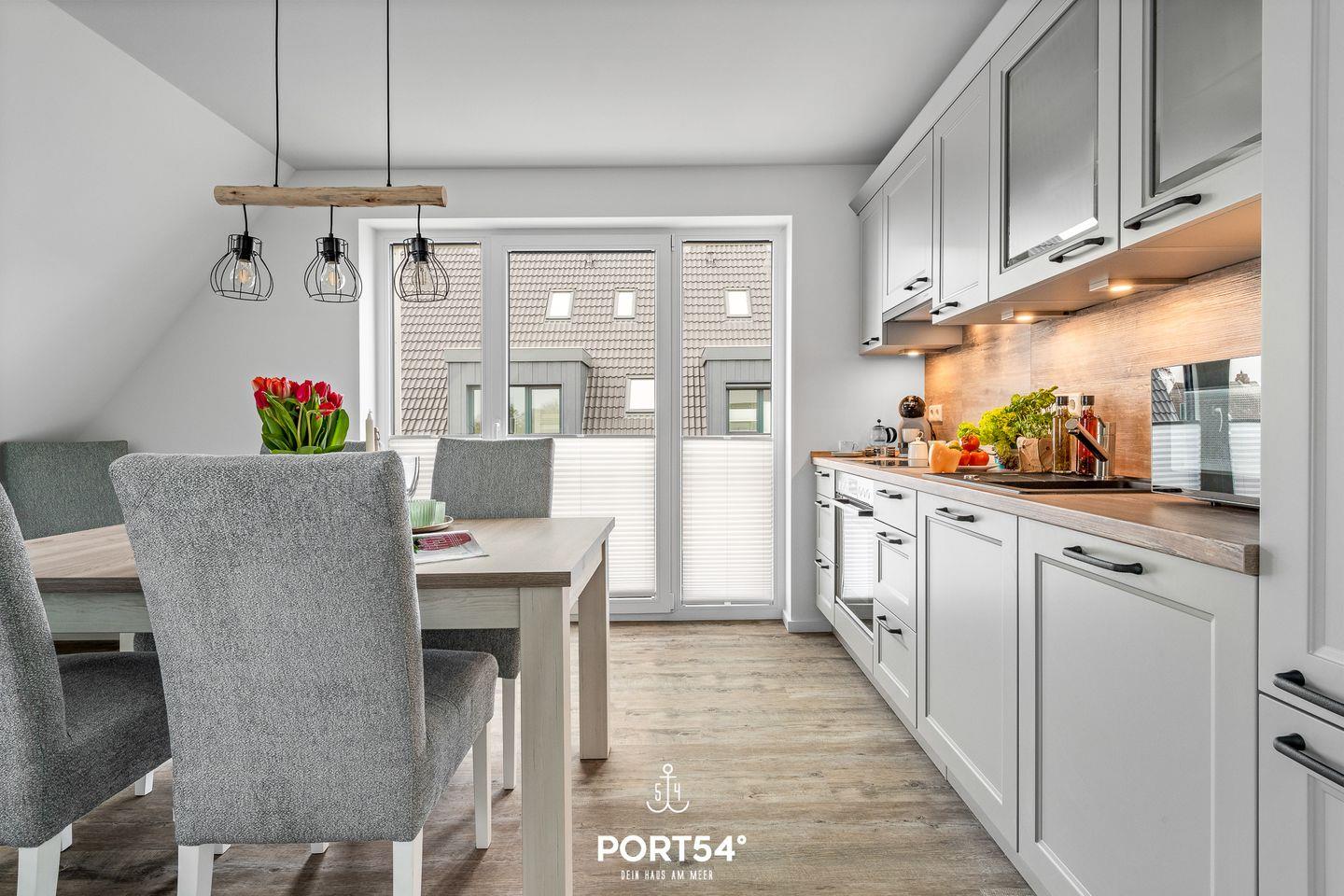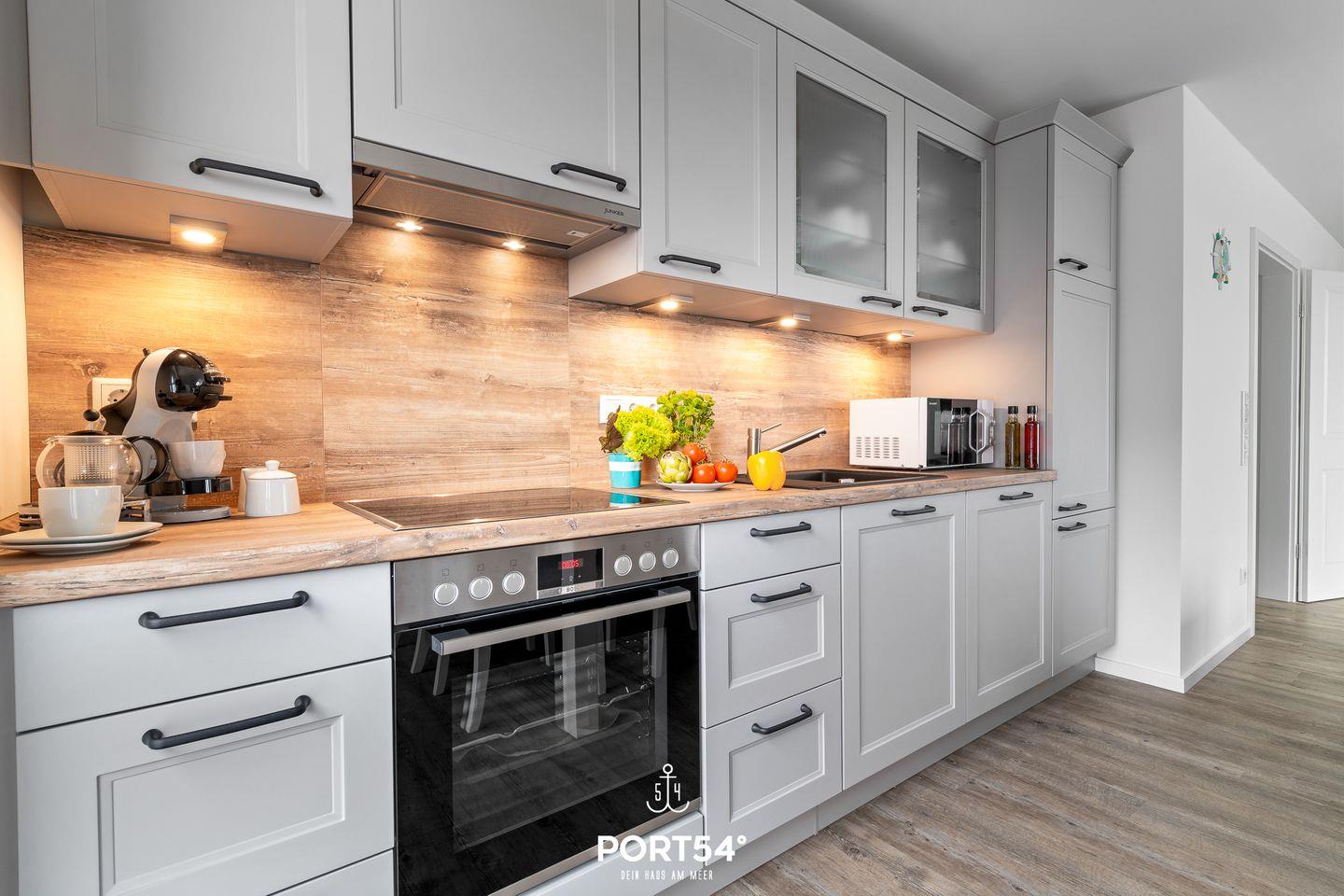 In gehobener und exklusiver Holzständerwerk-Bauweise erwartet Sie die im Dachgeschoss und Spitzboden gelegene Ferienwohnung "Küste 4" auf etwa 85m². Der lichtdurchflutete Wohnbereich ist mit einer gemütlichen Wohnlandschaft inklusive Schlaffunktion (240x135cm) und einem Flachbild-TV ausgestattet. Die angrenzende Küche ist offen gestaltet und bietet alle Annehmlichkeiten, die für einen geselligen Kochabend benötigt werden. Am Esstisch mit gemütlichen Stühlen können Sie bequem gemeinsam essen oder einen Spieleabend verbringen. Bodentiefe Fenster ermöglichen den Ausblick in die Natur. Von hier aus gelangen Sie zum vollmöblierten Balkon. In einem der beiden Schlafzimmer erwartet Sie ein großes Doppelbett (180x200cm), sowie verdunkelbare Fenster. Das andere Schlafzimmer befindet sich im ausgebauten Spitzboden und bietet ein Doppelbett (160x200cm) und einen weiteren Flachbild-TV fürs nächtliche Entertainment und Verdunkelungsmöglichkeiten für erholsame Nächte. Das Badezimmer ist mit einer ebenerdigen Dusche, einem WC sowie einem Waschbecken ausgestattet. Im Spitzboden ist ein weiteres Bad mit einem WC sowie einem Waschbecken untergebracht.