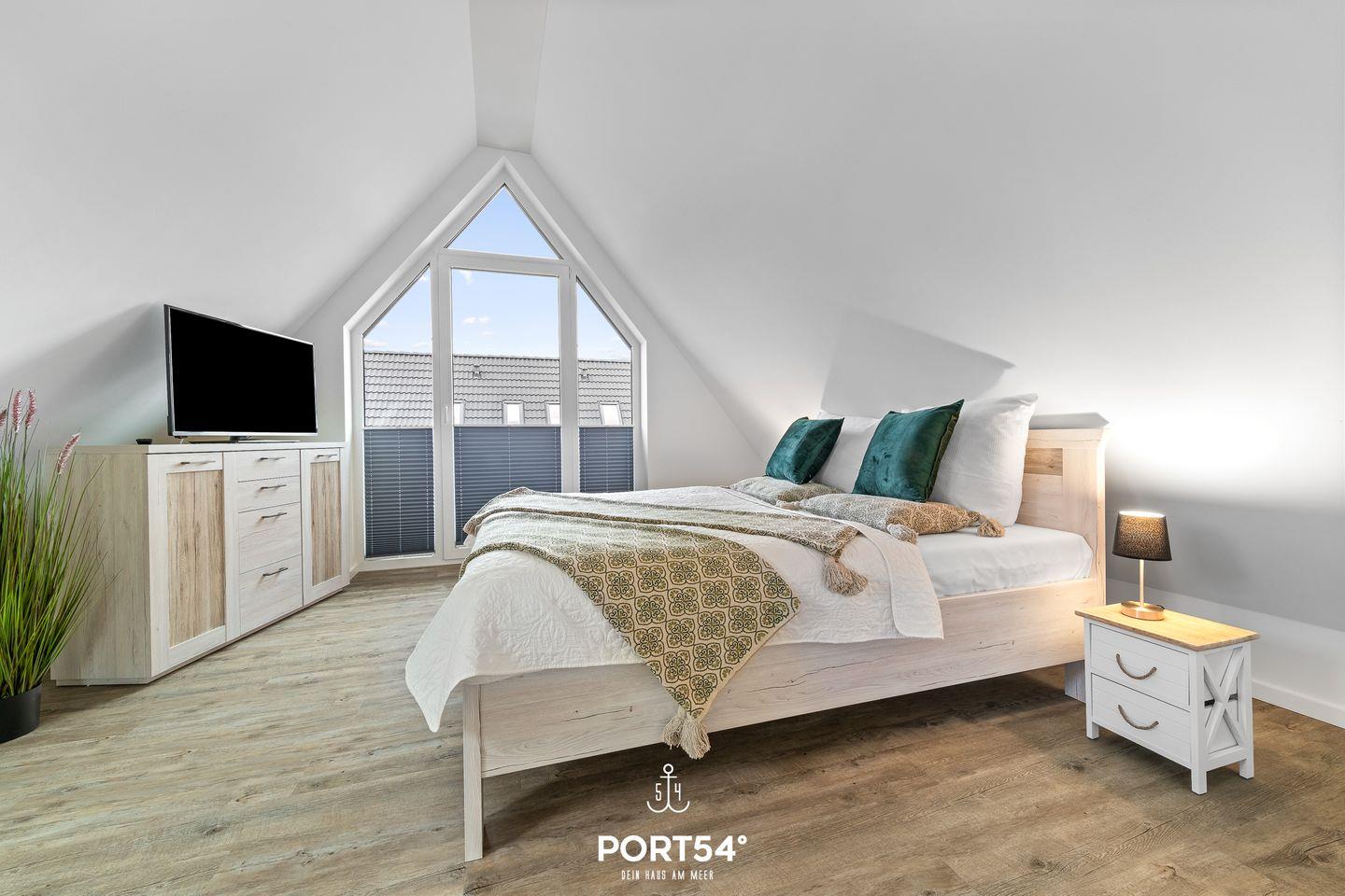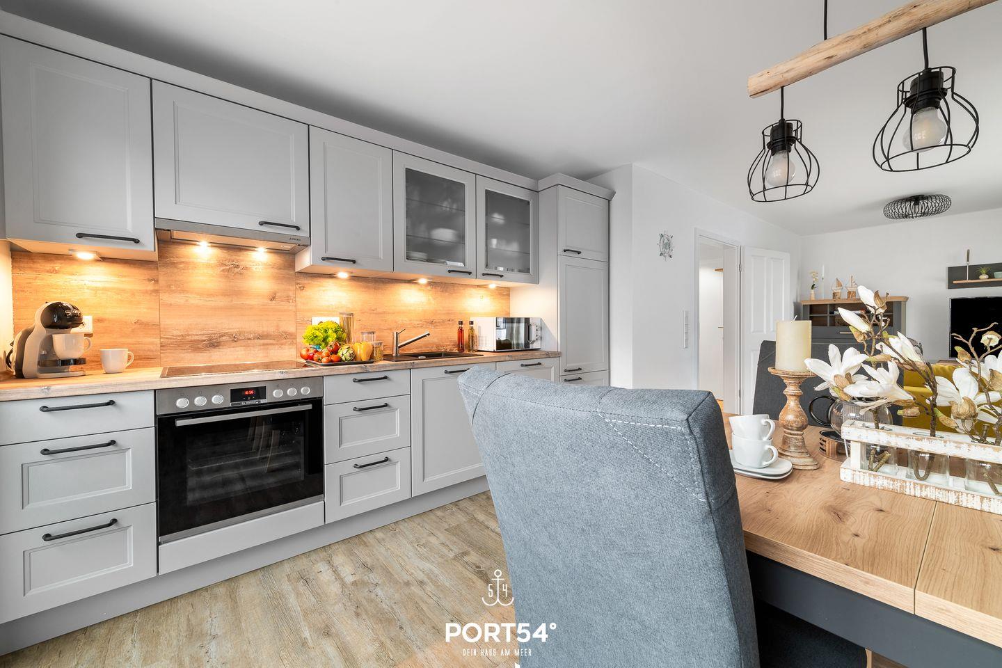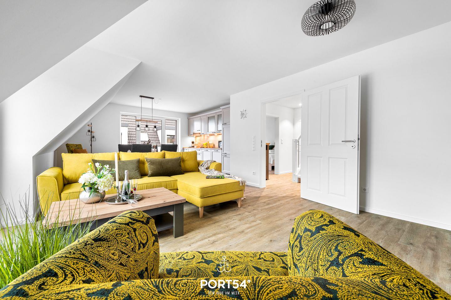 In gehobener und exklusiver Holzständerwerk-Bauweise erwartet Sie die im Dachgeschoss und Spitzboden gelegene Ferienwohnung "Küste 8" auf etwa 85m². Der lichtdurchflutete Wohnbereich ist mit einer gemütlichen Wohnlandschaft inklusive Schlaffunktion (250x160cm) und einem Flachbild-TV ausgestattet. Die angrenzende Küche ist offen gestaltet und bietet alle Annehmlichkeiten, die für einen geselligen Kochabend benötigt werden. Am Esstisch mit gemütlichen Stühlen können Sie bequem gemeinsam essen oder einen Spieleabend verbringen. Bodentiefe Fenster lassen viel Licht herein und ermöglichen den Zutritt zum vollmöblierten Balkon. In einem der beiden Schlafzimmer erwartet Sie ein großes Doppelbett (180x200cm), sowie verdunkelbare Fenster. Das andere Schlafzimmer befindet sich im ausgebauten Spitzboden und bietet ein Doppelbett (160x200cm) und einen weiteren Flachbild-TV fürs nächtliche Entertainment und Verdunkelungsmöglichkeiten für erholsame Nächte. Das Badezimmer ist mit einer ebenerdigen Dusche, einem WC sowie einem Waschbecken ausgestattet. Im Spitzboden befindet sich ein Gäste Bad mit WC und Waschbecken. Mitgebrachte Fahrräder können im Fahrradschuppen untergestellt werden.