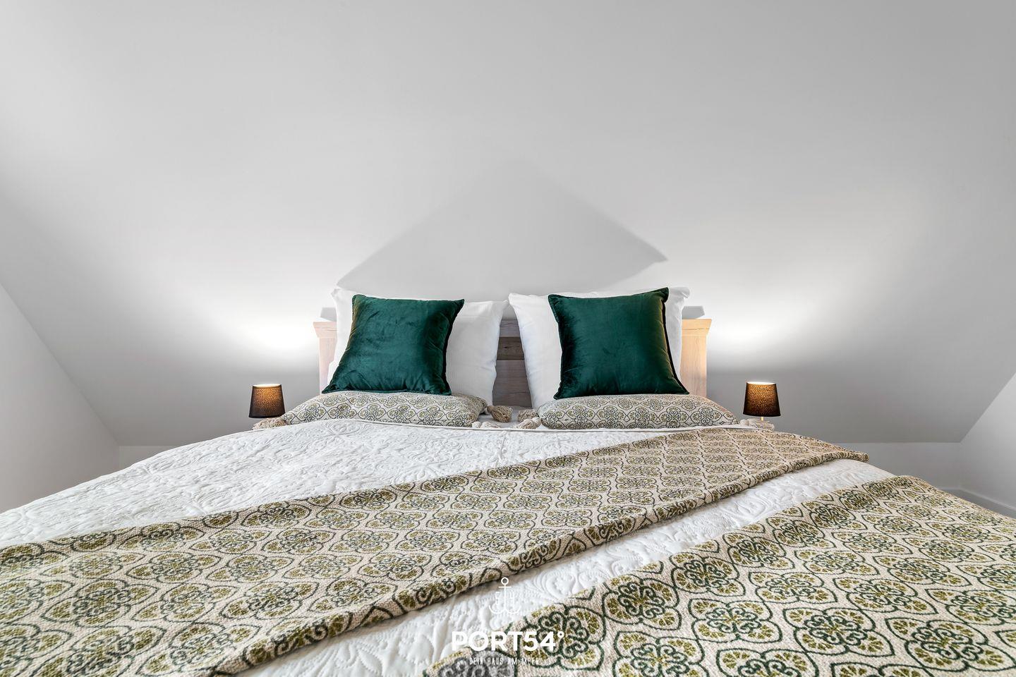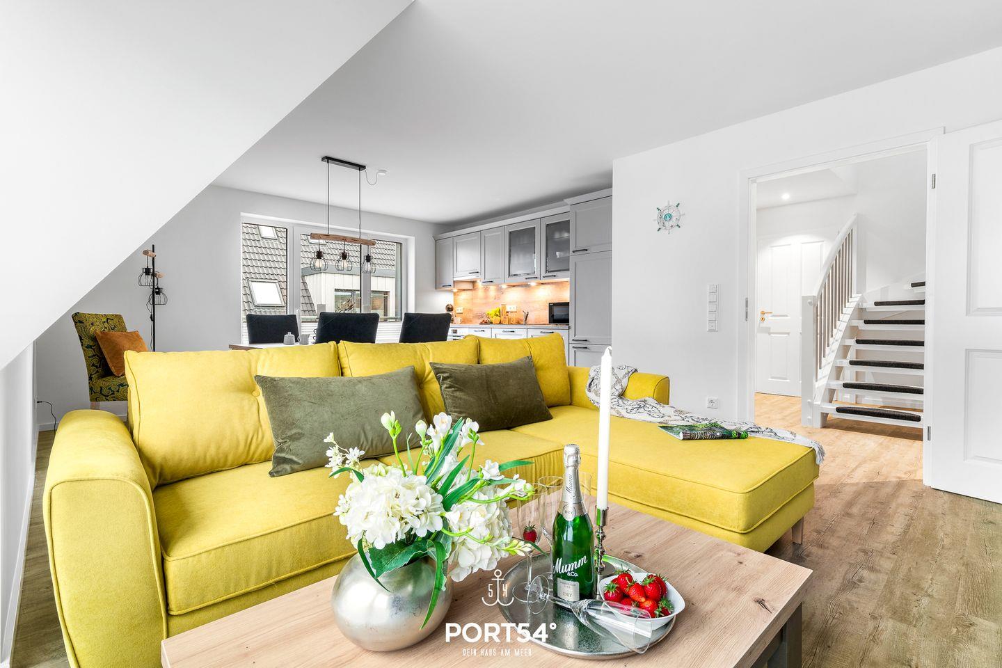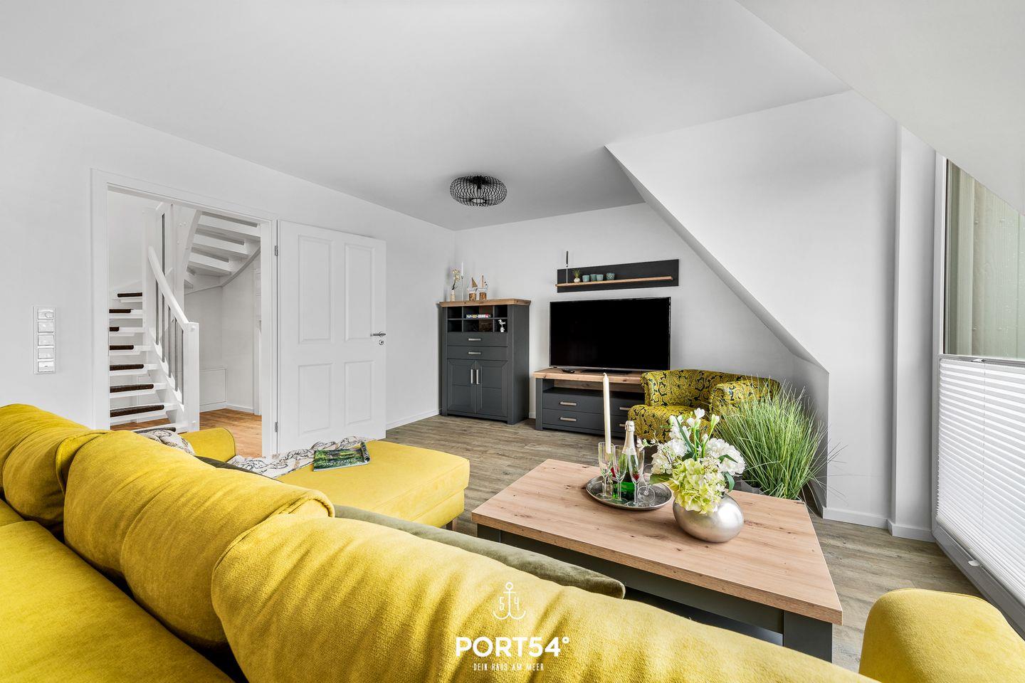 In gehobener und exklusiver Holzständerwerk-Bauweise erwartet Sie die im Dachgeschoss und Spitzboden gelegene Ferienwohnung "Küste 8" auf etwa 85m². Der lichtdurchflutete Wohnbereich ist mit einer gemütlichen Wohnlandschaft inklusive Schlaffunktion (250x160cm) und einem Flachbild-TV ausgestattet. Die angrenzende Küche ist offen gestaltet und bietet alle Annehmlichkeiten, die für einen geselligen Kochabend benötigt werden. Am Esstisch mit gemütlichen Stühlen können Sie bequem gemeinsam essen oder einen Spieleabend verbringen. Bodentiefe Fenster lassen viel Licht herein und ermöglichen den Zutritt zum vollmöblierten Balkon. In einem der beiden Schlafzimmer erwartet Sie ein großes Doppelbett (180x200cm), sowie verdunkelbare Fenster. Das andere Schlafzimmer befindet sich im ausgebauten Spitzboden und bietet ein Doppelbett (160x200cm) und einen weiteren Flachbild-TV fürs nächtliche Entertainment und Verdunkelungsmöglichkeiten für erholsame Nächte. Das Badezimmer ist mit einer ebenerdigen Dusche, einem WC sowie einem Waschbecken ausgestattet. Im Spitzboden befindet sich ein Gäste Bad mit WC und Waschbecken. Mitgebrachte Fahrräder können im Fahrradschuppen untergestellt werden.