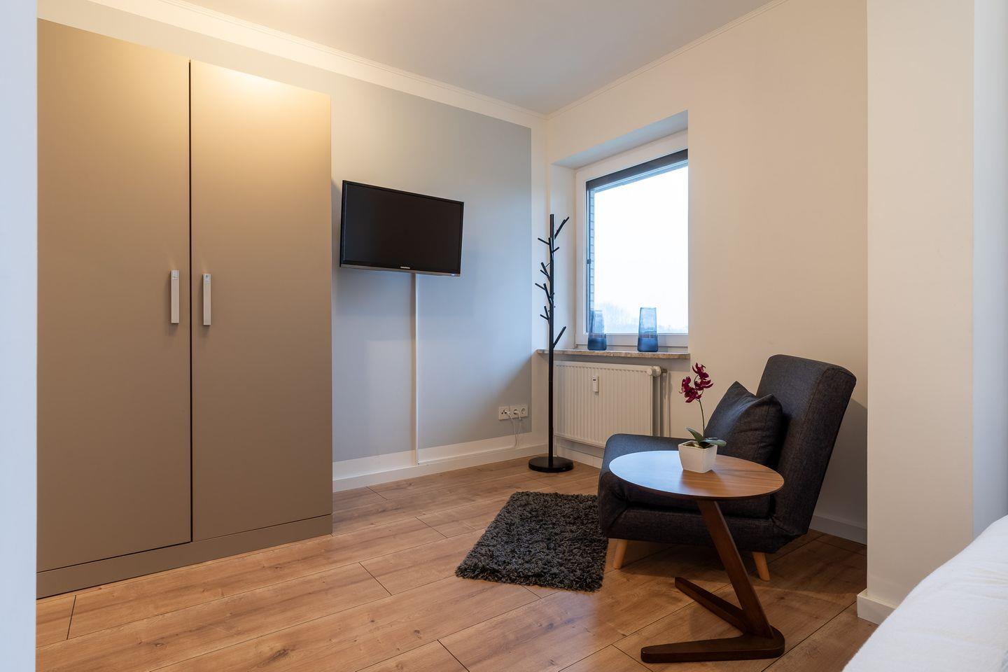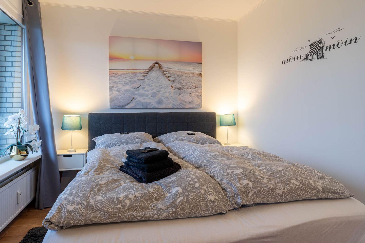 Das separate Schlafzimmer ist mit einem komfortablen Boxspringbett (160 x 200 cm) ausgestattet und bietet eine ruhige Oase für erholsame Nächte. Dieses Apartment eignet sich ideal für 2 Personen, kann jedoch auch mit bis zu 4 Personen belegt werden, da eine Schlafcouch (140 x 200 cm) im Wohnzimmer zur Verfügung steht.