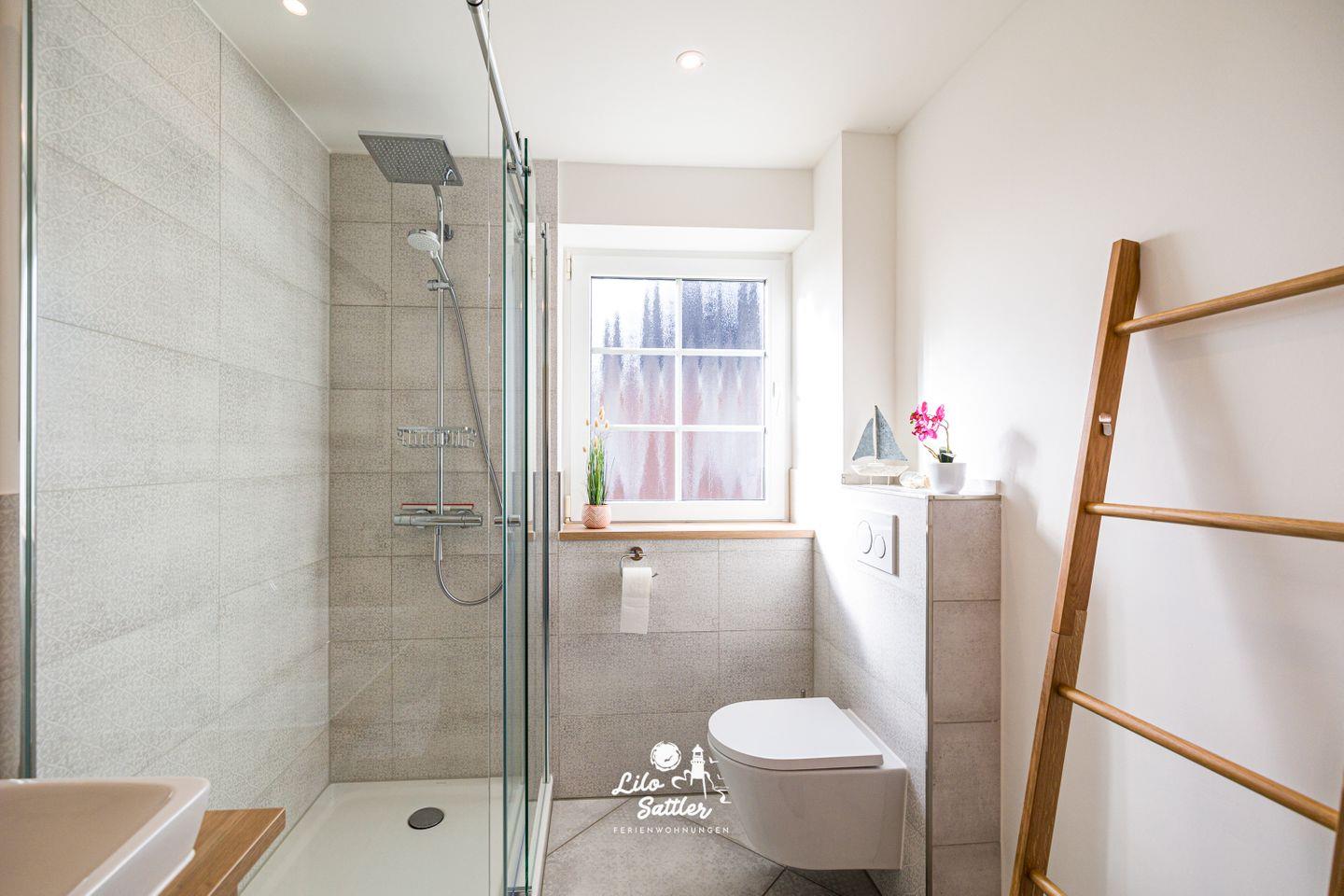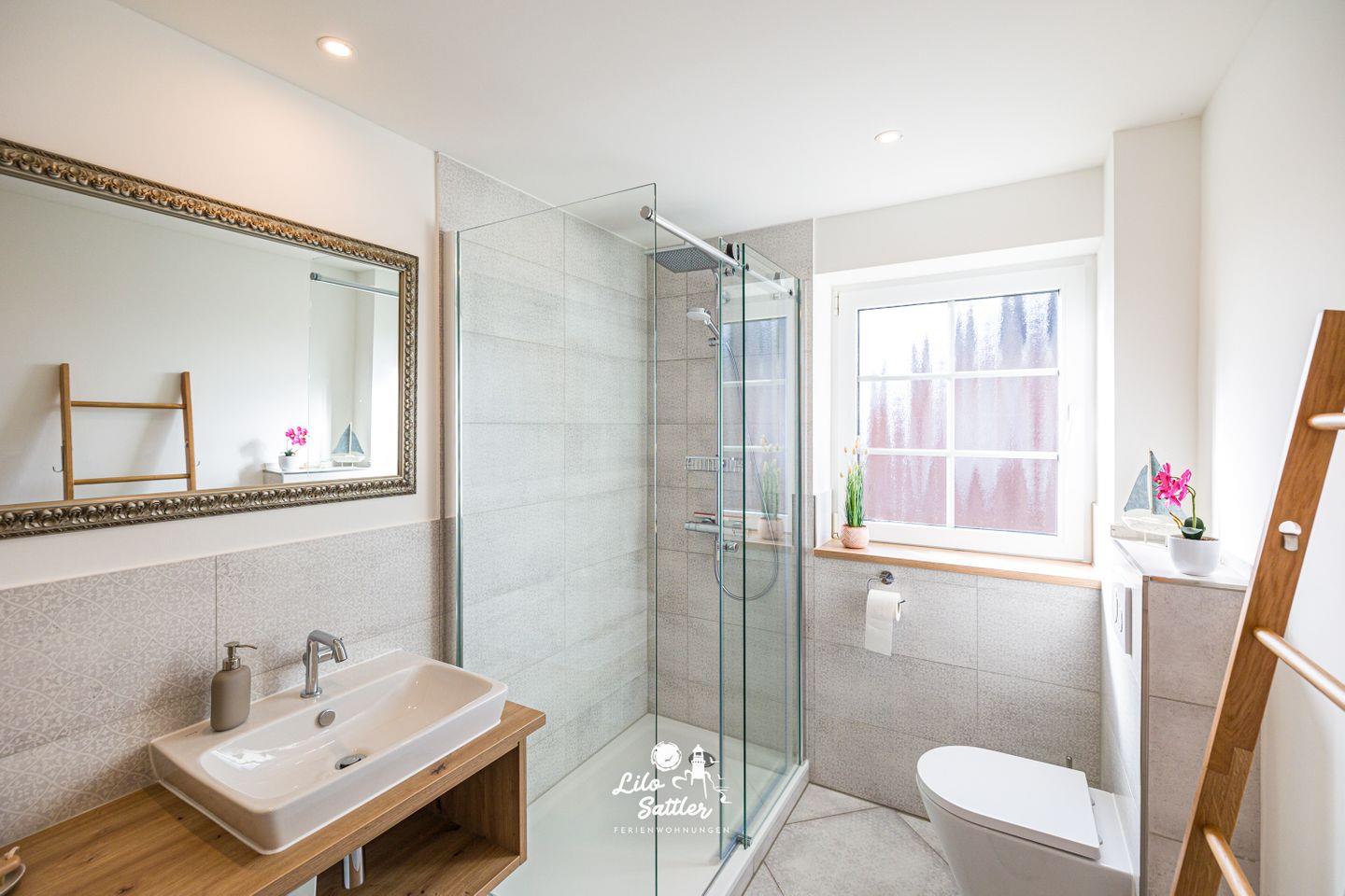 Dusche, WC, Waschbecken, Spiegel, Handtuchtrockner, Waschmaschine, Föhn, Fenster, Fliegengitter