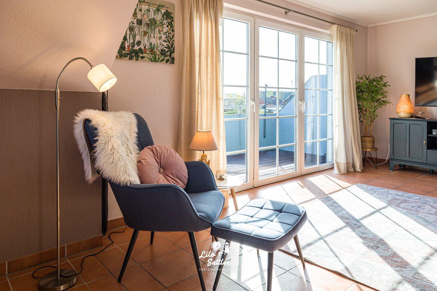 Sofa, Sessel, Hocker, Couchtisch, Leselampe, Flachbild-TV, Kommode, Regal, Radio, Zugang zum Balkon