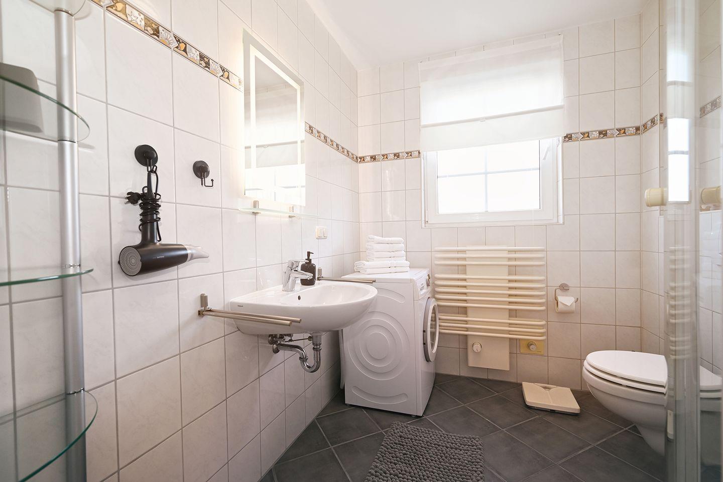 Das Badezimmer ist funktional eingerichtet und verfügt über eine Dusche, Spiegel, Fenster und Haartrockner. Die Ausstattung ist komplettiert durch eine eigene Waschmaschine und Wäscheständer die Gästen zur Alleinnutzung zur Verfügung stehen.