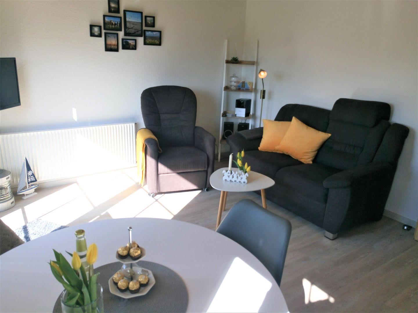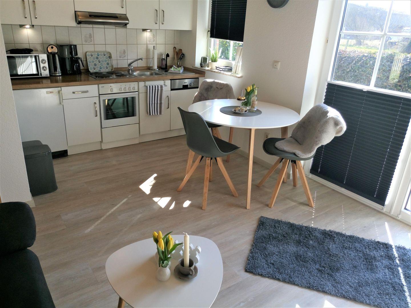 Der helle Wohnraum, der an die Terrasse anschließt, ist mit einer Couch und einem gemütlichen Fernsehsessel eingerichtet, so dass man es sich auch bei nicht so gutem Wetter bequem machen kann. Die Küchenzeile in dem Wohnraum ist komplett und gut ausgestattet. Ein Esstisch ist ebenfalls vorhanden, an dem Sie sich mit Köstlichkeiten aus der Region verwöhnen können.