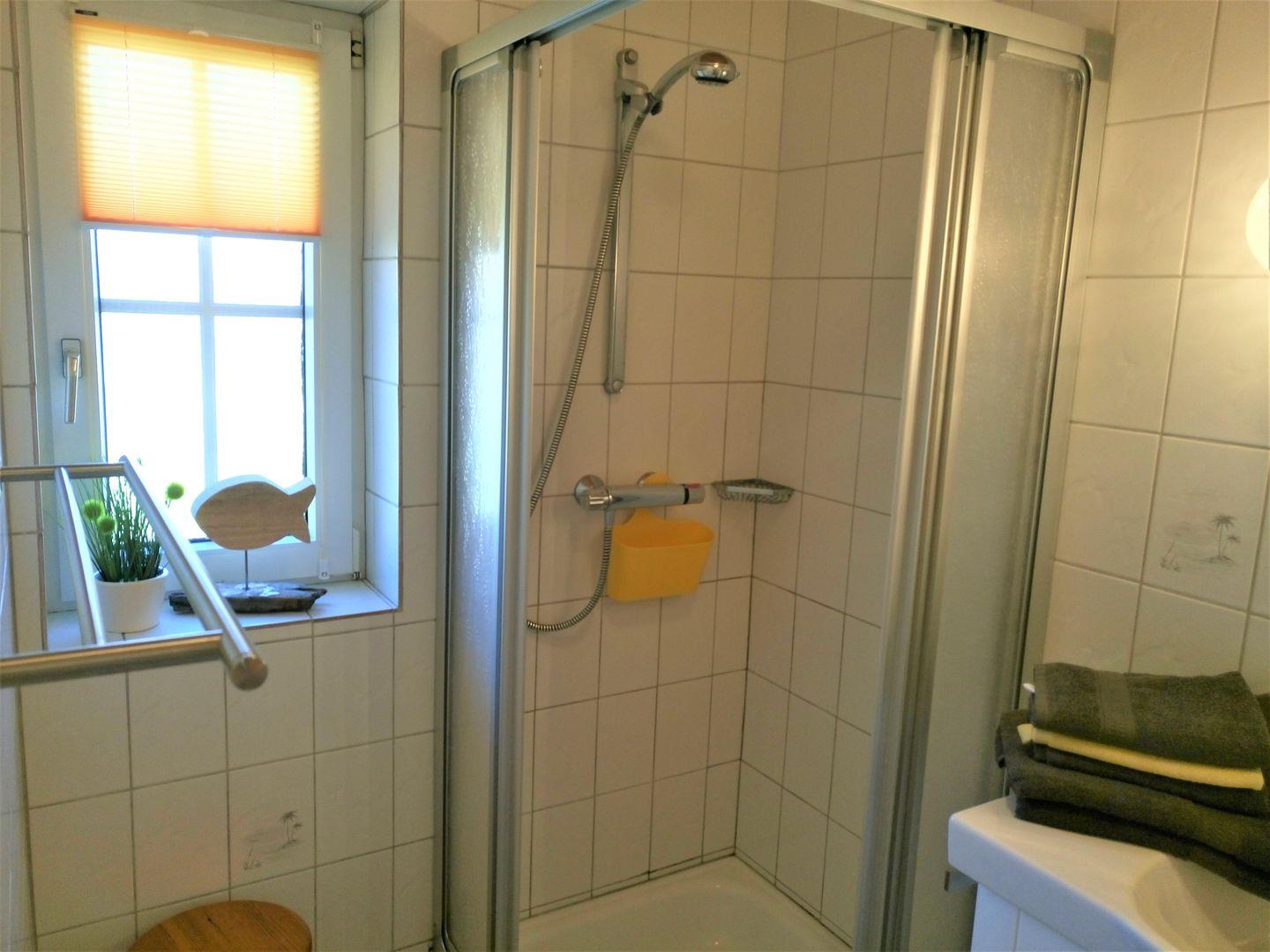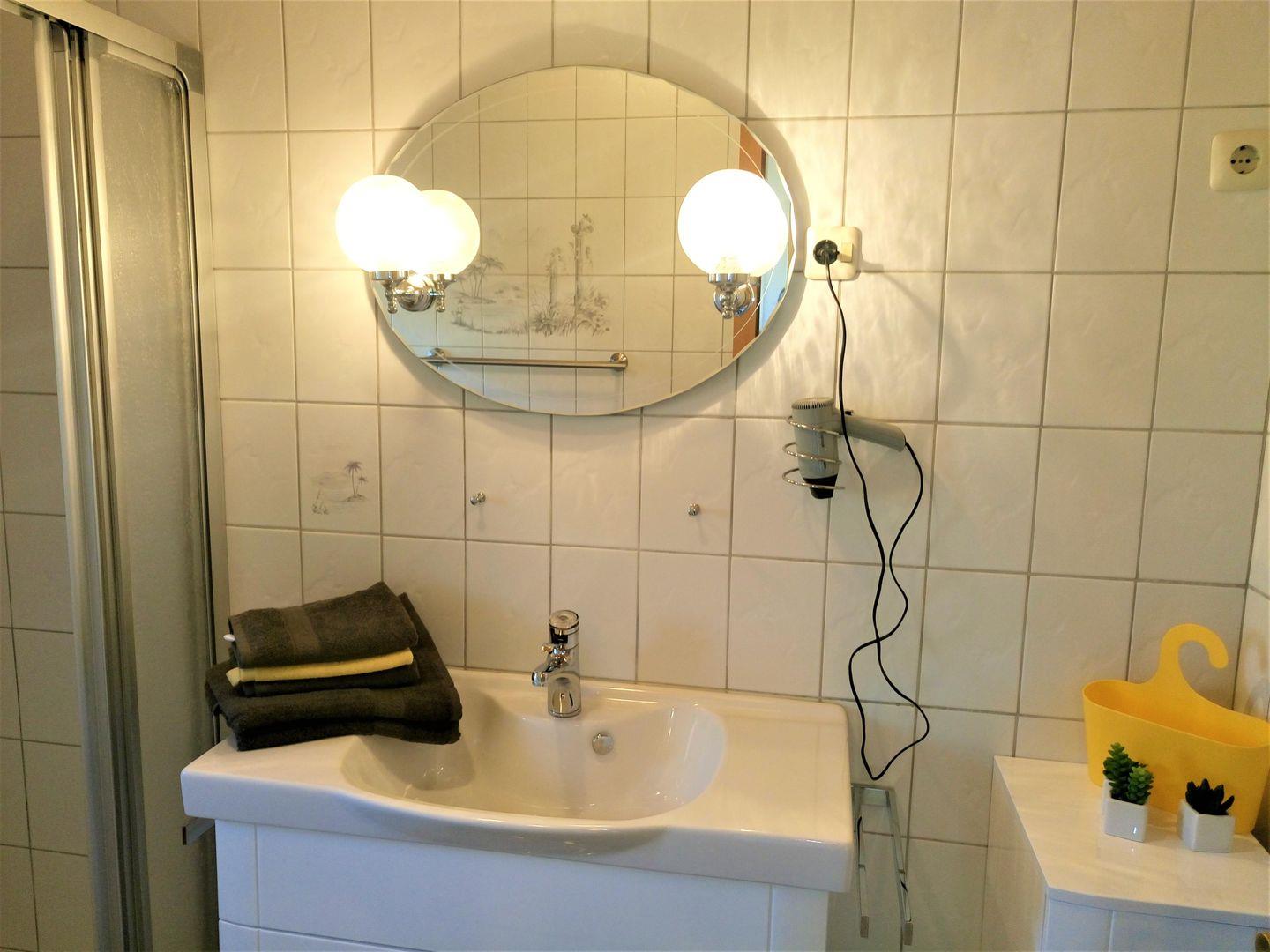 Das Bad ist zweigeteilt. Das eine Bad verfügt über eine Dusche und ein Waschbecken, in dem zweiten Bad befindet sich das WC und ein Waschbecken.