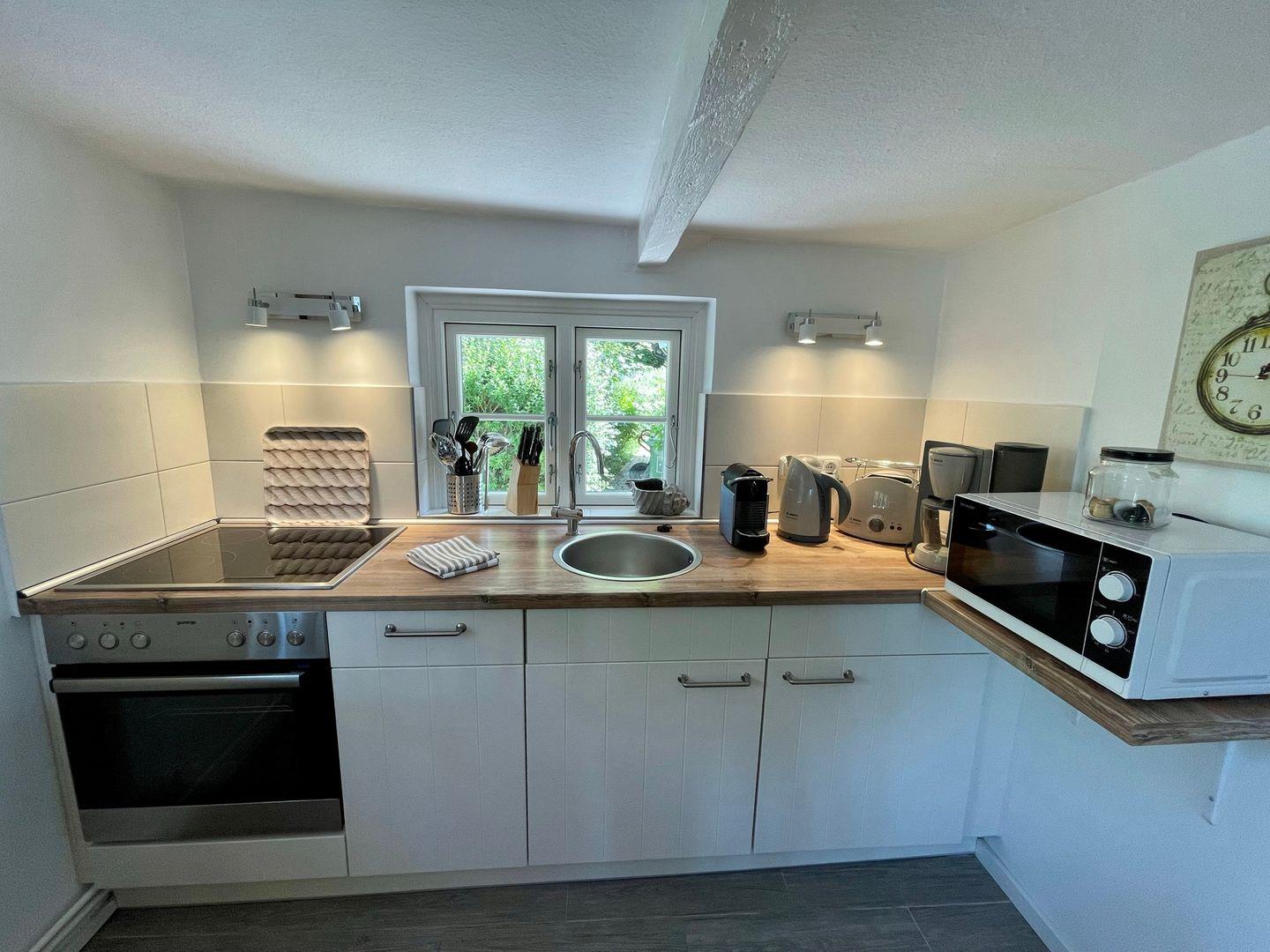Im Erdgeschoss befindet sich der gemütliche Wohn-, Küchen- und Essbereich, eine Geschirrspülmaschine gehört ebenso zur Küchenausstattung wie ein Cerankochfeld mit Backofen. Hier befindet sich auch der direkten Zugang zur großen Sonnenterrasse und zum Gartenbereich, der auch mit genutzt werden darf.