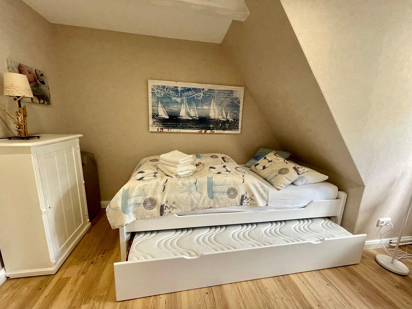 Im Dachgeschoss gibt es 2 Schlafzimmer. Das 1te Schlafzimmer ist mit einem Doppelbett (1,60x 2m), Kleiderschrank und TV- Gerät eingerichtet, es verfügt über ein Duschbad en suite. Das 2te Schlafzimmer ist mit einem Einzelbett eingerichtet, dass man durch herausziehen der unteren Matratze zu 2 Betten umwandeln kann.