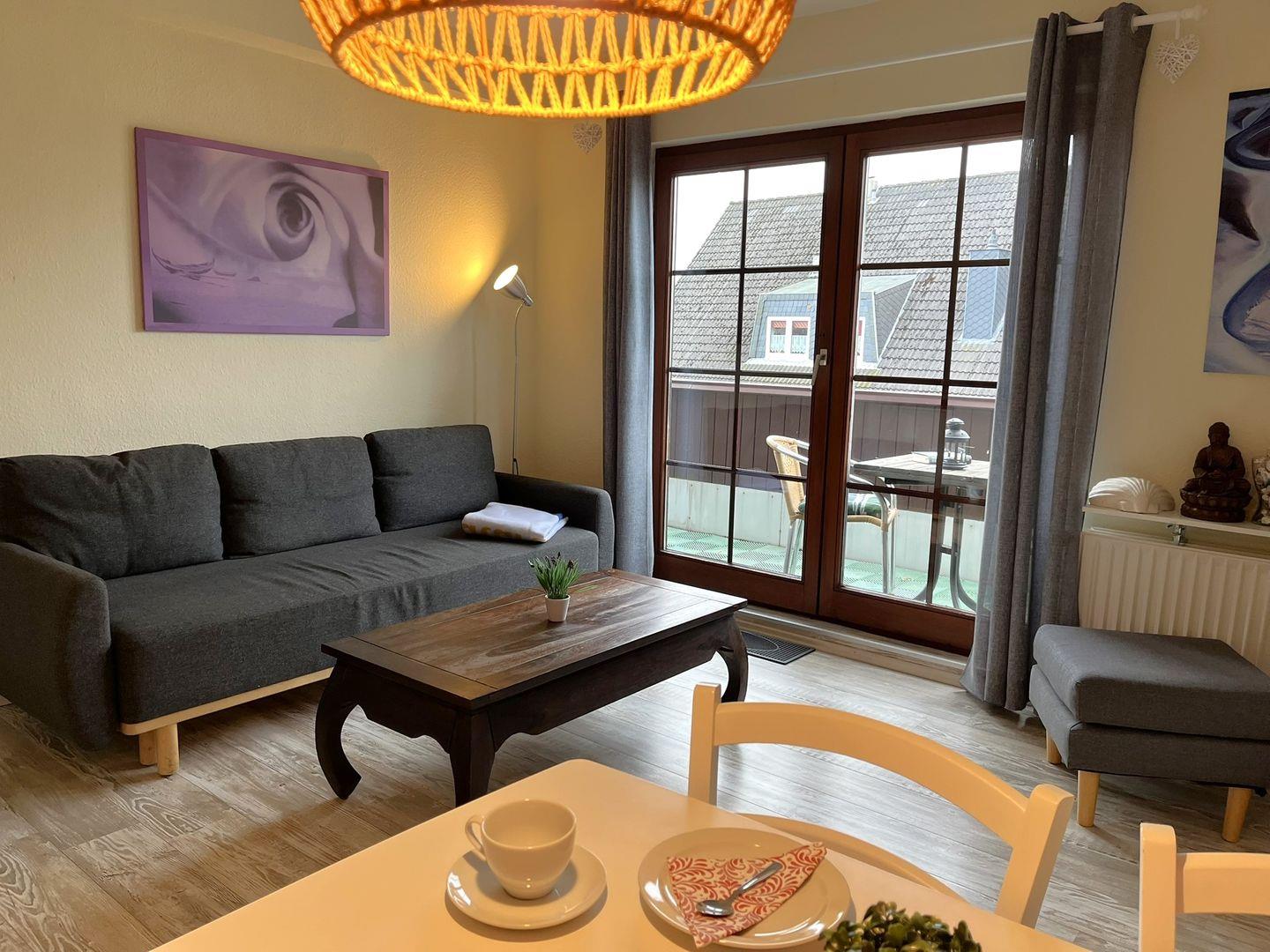 Die großzügige, gemütliche Sitzecke im Wohnzimmer lässt sich zu einer Schlafmöglichkeit umwandeln.